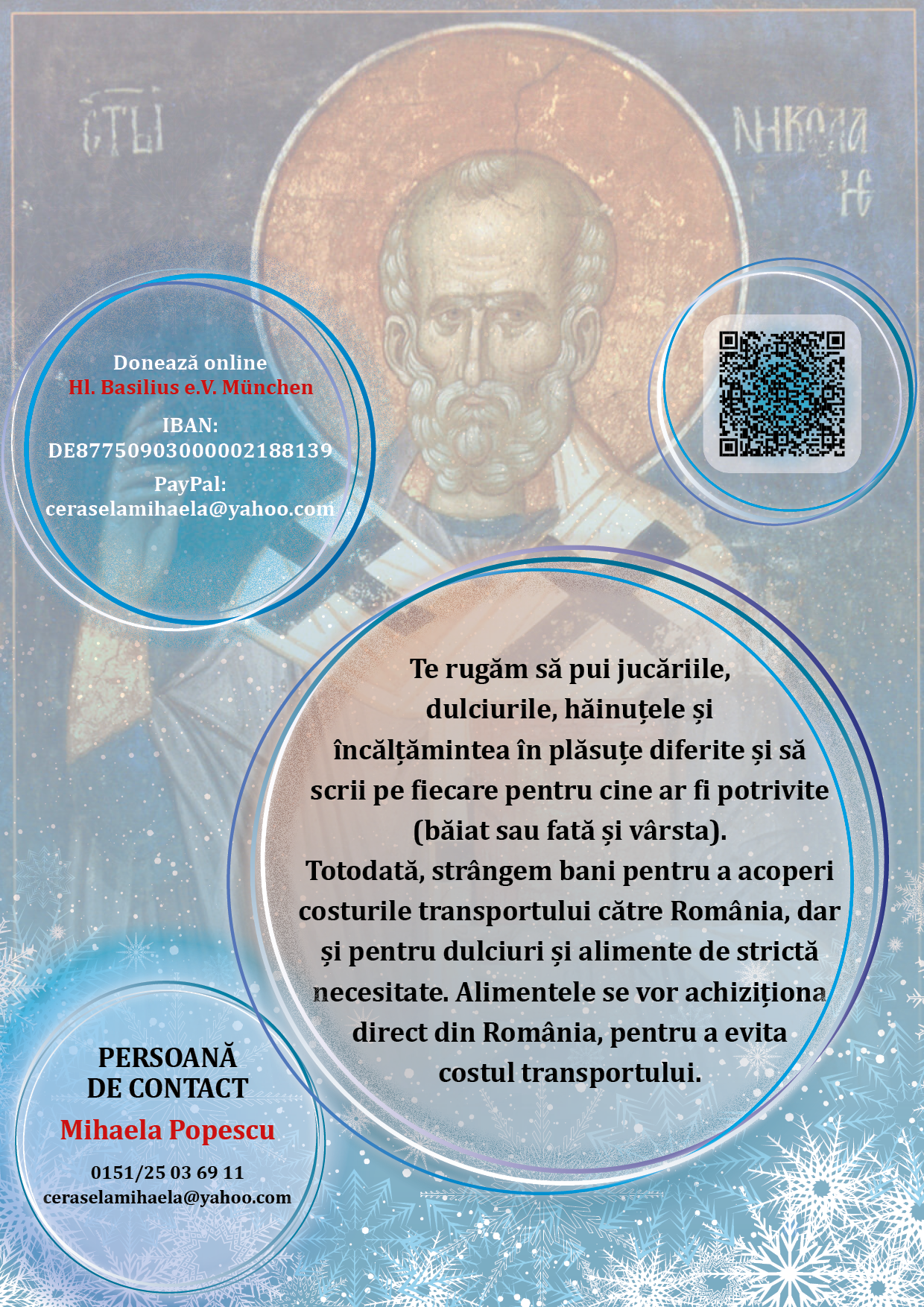 Cum. Donațiile se pot face la sediul Asociației caritative „Sfântul Vasile cel Mare” din München, pâna în data de 30 noiembrie 2022, în intervalul orar 18:00-19:00 (Luni, Miercuri-Sâmbătă) și 09:00-13:00 (Duminica). Adresa: Sala Crucilor, Kastelburgstr. 84-88, 81245 München. Sau prin paypal: Această adresă de email este protejată contra spambots. Trebuie să activați JavaScript pentru a o vedea.