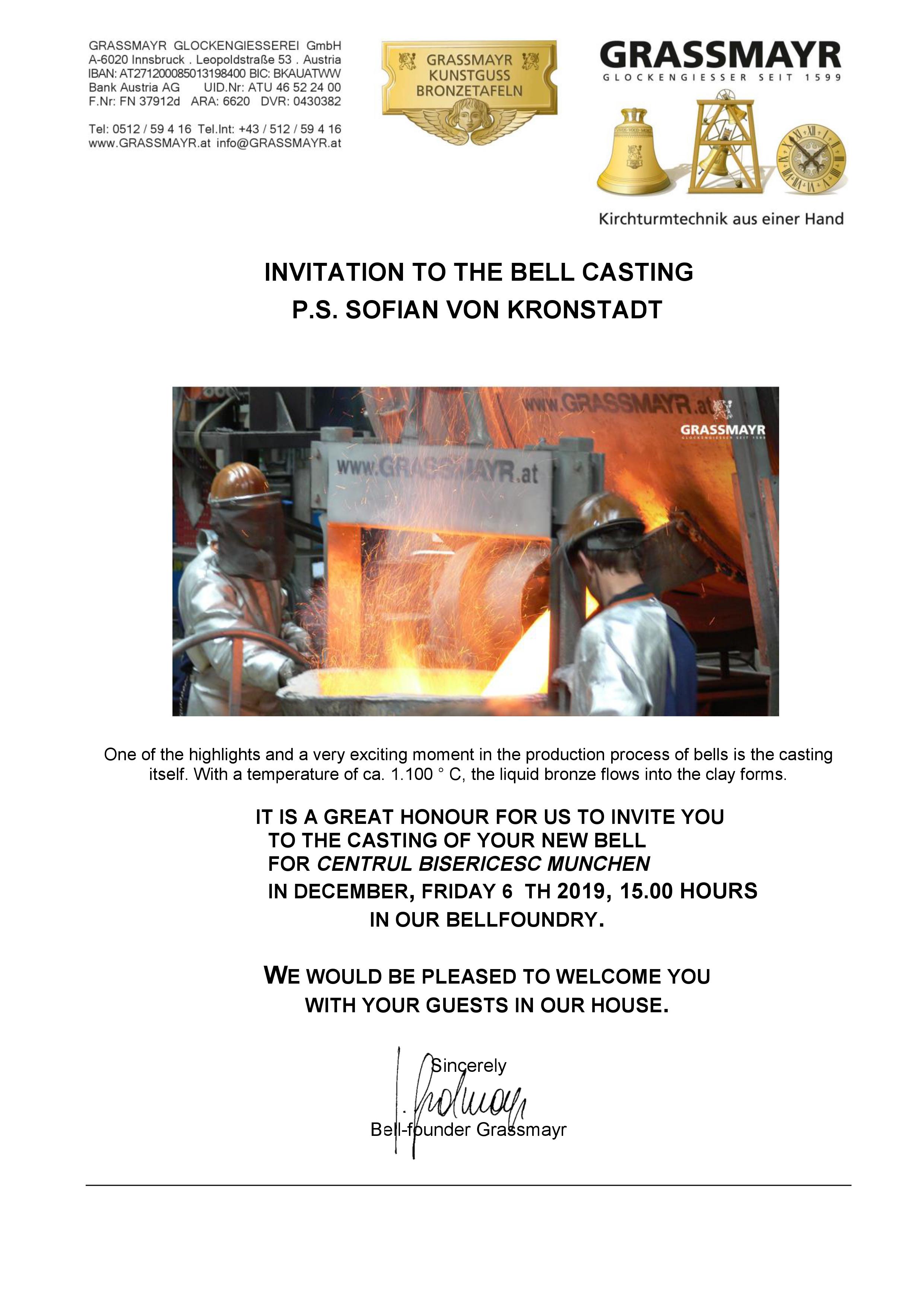 Cei care doresc să participe la acest eveniment excepţional sunt aşteptaţi la Grassmayr Glockengiesserei GmbH, A-6020 Innsbruck, Leopoldstr. 53, între orele 14:30-15:15. La orele 15:30 vom rosti o rugăciune de binecuvântare a lucrării de turnare a clopotelor şi, în continuare, timp de o oră vom asista la procedeul de turnare, primind explicaţii în legătură cu tehnica de lucru. După turnare, suntem invitaţi de fraţii Johannes si Peter Grassmayr la o scurtă recepţie, după care vom avea prilejul să vizităm turnătoria veche, ghidaţi de dl. Johannes Grassmayr. Înainte de plecare, cei care doresc vor putea achiziţiona clopoţei sau alte suveniruri din magazinul turnătoriei.