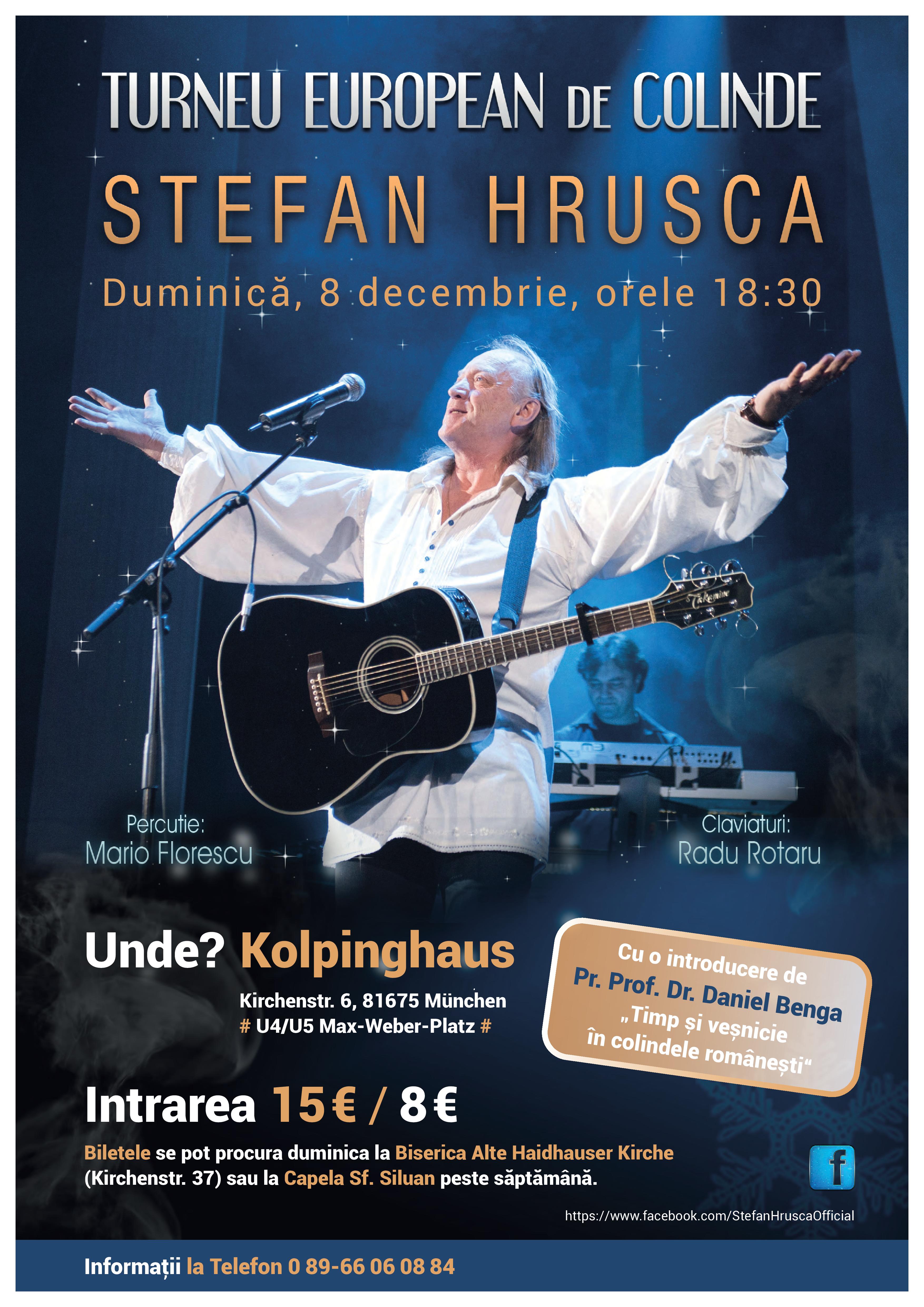 Concertul va avea loc la sala „Kolpinghaus” (Kirchenstr. 6, 81675 München, U4/U5 Max-Weber-Platz), la orele 18:30. El va fi precedat de o introducere în rostul şi teologia colindelor, susţinută de Prof. Pr. Dr. Daniel Benga, cu titlul „Timp și veșnicie în colindele românești”.