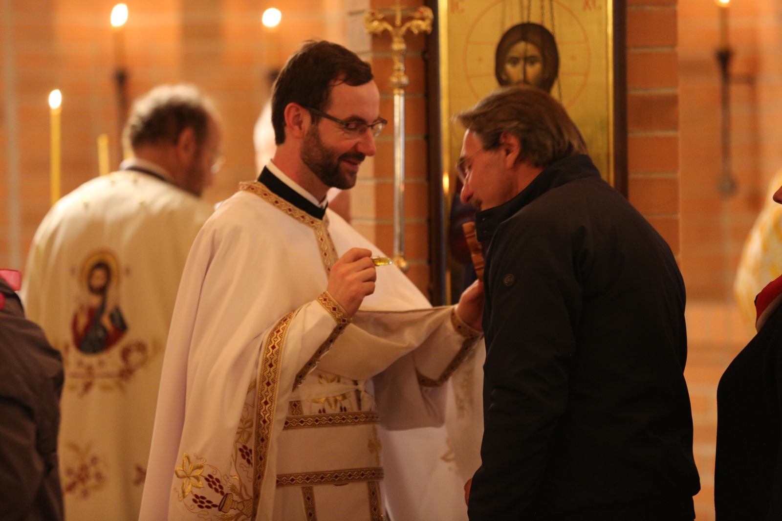 Ne-am bucurat de prezenţa la această Sf. Liturghie, în mijlocul comunităţii noastre, atât a rudelor părintelui George, a unor credincioşi din parohia Waldkraiburg, unde el a activat mai multă vreme ca şi cântăreţ bisericesc, în frunte cu părintele paroh de acolo Ioan Marius Turcu, a altor părinţi invitaţi, cât şi a profesorului de Noul Testament Dr. Loren Stuckenbruck, îndrumătorul de doctorat al părintelui George.