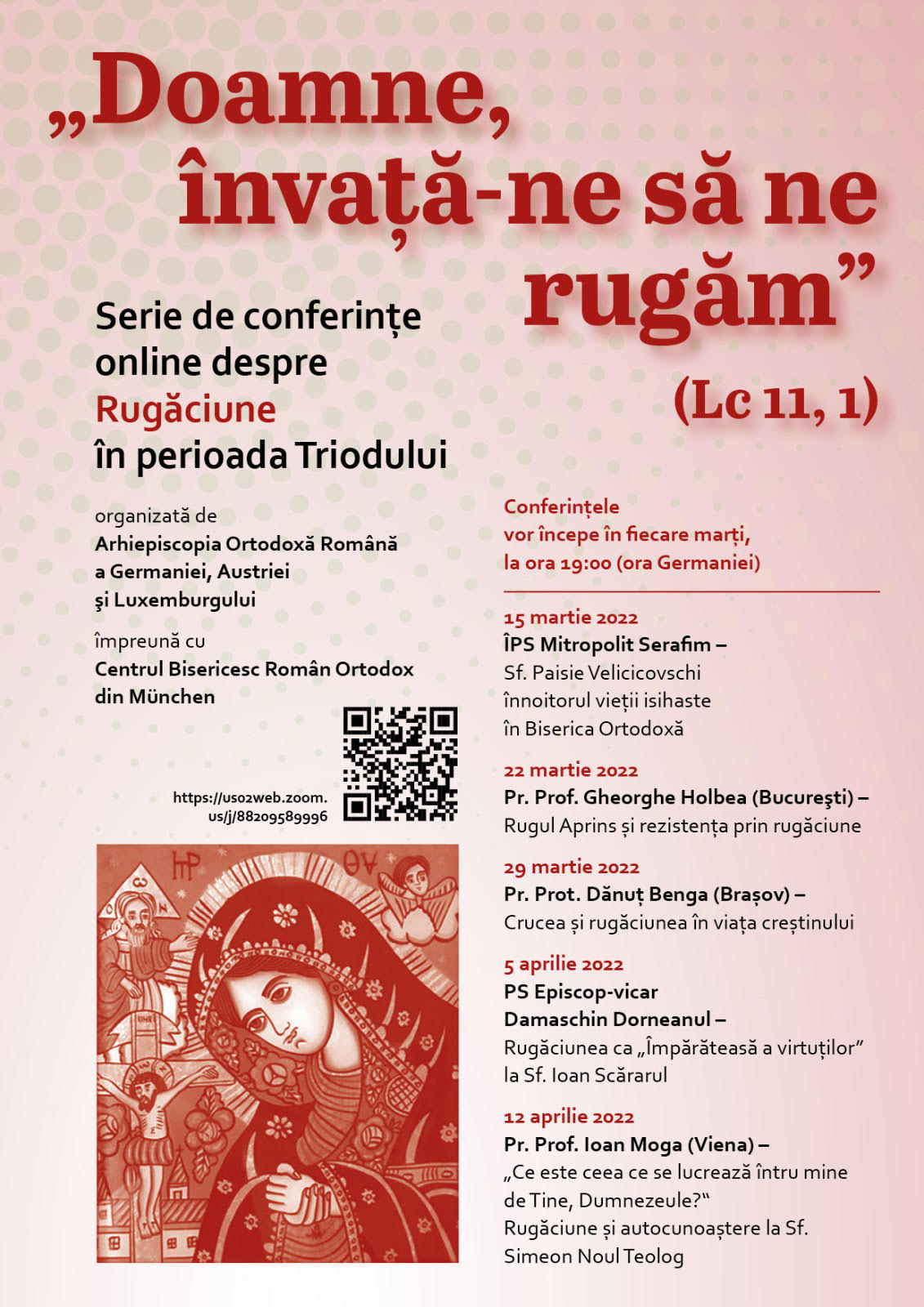 În primăvara anului 2022, dedicat rugăciunii și sfinților isihaști, Arhiepiscopia Ortodoxă Română a Germaniei, Austriei şi Luxemburgului împreună cu Centrul Bisericesc Român din München organizează o serie de conferințe online despre rugăciune, intitulată „Doamne, învață-ne să ne rugăm” (Lc. 11,1). Conferințele vor începe în fiecare marți, la h. 19.00 (ora Germaniei).