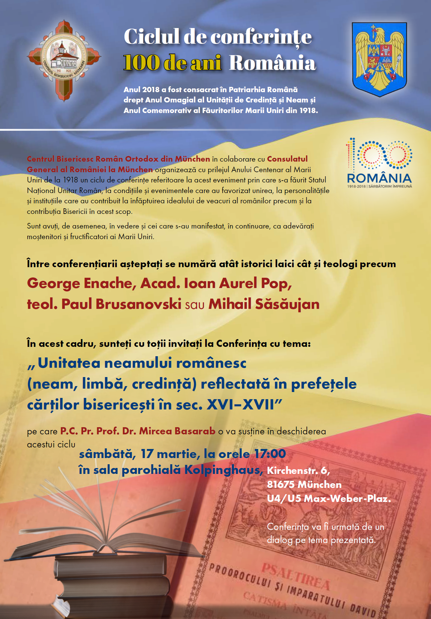 Anul 2018 a fost consacrat în Patriarhia Română drept Anul Omagial al Unității de Credinţă și Neam şi Anul Comemorativ al Făuritorilor Marii Uniri din 1918. Centrul Bisericesc Român Ortodox din München în colaborare cu Consulatul General al României la München organizează cu prilejul Anului Centenar al Marii Uniri de la 1918 un ciclu de conferinţe referitoare la acest eveniment prin care s-a făurit Statul Naţional Unitar Român, la condiţiile care au favorizat unirea, la personalităţile şi instituţiile care au contribuit la înfăptuirea idealului românilor precum şi la contribuţia Bisericii în acest scop.