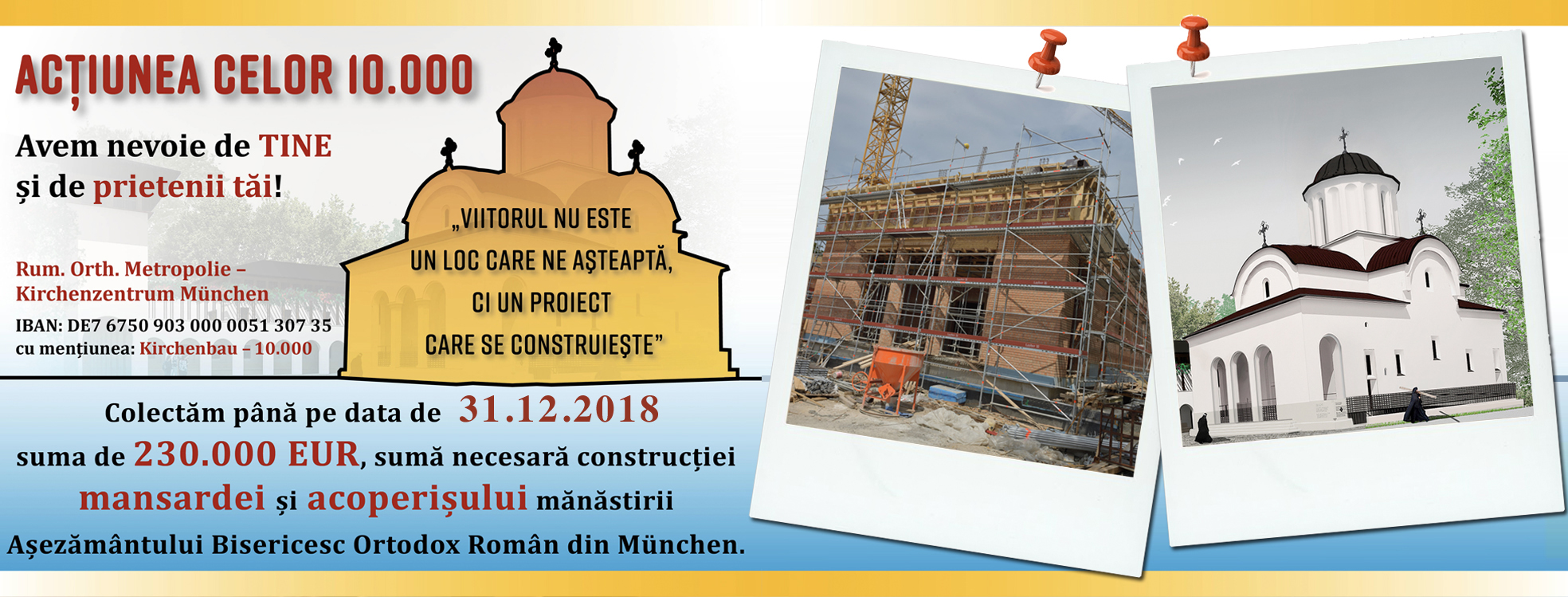 Mulţi chemaţi, puţini aleşi, se spune în limbaj biblic. La fel şi în ce priveşte acţiunea noastră: 10.000 au fost chemaţi, au răspuns până acum 1.400, cărora le mulţumim din suflet. Ei arată că se poate şi au făcut ca lucrul să poată continua. Având în vedere acest fapt, precum şi că pentru etapa a doua, din cei 230.000 EUR scontaţi avem aproape 140.000 donaţi, continuăm această etapă a acţiuni, destinată finanţării mansardei şi acoperişului mănăstirii, până la sfârşitul anului 2018.