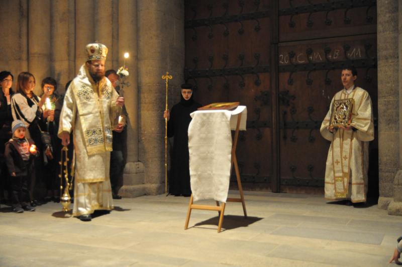 Slujba Învierii a început cu ritualul împărţirii luminii urmat de o procesiune în jurul bisericii. La sfârşitul Sfintei Liturghiei s-a împărţit pâinea binecuvântată, numită „Paşti”, precum şi tradiţionalul ou roşu şi o felie de cozonac. Cei care nu au avut posibilitatea participării la întreaga slujbă, au primit aceste daruri pascale, începând cu orele 22:00, la ieşirea din biserică. Bucuria Paştilor îşi găseşte însă adevăratul sens şi împlinirea mai ales în participarea la Sf. Liturghie şi în împărtăşirea cu Sfintele Taine.