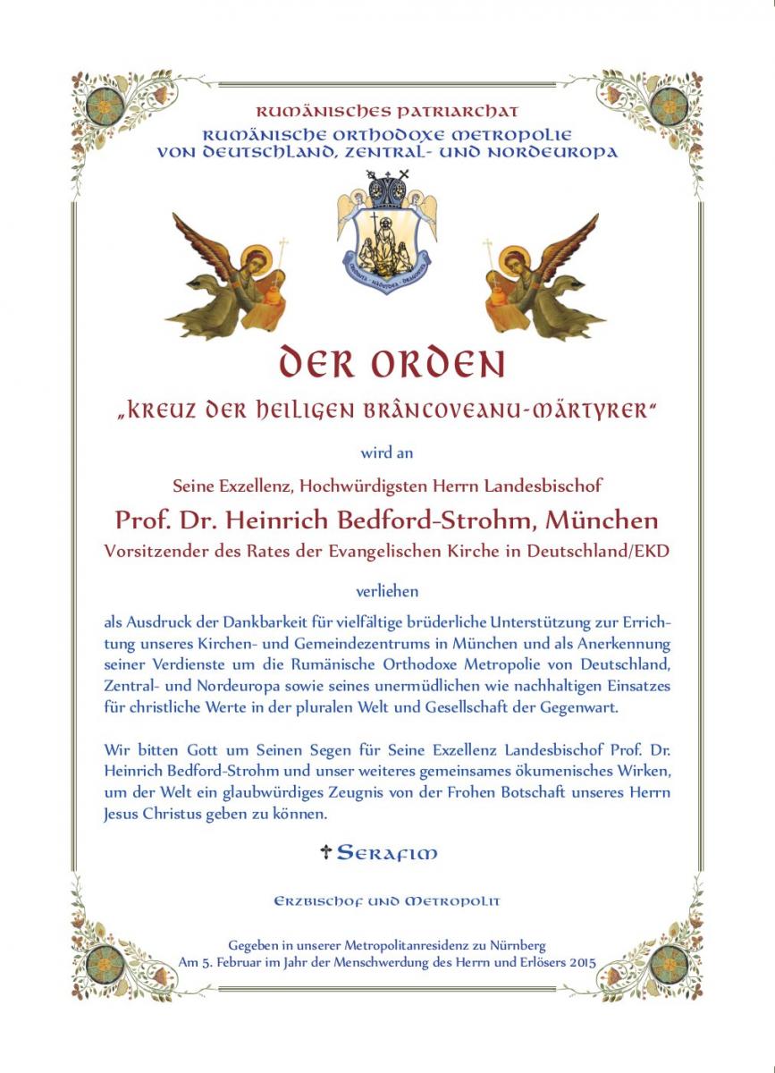 Apoi, Înaltpreasfințitul Părinte Mitropolit Serafim a înmânat Ordinul „Crucea Sfinţilor Martiri Brâncoveni” Excelenței Sale. În cuvântul de mulţumire, episcopul Heinrich Bedford-Strohm a declarat că se simte onorat, dar și marcat de cuvintele Mitropolitului Serafim, care a subliniat că «rațiunea este o energie a inimii» și că, prin urmare, avem nevoie astăzi mai mult ca oricând de un dialog între Biserici care să izvorască din rugăciune, pledând pentru un «ecumenism al inimii». El a evocat și prima întânire avută cu ÎPS Părinte Mitropolit Serafim, în urmă cu câțiva ani, pe vremea când era profesor la Universitatea din Bamberg.