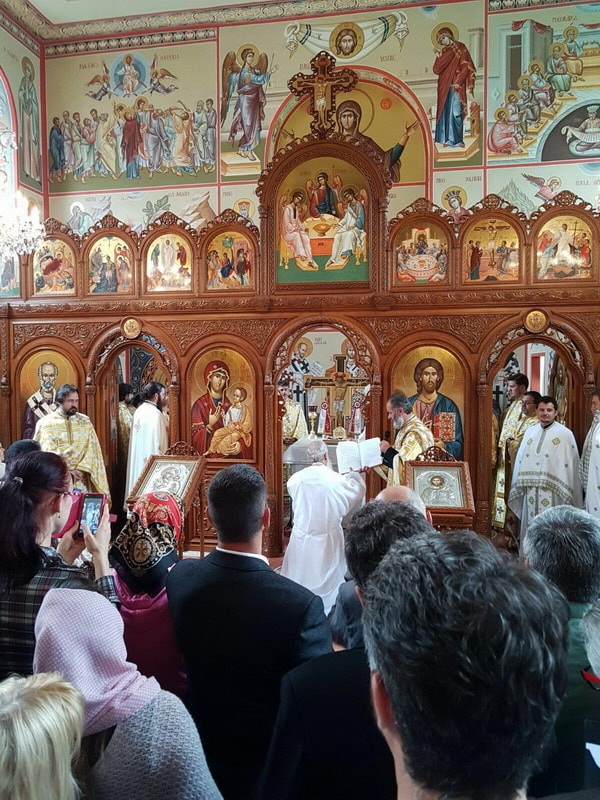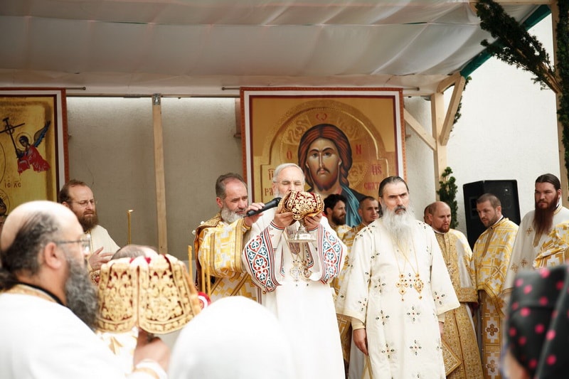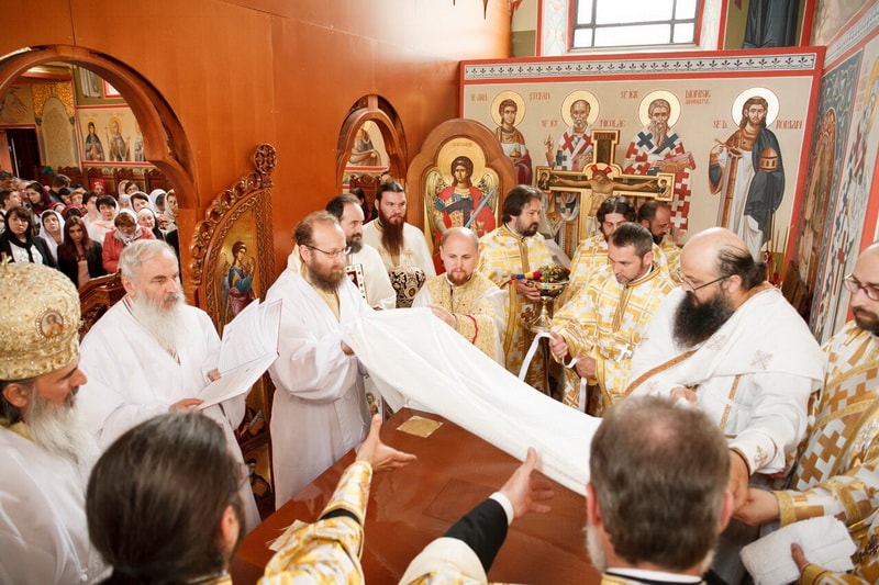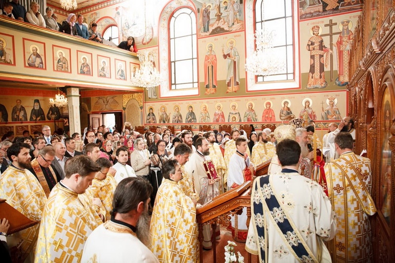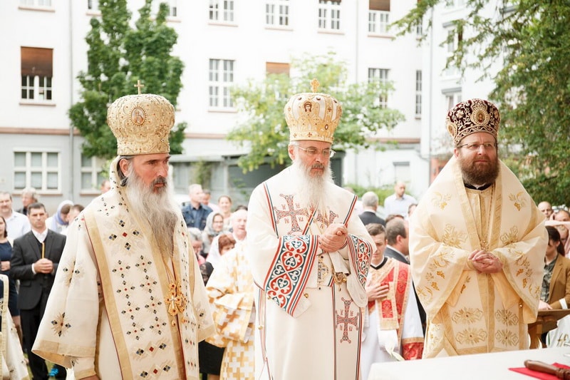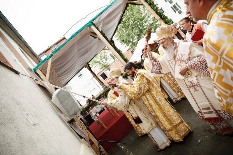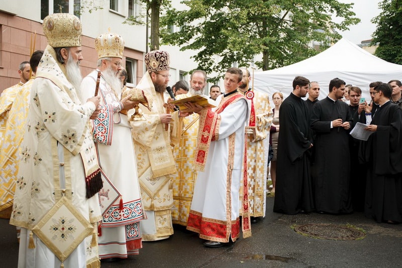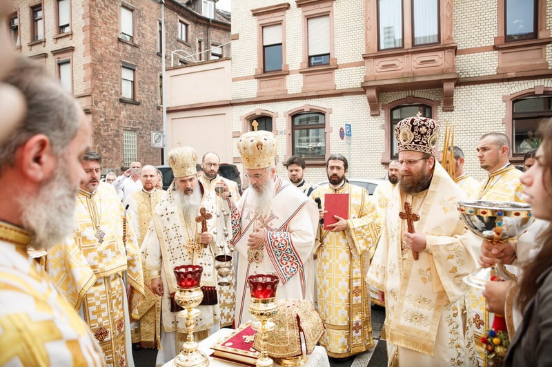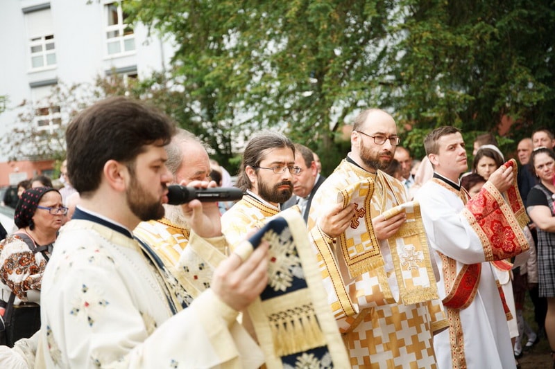 După slujba de sfinţire, Sfânta Liturghie arhierească a fost săvârşită ce către cei ierarhi prezenți pe scena organizată lângă biserică. La dumnezeiasca slujbă au participat numeroşi preoţi şi credincioşi din Germania şi România, precum și oficialități locale. Cuvântul de învăţătură a fost rostit de către ÎPS Teodosie, care pornind de la importanţa cinstirii Sfinţilor Părinţi de la Sinodul I Ecumenic şi de la importanţa cunoaşterii dreptei credinţe, a îndemnat pe credincioşi să îşi mărturisească credinţa ortodoxă oriunde se găsesc, în primul rând dând dovadă de dragoste creştină pentru toţi cei din jur. Corul bizantin „Evloghia” din București, condus de Pr. Marius Militaru, a dat răspunsurile liturgice la strană.
