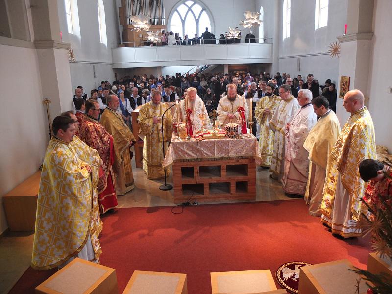 Duminică, 17 ianuarie 2016, Sfânta Liturghie arhierească a fost săvârșită de ÎPS Părinte Mitropolit Serafim împreună cu PS Sofian Brașoveanul, Episcop vicar, alături de un sobor de preoți și numeroși credincioși și oaspeți. Din soborul de preoți slujitori au făcut parte PC Pr. Prof. Dr. Mircea Basarab, fondatorul parohiei și preot paroh până în 2012, PC Pr. Prof. Dr. Mircea Ielciu, Prodecanul Facultății de Teologie Ortodoxă „Andrei Șaguna” din Sibiu, PC Pr. Alexandru Nan, protoiereu pentru Bavaria, preoți români din apropierea orașului München, precum și preoți din celelalte jurisdicții ortodoxe (greacă, sârbă și rusă). Printre oaspeții la acest eveniment s-au numărat reprezentanți ai Bisericilor catolică, vechi-catolică și evanghelică, din partea Comunității de lucru a Bisericilor creștine în Bavaria (Arbeitsgemeinschaft Christlicher Kirchen in Bayern), din partea Consulatul General al României din München, membri ai parohiei și credincioși din parohii învecinate.