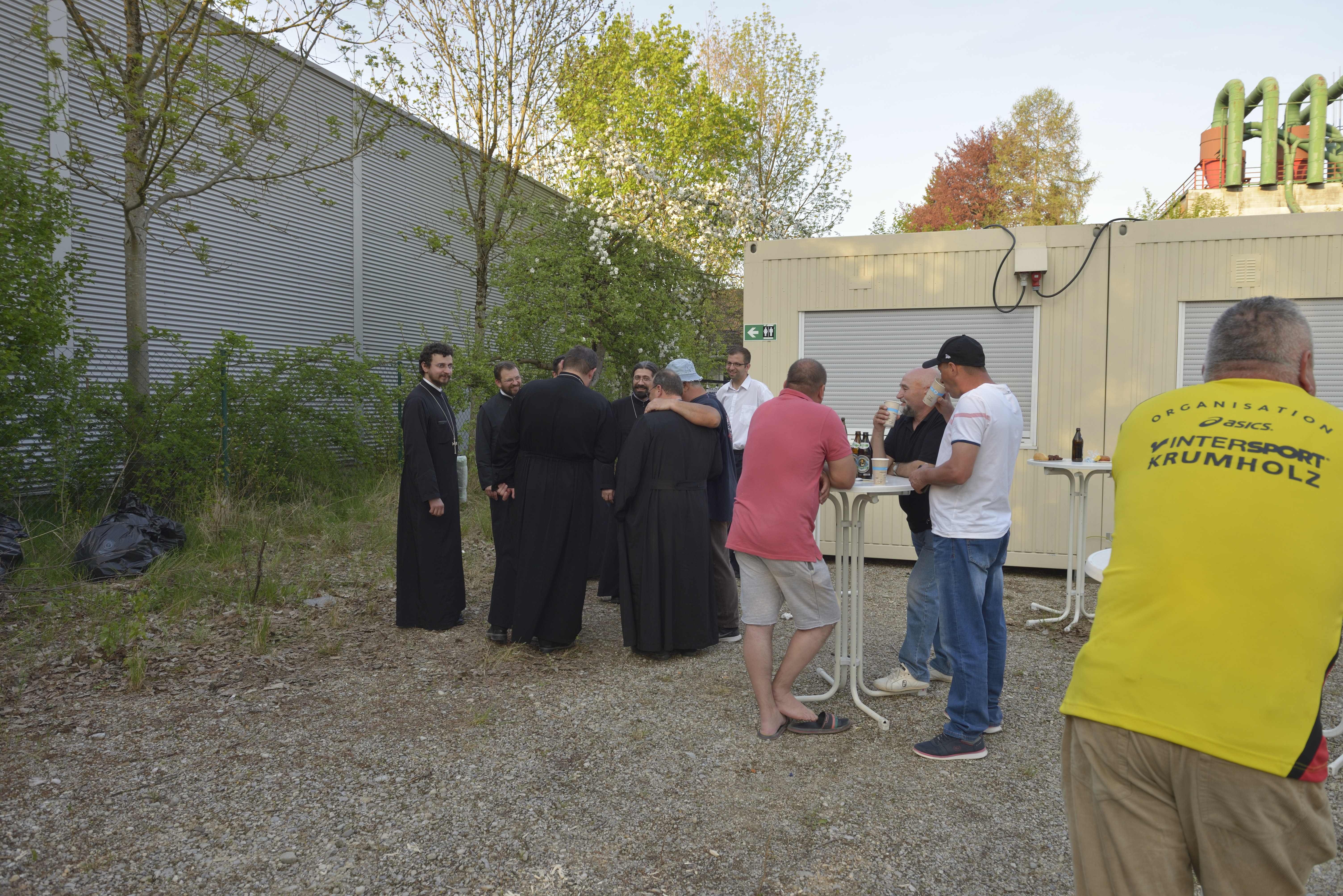 În încheiere, Preasfințitul Părinte Sofian Brașoveanul a mulțumit tuturor oaspeților participanți la eveniment, a descris stadiul proiectului realizat de echipa de arhitecți condusă de domnul Șerban Sturdza, aflat de asemenea la eveniment, iar apoi a prezentat perspectivele finalizării proiectului. Nu au fost uitați nici vecinii viitorului Așezământ, despre care PS Sa a spus că au primit cu bucurie vestea ridicării complexului bisericesc românesc și privesc cu prietenie și răbdare lucrările șantierului. În încheiere, toți cei aflați la eveniment au participat la o agapă organizată de Centrul Bisericesc din München.