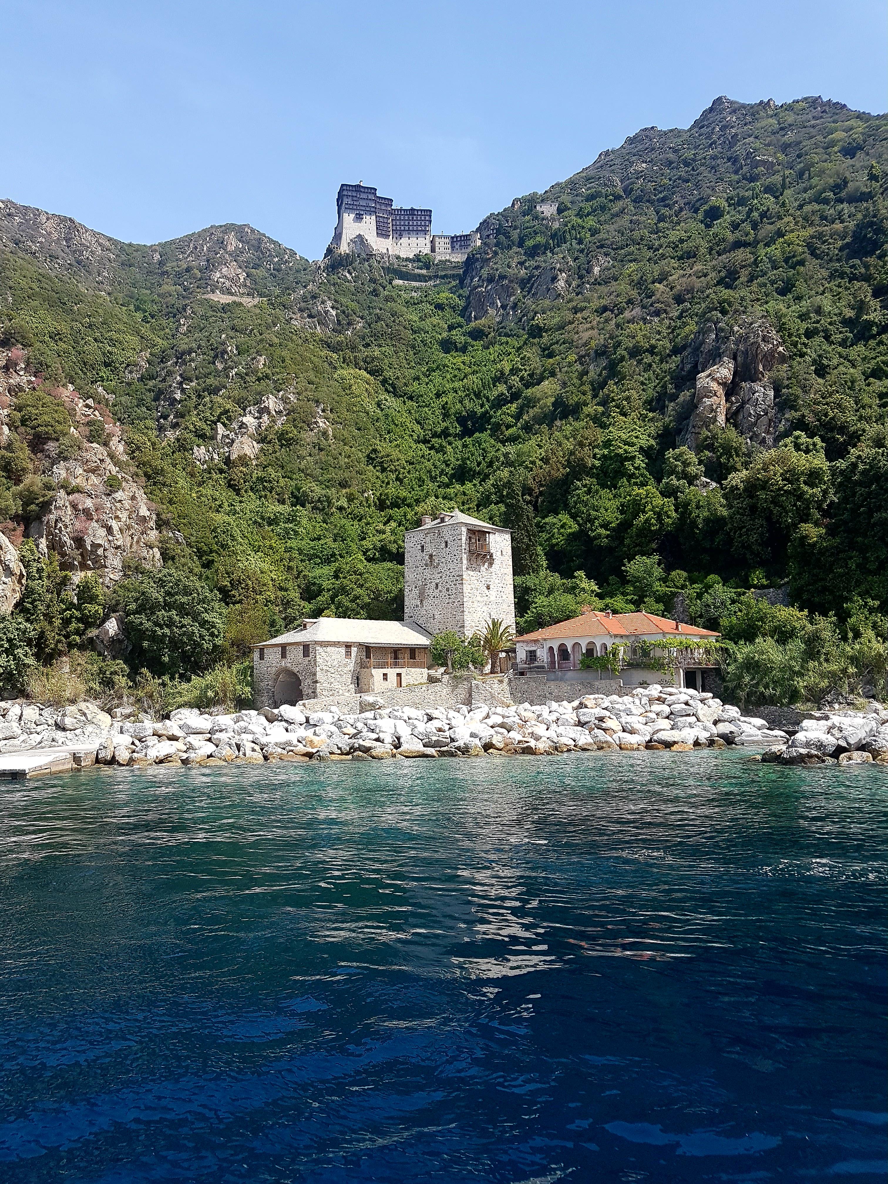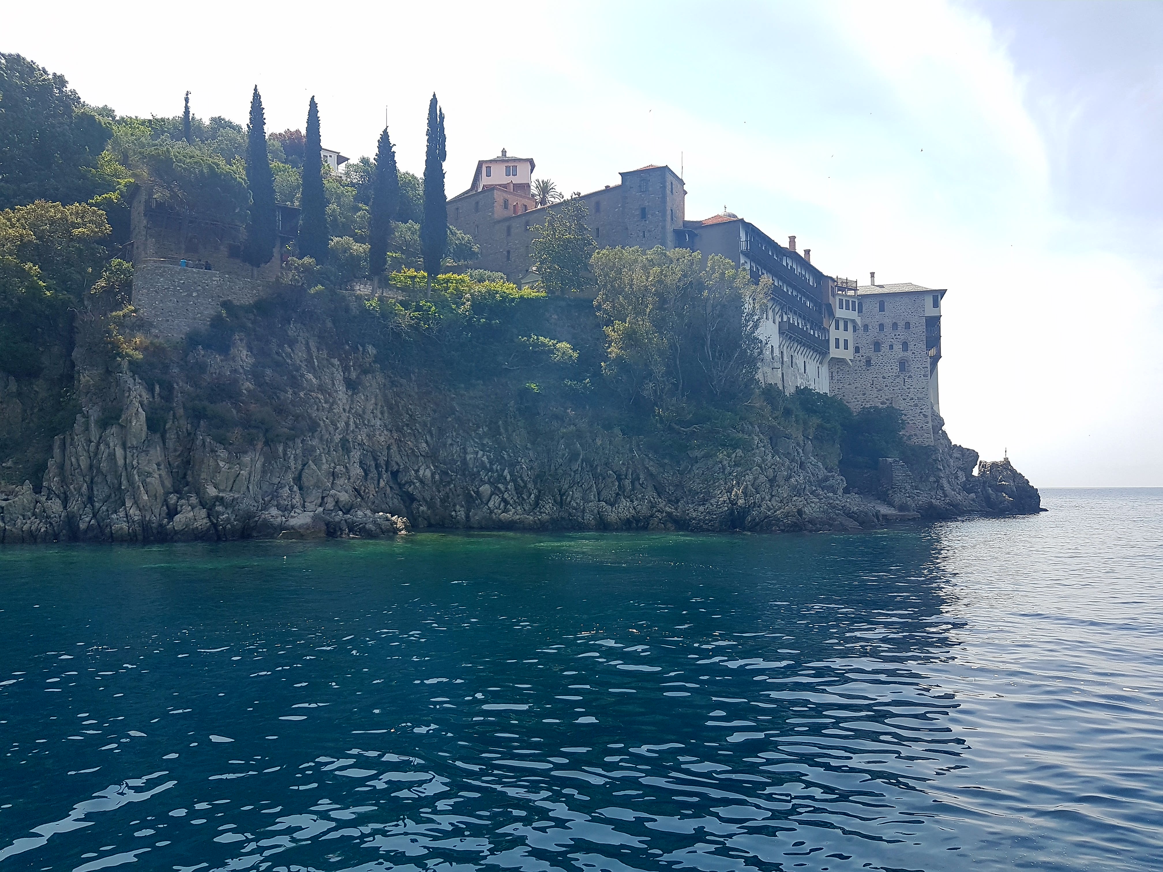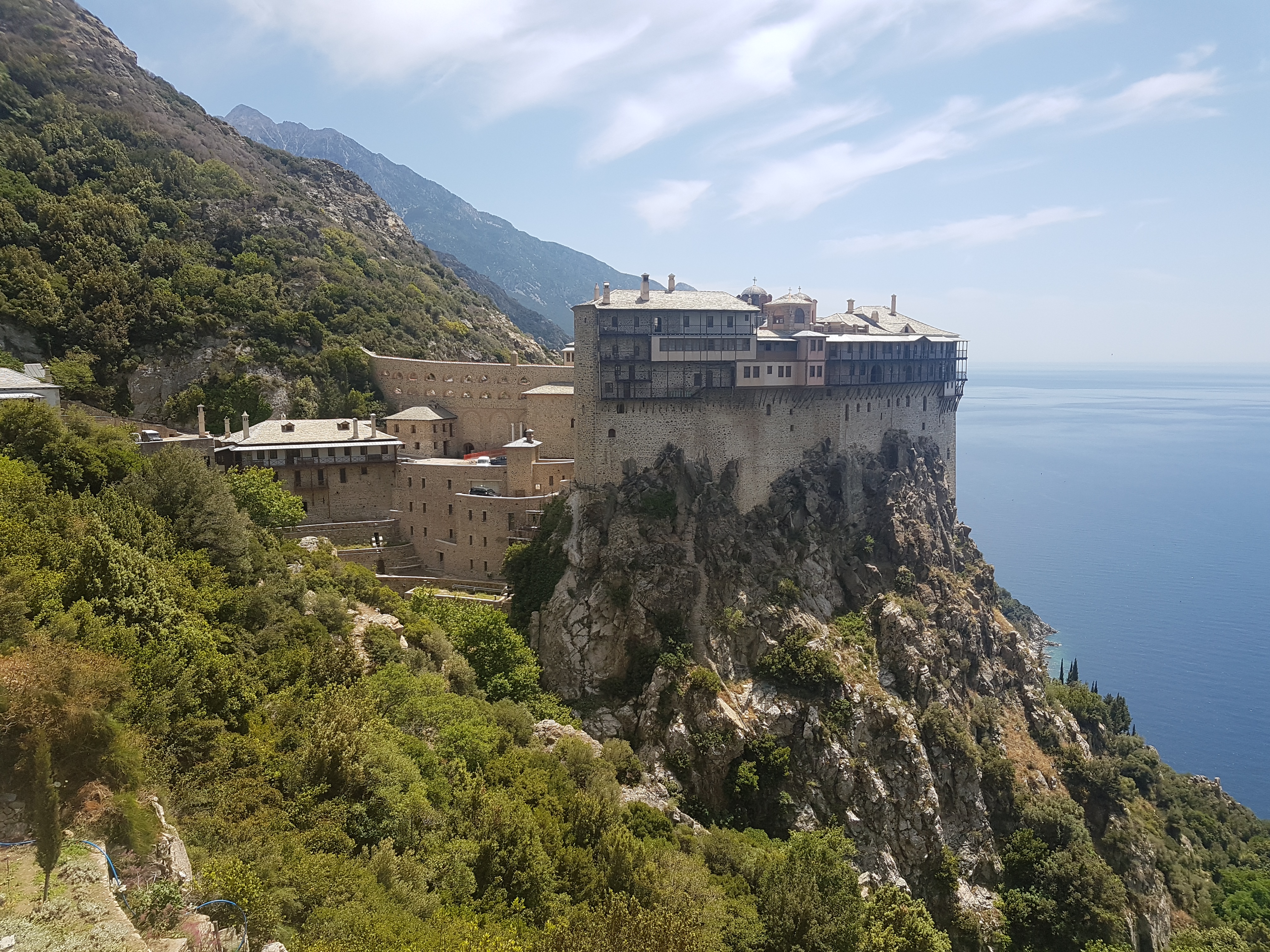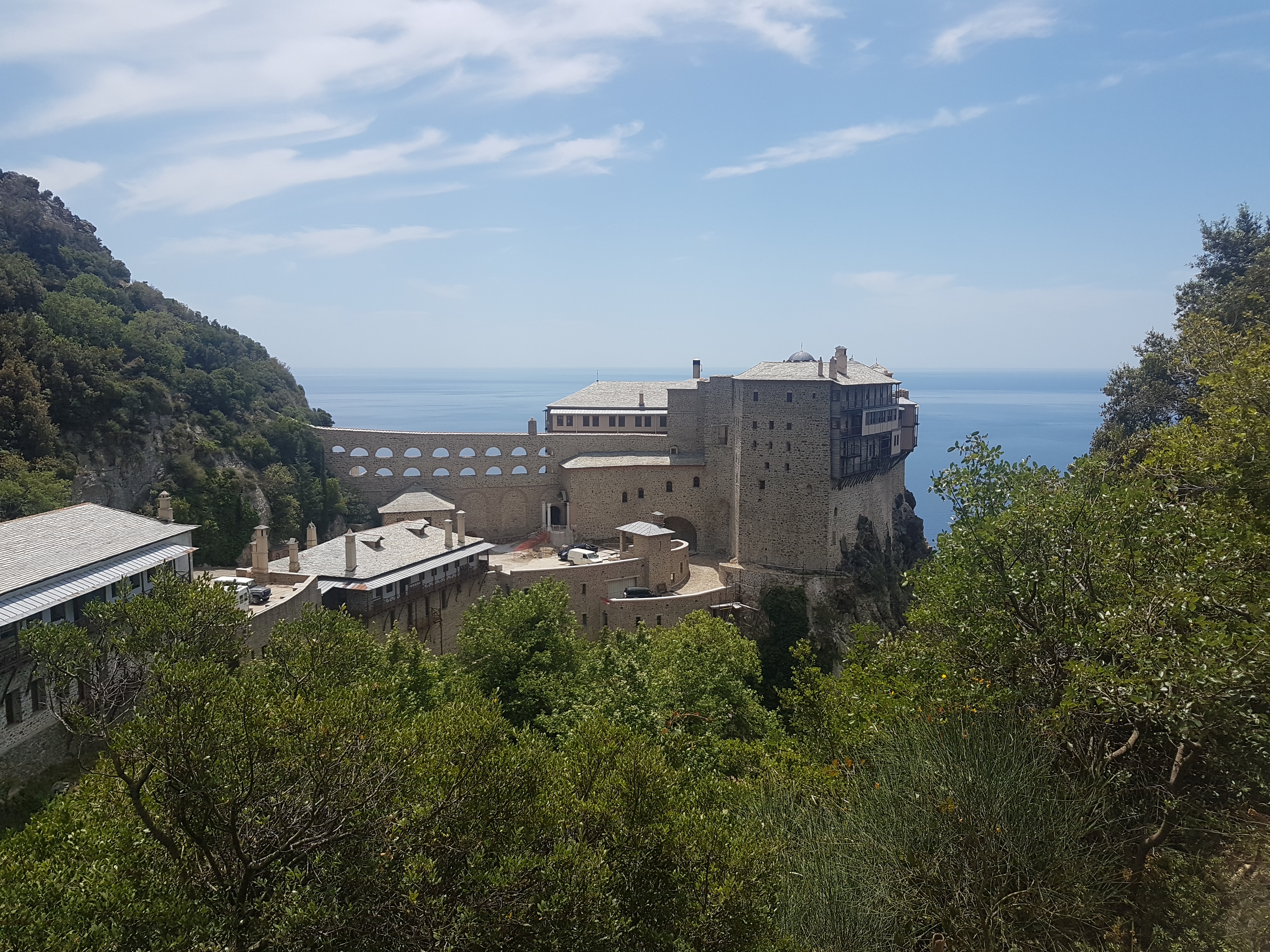 Următorul popas a fost, joi, 17 mai, la spectaculoasa Mănăstire Simonos Petra, unde părintele Macarie Simonopetritul, mare teolog contemporan, a prezentat grupului de pelerini Mănăstirea. Printre odoarele de mare preț se află aici mâna Sfintei Maria Magdalena. După un puternic incendiu, Mănăstirea a fost reconstruită prin daniile lui Mihai Viteazul. Pelerinajul a continuat cu drumul parcurs pe jos de la Mănăstirea Simonos Petra la Mănăstirea Grigoriu, unde grupul de pelerini a rămas până vineri dimineaţa. Aici pelerinii au fost primiți de părintele stareț Hristofor, care a ținut un cuvânt de folos, prezentând şi misiunea pe care mănăstirea o desfășoară în Africa de mai bine de 35 de ani. El a evocat și imaginea starețului vrednic de pomenire, Gheorghe Kapsanis (+2014), fost profesor de teologie la Atena, retras aici, conducând și reînnoind viața duhovnicească timp de 40 de ani, cât a fost stareț. Între Sfintele Moaște care se află aici sunt şi cele ale Sfintei Anastasia Romana, cinstită în mod deosebit în această mănăstire.