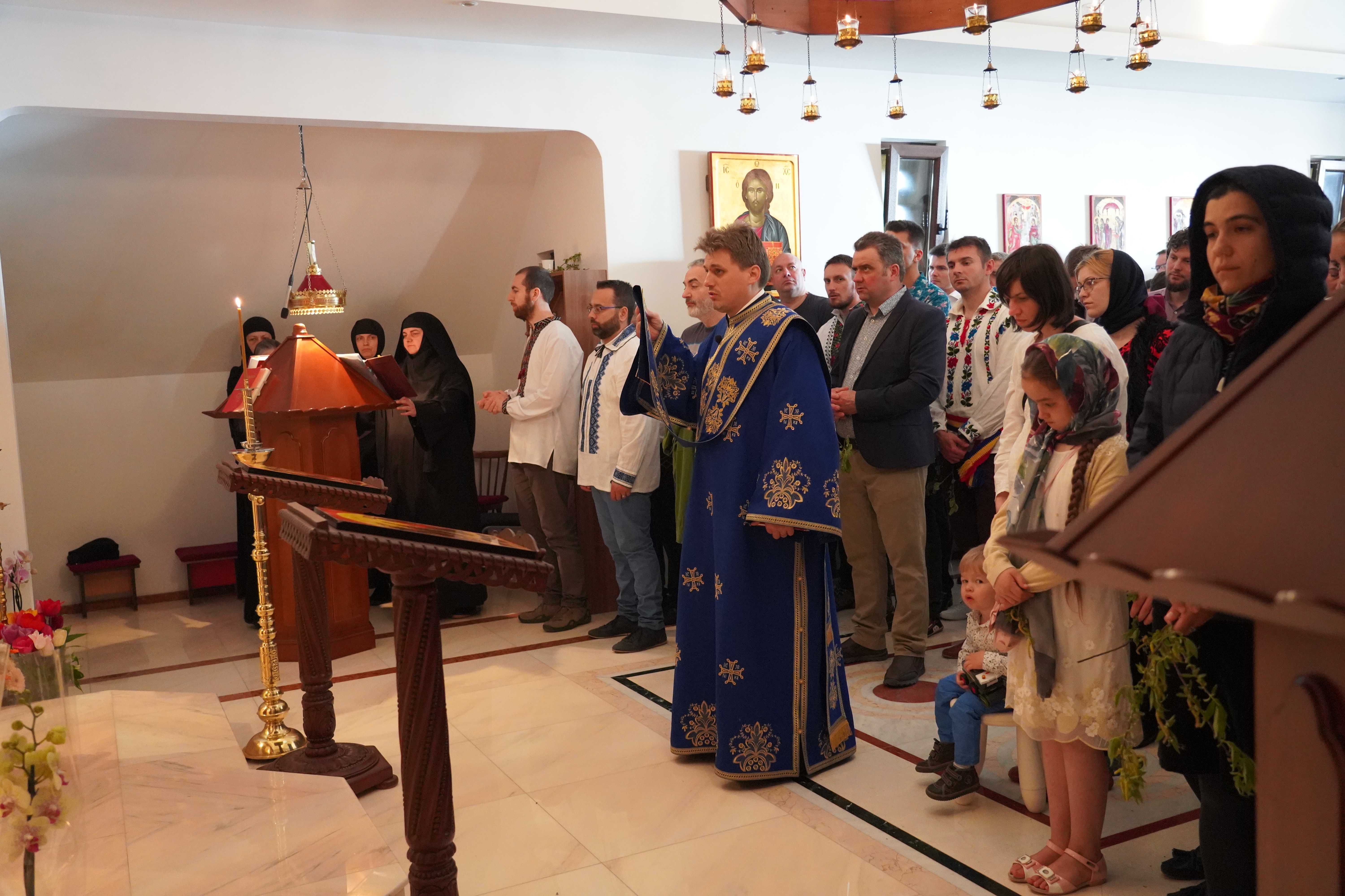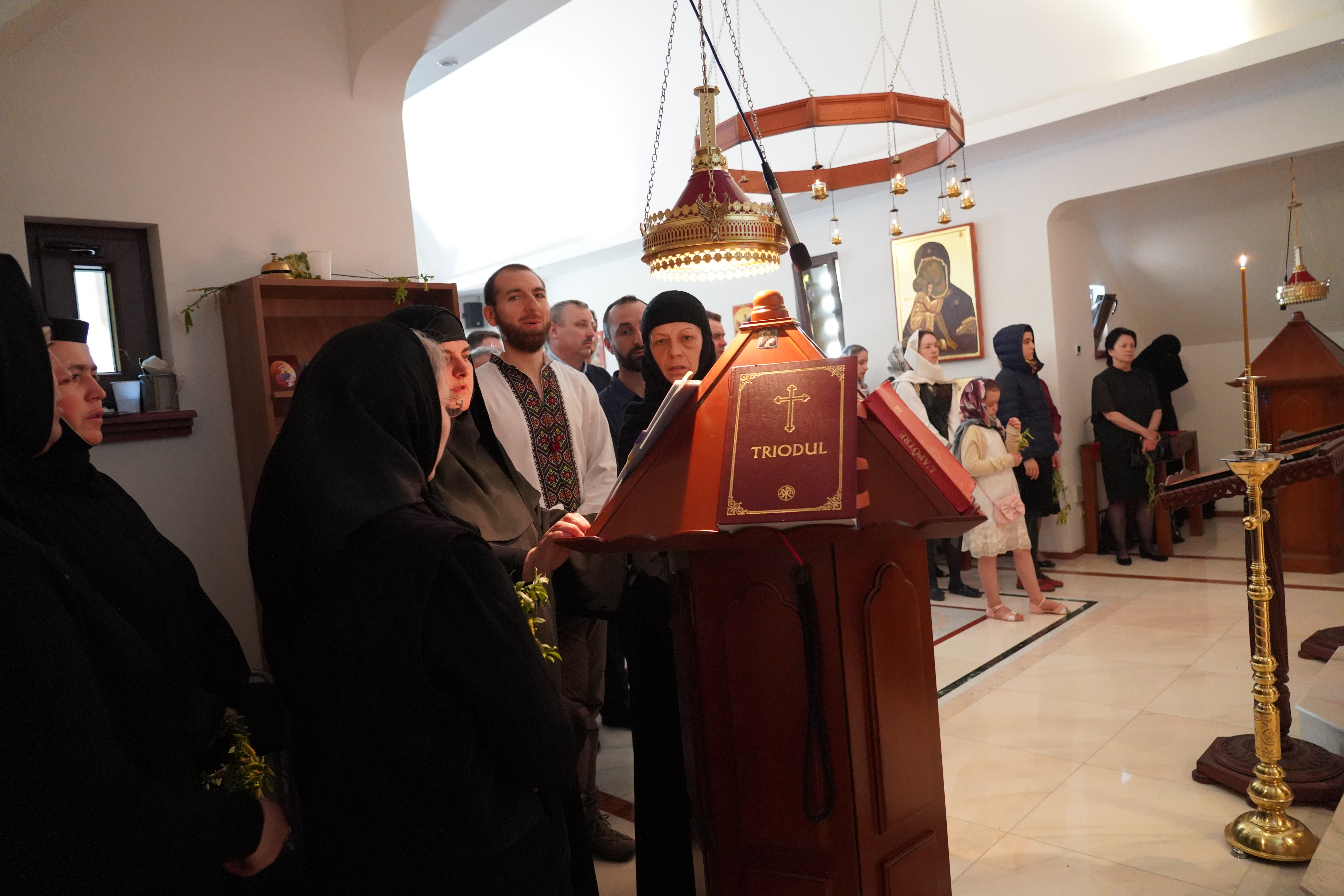 Alături de maici și credincioșii numeroși ai Mănăstirii Namur, tinerii au participat și la Sfânta și Dumnezeiasca Liturghie din Duminica Floriilor sau a Întrării Domnului Iisus Hristos în Ierusalim, săvârșită de Pr. Arhim. Daniil Oltean și diaconul Teodor Tăbuș (Parohia „Duminica Tuturor Sfinţilor“ Köln, Germania), mulți dintre ei împărtășindu-se cu Sfintele Taine. La rugămintea și cu binecuvântarea Pr. Arhim. Daniil, cuvântul de învățătură a fost rostit în duminica Floriilor de către diaconul Teodor Tăbuș. Un aspect central pe care părintele diacon l-a evidențiat pe marginea pericopei evanghelice a fost acela de întâlnire reală, fondatoare, și nu de intersectare, între Cuvântul lui Dumnezeu, Sfânta Împărtășanie, ca modalități concrete de cunoaștere a lui Iisus Hristos, rămase nouă astăzi creștinilor, și om, în ziua de astăzi, chiar dacă omul se află și în stare de putrefacție spirituală, duhovnicească, din cauza păcatului. Această întâlnire organică dintre Cuvântul lui Dumnezeu, Sfinta Taină a Împărtășaniei și om produce, în fond, nu numai o „răsucire“ salvatoare de moment, de oportunitate a ființei și existenței omului în totalitatea sa, ci și o inviere a omului în sensul tare al cuvântului, așa cum a fost și în cazul cu minunea învierii lui Lazăr din morți, deși acesta era în stare de descompunere. Totuși din întâlnirea fizică cu Hristos și la porunca Sa, Lazăr a putut să fie înviat, să fie redat îm mod palpabil rudelor și familiei sale. Un alt aspect evidențiat a fost și acela al relației organice dintre învierea unui om prin Cuvântul lui Dumnezeu și Sfintele Taine, și verticalitatea de esență tare a omului, care decurge din această înviere a omului, și însușirea acesteia, totodată, de către om. La sfârșitul slujbei Pr. Arhim. Daniil a rostit un cuvânt de mulțumire adresat atât tinerilor ATORG și NEPSIS Belgia cât și celor care au participat la Sfânta Liturghie, invitându-i la sfârșit pe toți la masa de prânz, oferită și organizată de Mănăstirea Namur, în colaborare cu enoriașii mănăstirii.