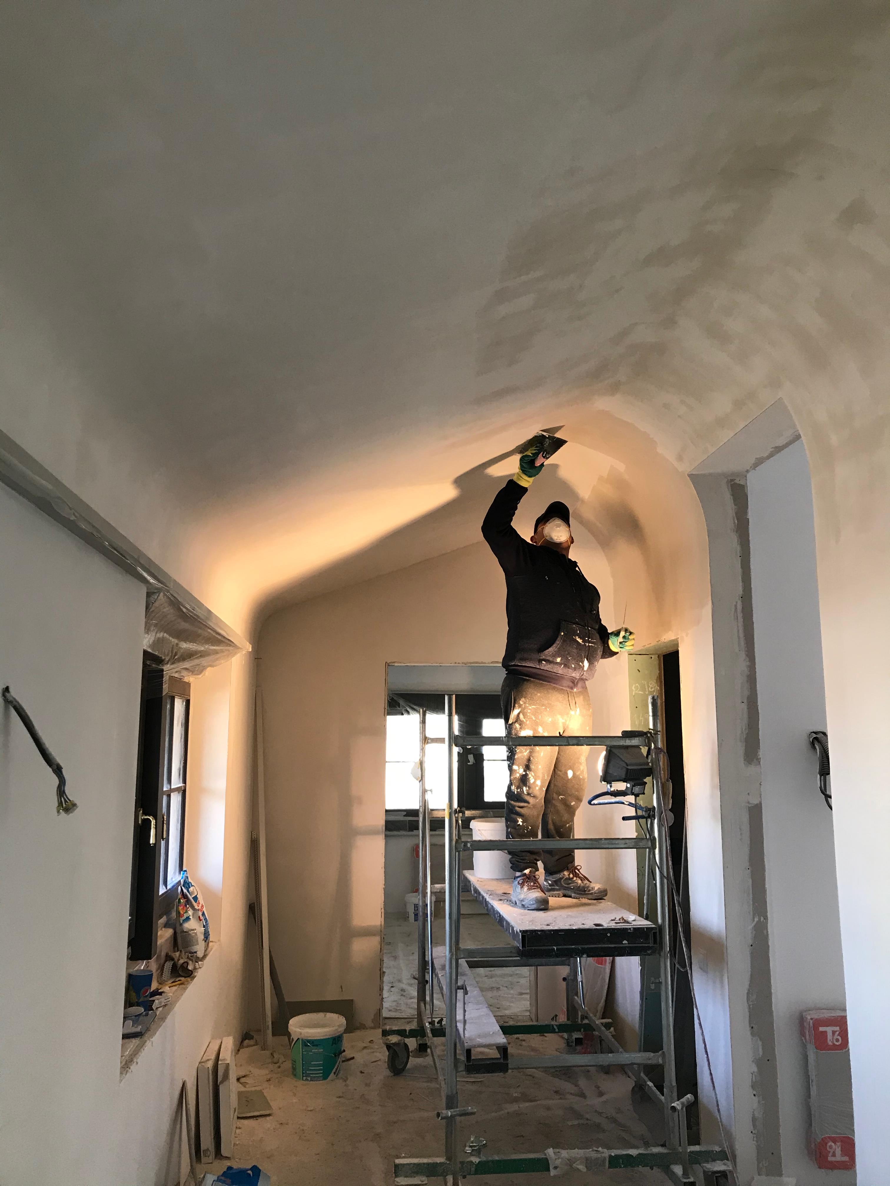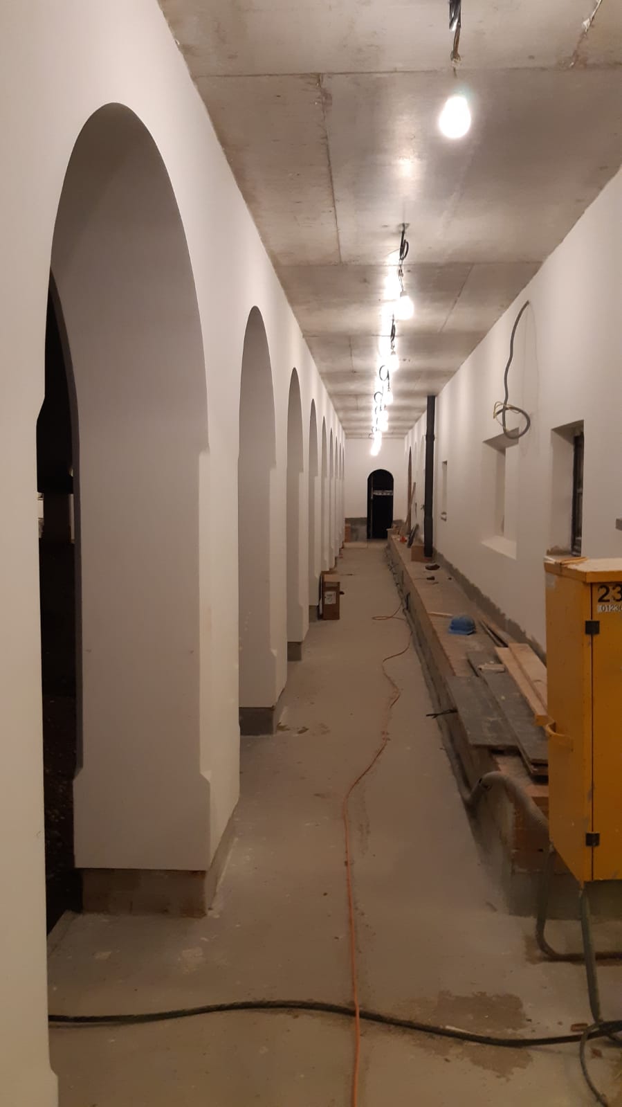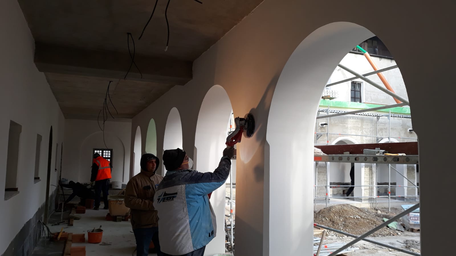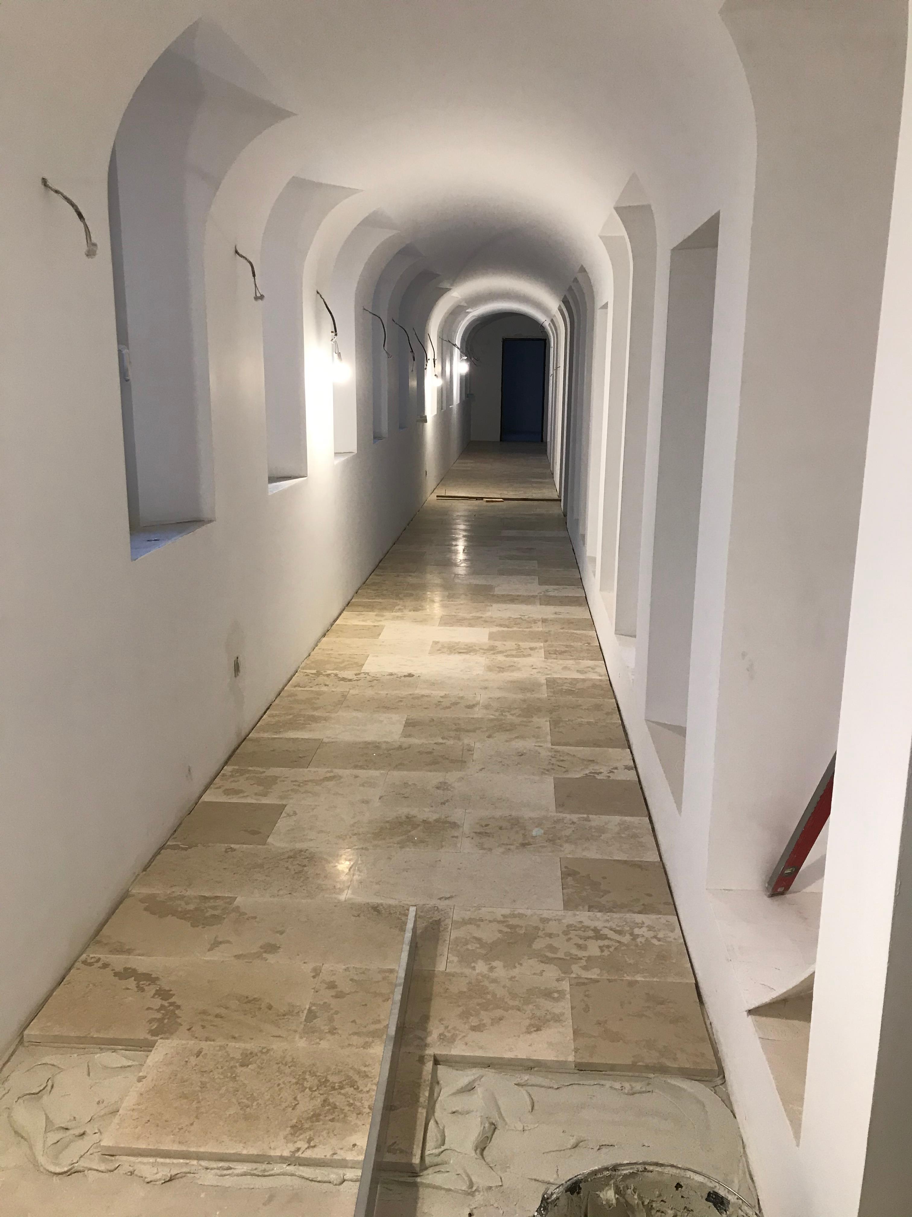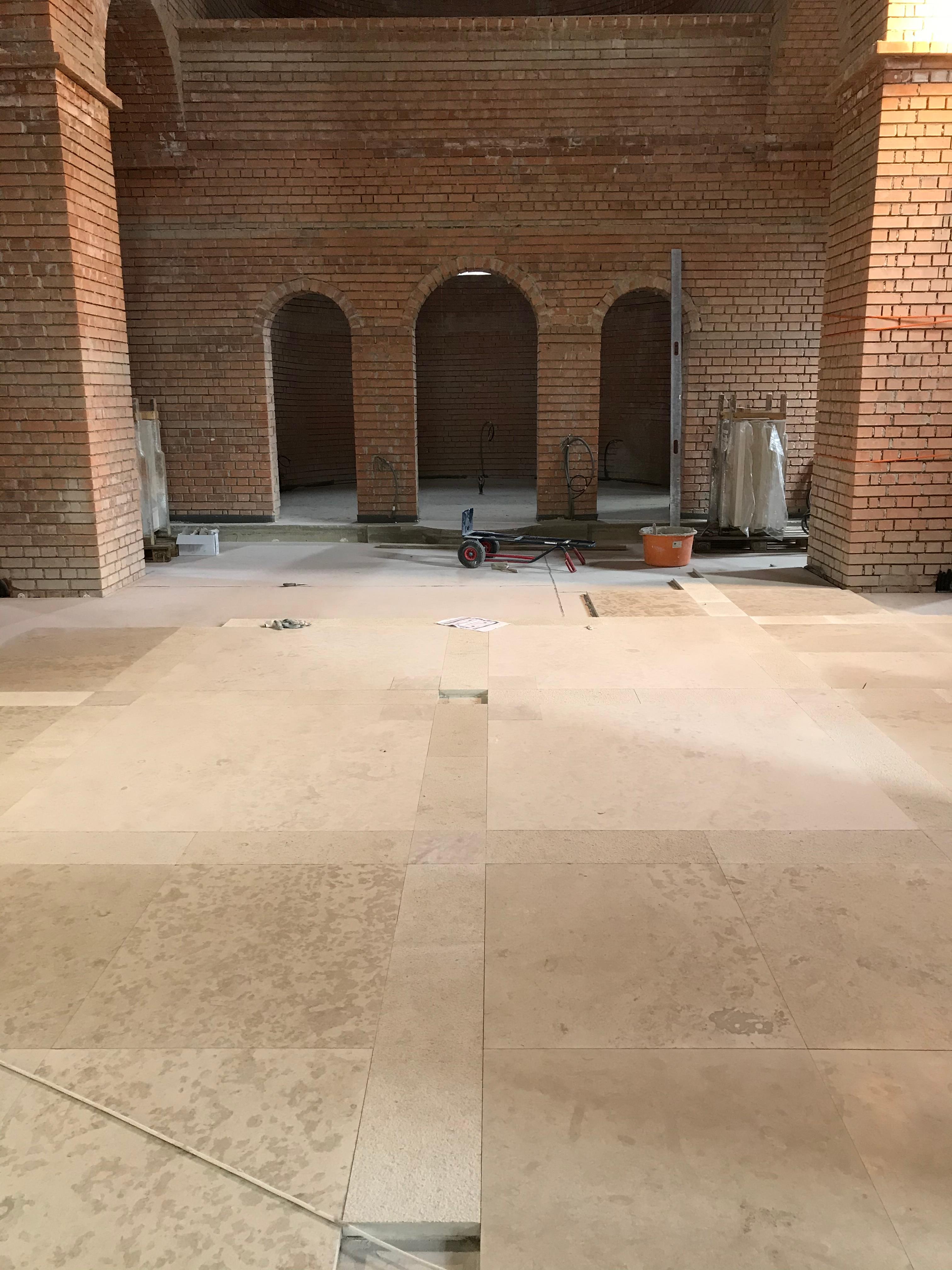 Ende Januar begann man mit der Verlegung der Steinböden. Zuerst wurden die Steinböden in den oberen Stockwerken des Klosters verlegt, dann wurden die Steinplatten in der Kirche eingebaut.