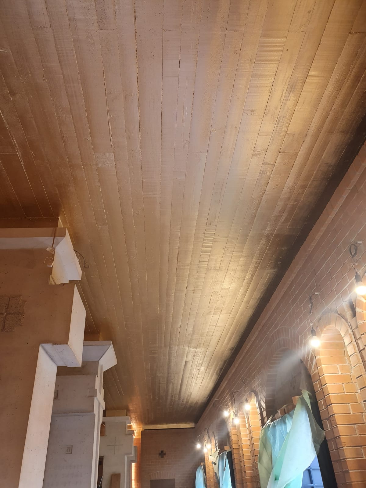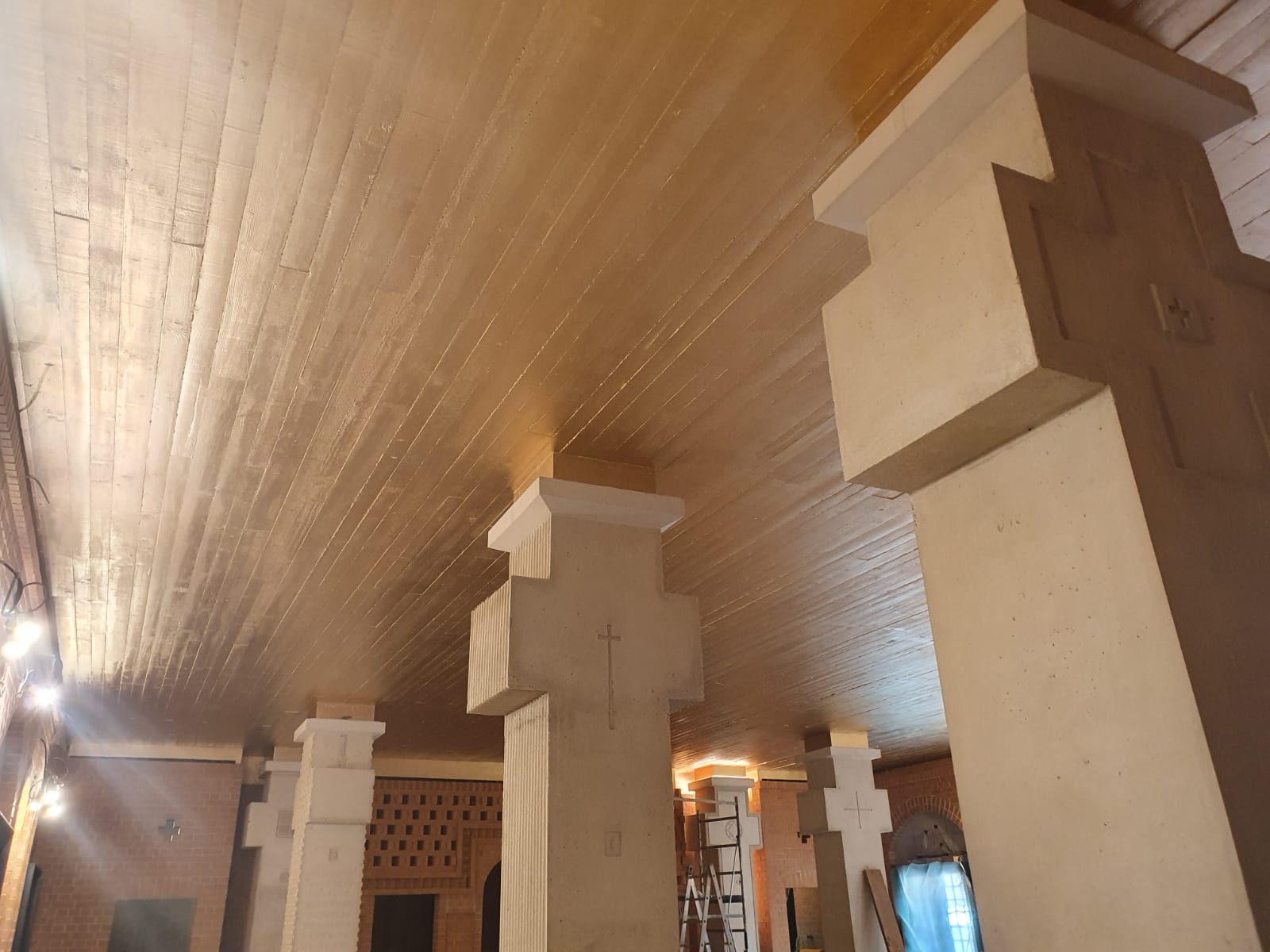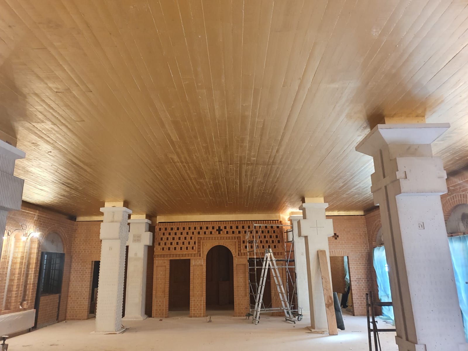Im Kreuzsaal wurden zuerst die Feinarbeiten an den Fugen der Ziegel erledigt, dann wurden die Ziegel gesäubert; Anfang April wurde die Decke mit Goldbronze gestrichen. Weiterhin wurde die Beton – Struktur des Baptisteriums an der westlichen Seite des Kreuzsaals bewerkstelligt. Dort wurde auch vor ein paar Tagen mit der Verlegung des Ziegelbodens begonnen.