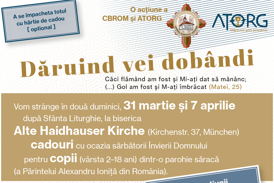 În această primăvară demarăm acțiunea Dăruind vei dobândi, o acțiune a comunității CBROM, sprijinită de asociațiile Sfântul Vasile cel Mare și ATORG-München. Această acțiune este despre oameni care ajută alți oameni, despre altruism și compasiune. Asta ne-a învățat și Iisus Hristos, când ne-a spus: Căci flămând am fost şi Mi-aţi dat să mănânc; (...) Gol am fost şi M-aţi îmbrăcat (Matei, 25). Astfel, vom strânge în perioada 31 martie-7 aprilie cadouri cu ocazia sărbătorii Învierii Domnului pentru copii (vârsta 2-18 ani) din familii cu posibilități reduse din România (din parohia Sibiu-Gușterița, unde Alexandru Ioniță, fost membru al comunității noastre, este preot paroh).