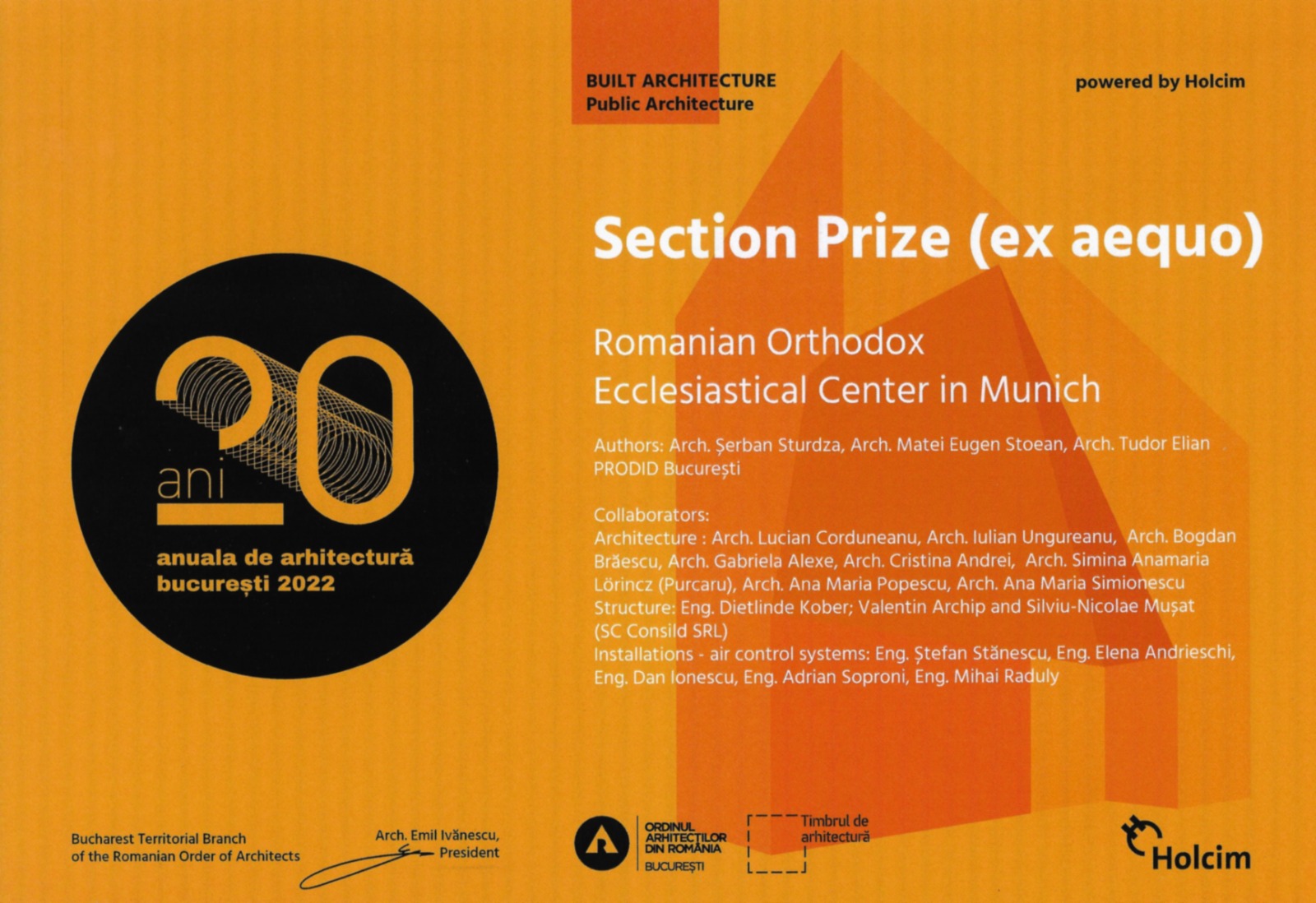 Este vorba de Premiul „Arhitectură construită / Arhitectură publică” (ex aequo) al celei mai importante expoziții/competiții de proiecte de arhitectură din București și din Ţară. Ne onorează şi ne bucură foarte mult această nominalizare, făcută de un juriu internaţional, cuprinzând arhitecţi din Franţa, Polonia, Spania, România şi Ucraina, şi adresăm felicitări tuturor specialiştilor implicaţi în proiectare şi punere în operă.