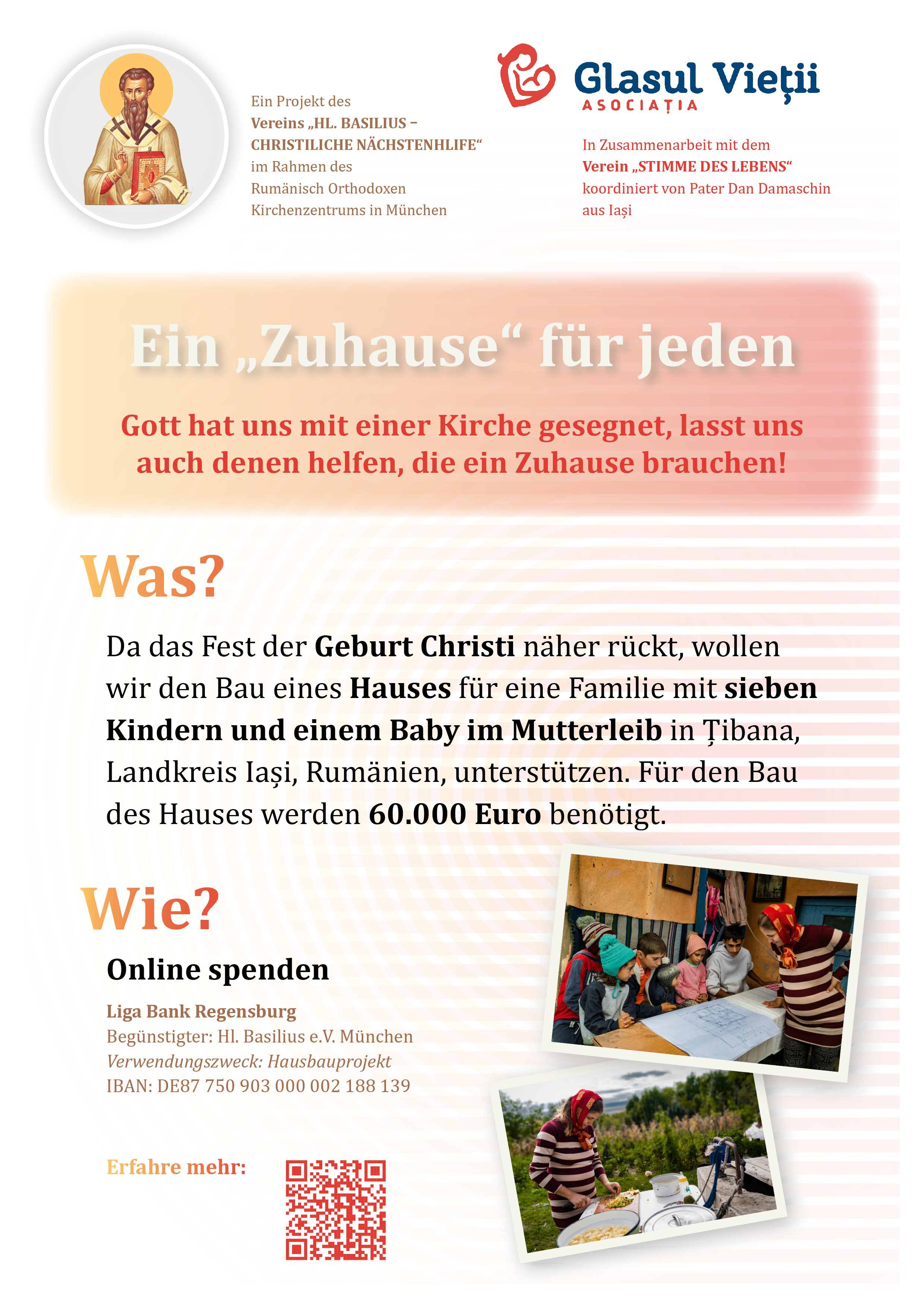 Der Verein Hl. Basilius – Nächstenhilfe, im Rahmen des Rumänischen Orthodoxen Kirchenzentrums in München hat sich vorgenommen den Bau eines Hauses für eine 10 Köpfige Familie zu unterstützen. Das Projekt wird vom rumänischen Verein „Stimme des Lebens“ initiiert, der von Pater Dan Damaschin aus Jassy koordiniert wird.