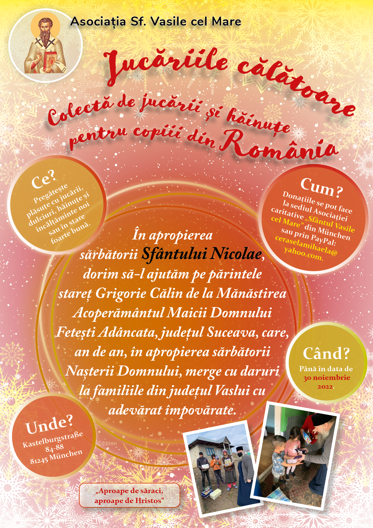 Cum. Donațiile se pot face la sediul Asociației caritative „Sfântul Vasile cel Mare” din München, pâna în data de 30 noiembrie 2022, în intervalul orar 18:00-19:00 (Luni, Miercuri-Sâmbătă) și 09:00-13:00 (Duminica). Adresa: Sala Crucilor, Kastelburgstr. 84-88, 81245 München. Sau prin paypal: Această adresă de email este protejată contra spambots. Trebuie să activați JavaScript pentru a o vedea.