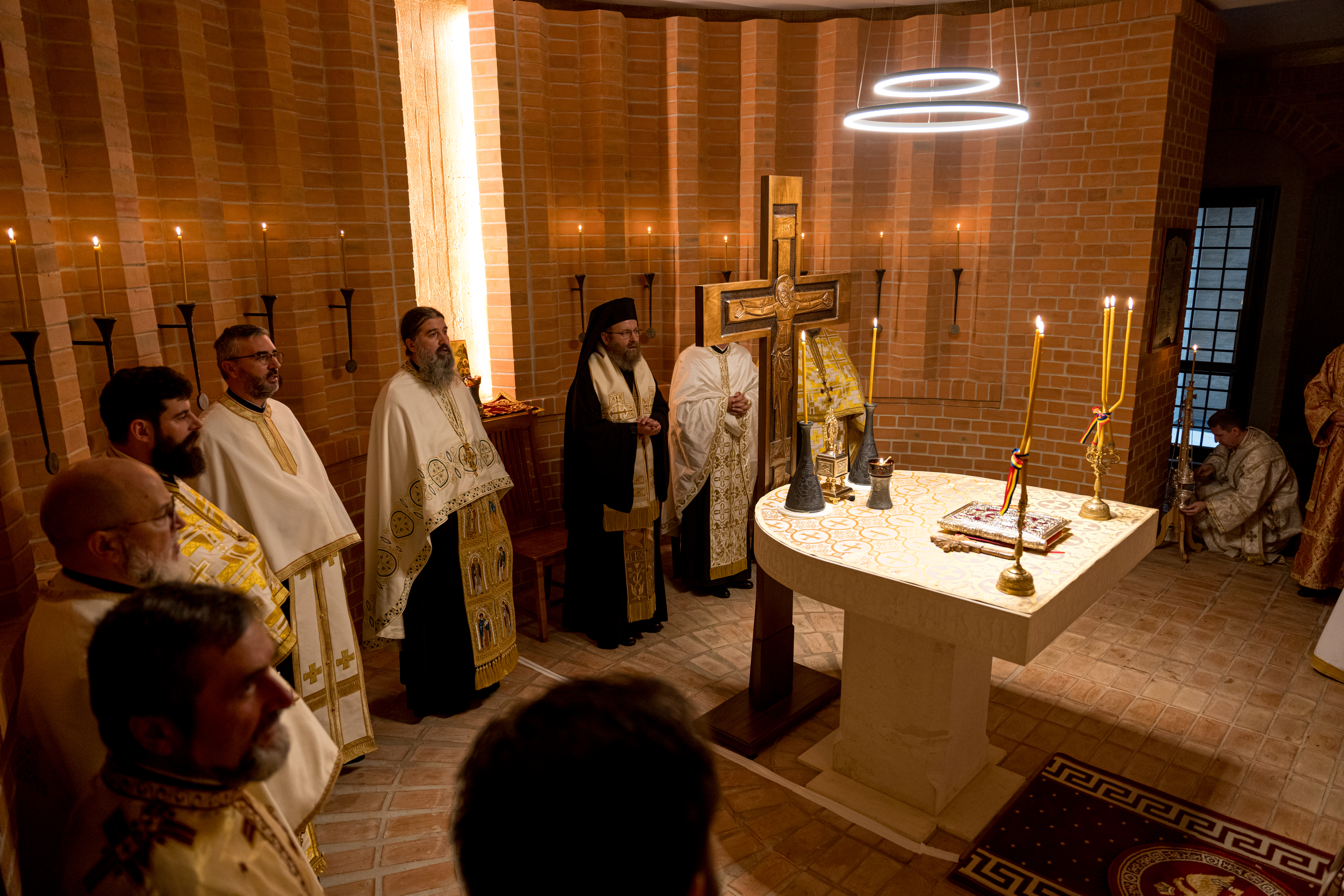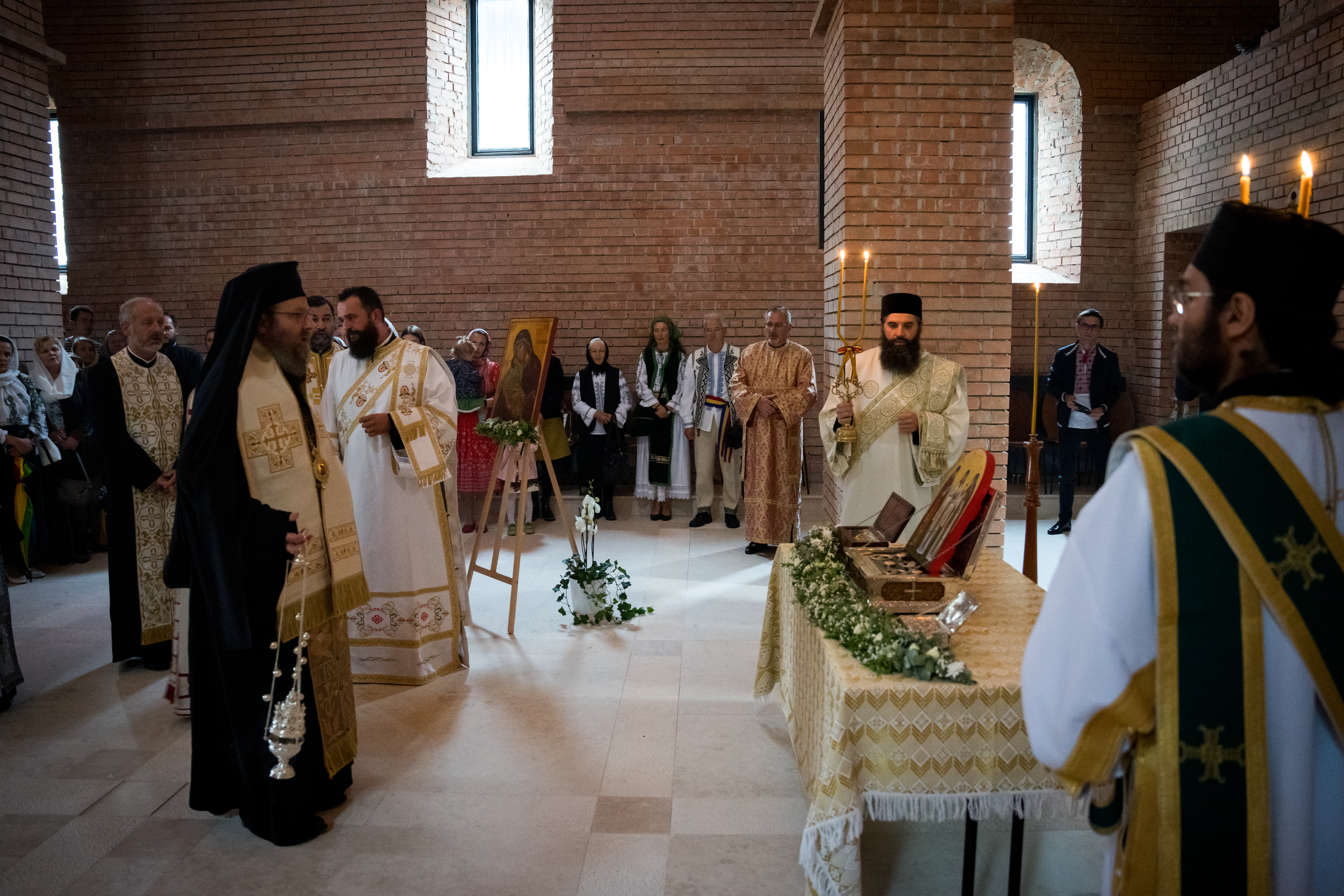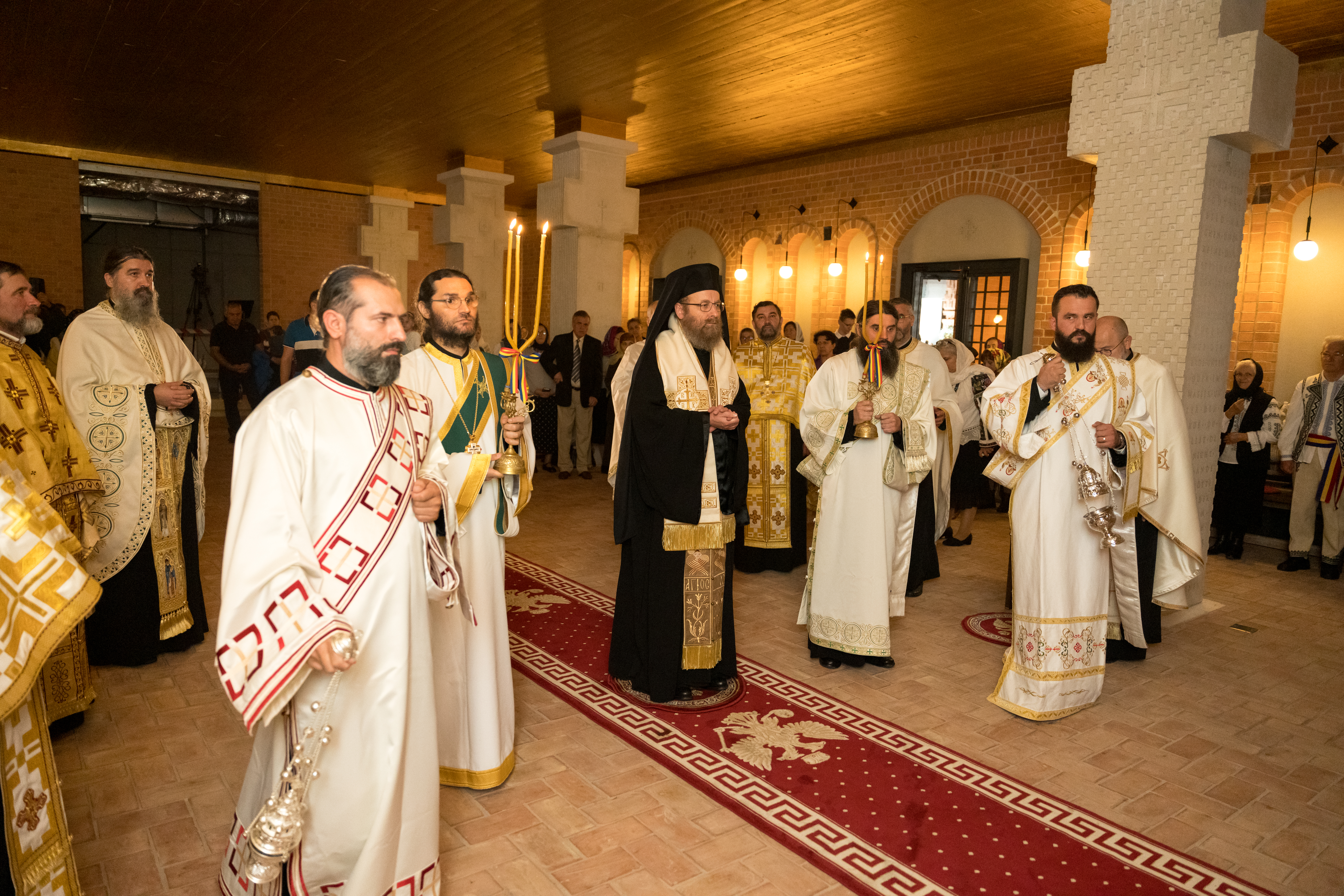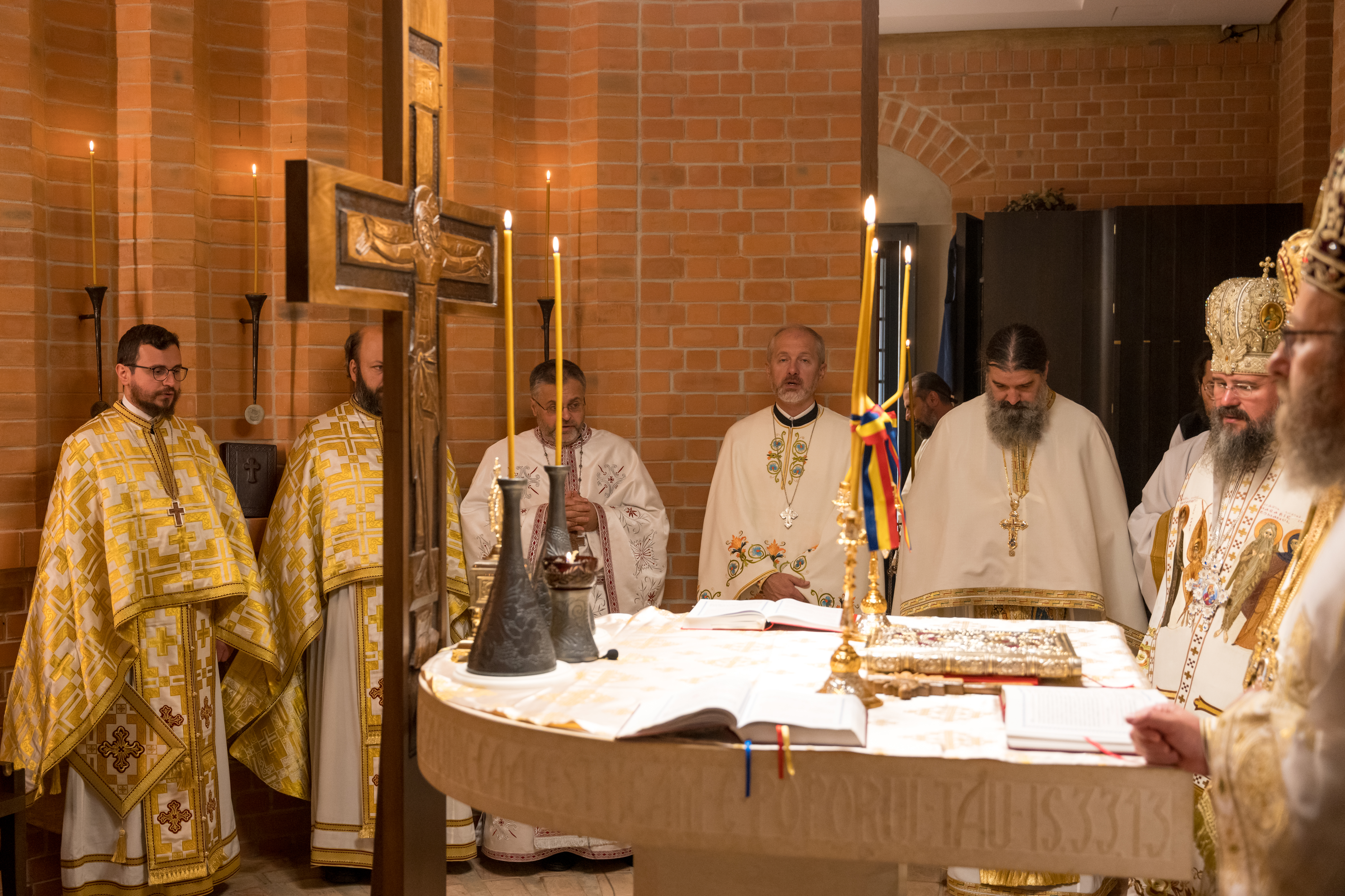Slujba de sfințire a altarului a fost săvârșită duminică dimineața de către Înaltpreasfințitul Părinte Serafim Joantă, Mitropolitul Ortodox Român al Germaniei, Europei Centrale și de Nord, împreună cu Preasfințitul Părinte Macarie Drăgoi, Episcopul Ortodox Român al Europei de Nord și cu Preasfințitul Părinte Sofian Brașoveanul, Episcop-vicar al Arhiepiscopiei Germaniei, Austriei și Luxemburgului, înconjurați de un numeros sobor de clerici, din care au făcut parte și părintele stareț Nectarie Clinci și Părintele Matei Bilauca, starețul Mănăstirii de la Șinca Nouă, județul Brașov, și cu participarea unui mare număr de credincioși.
