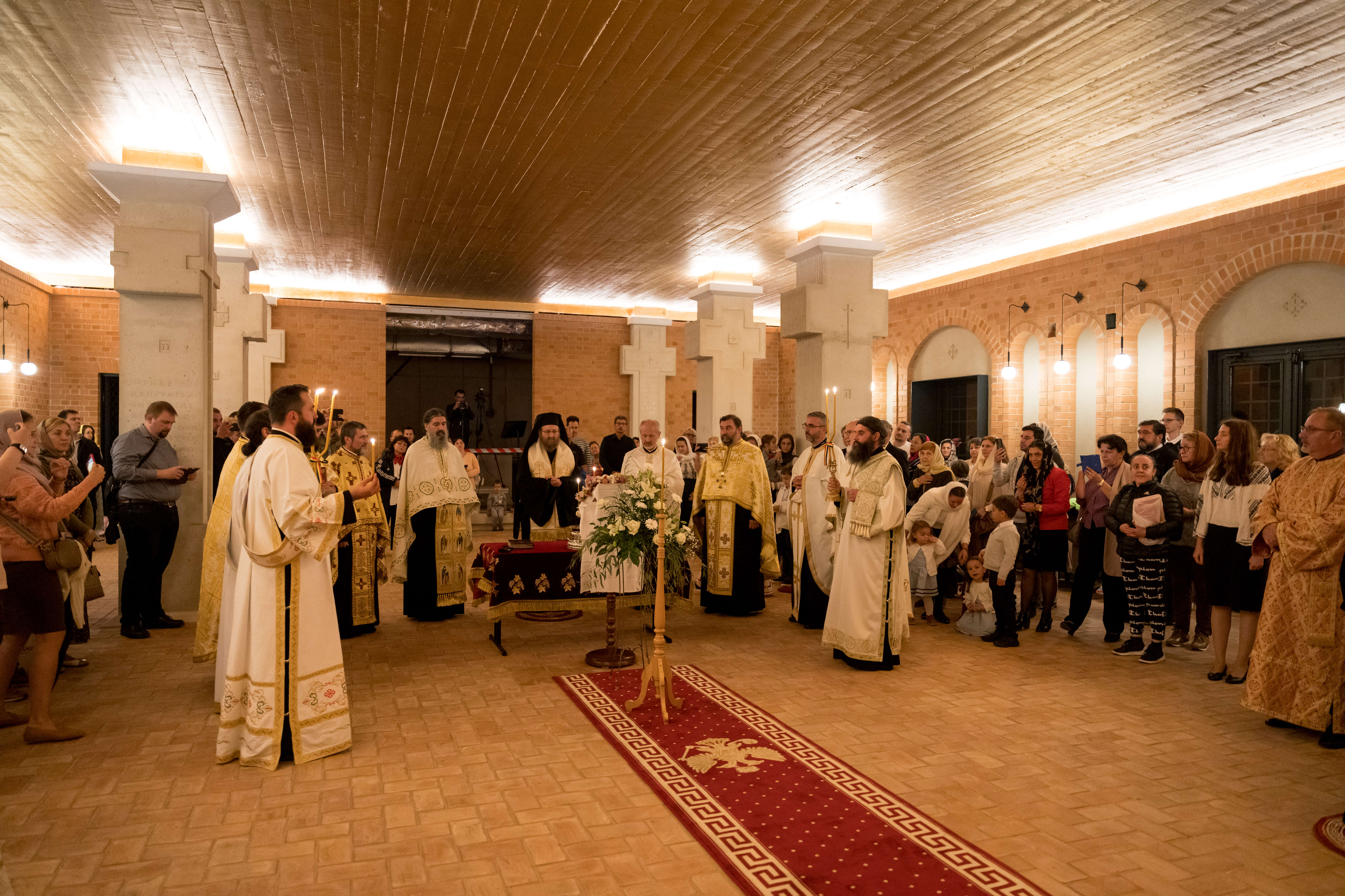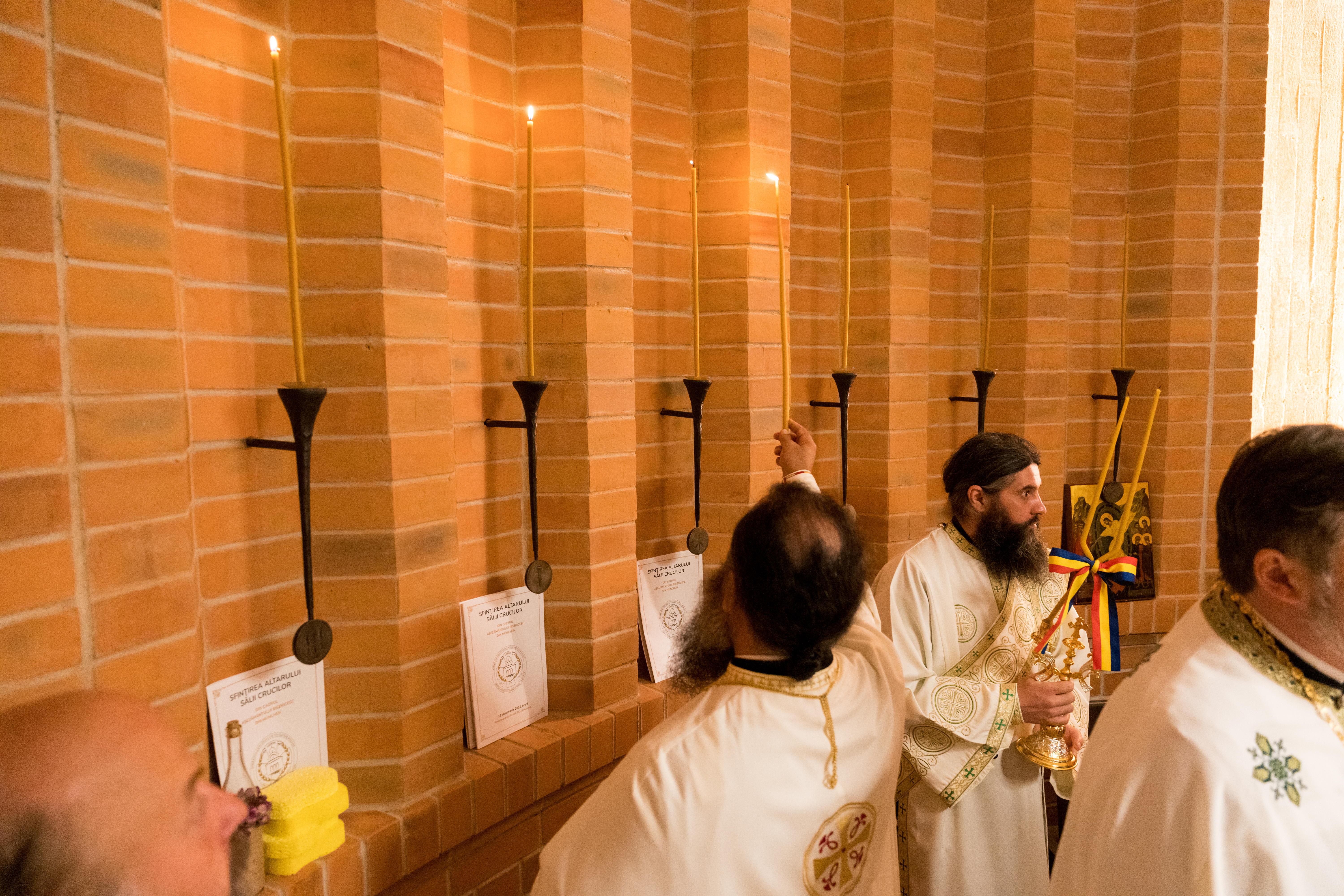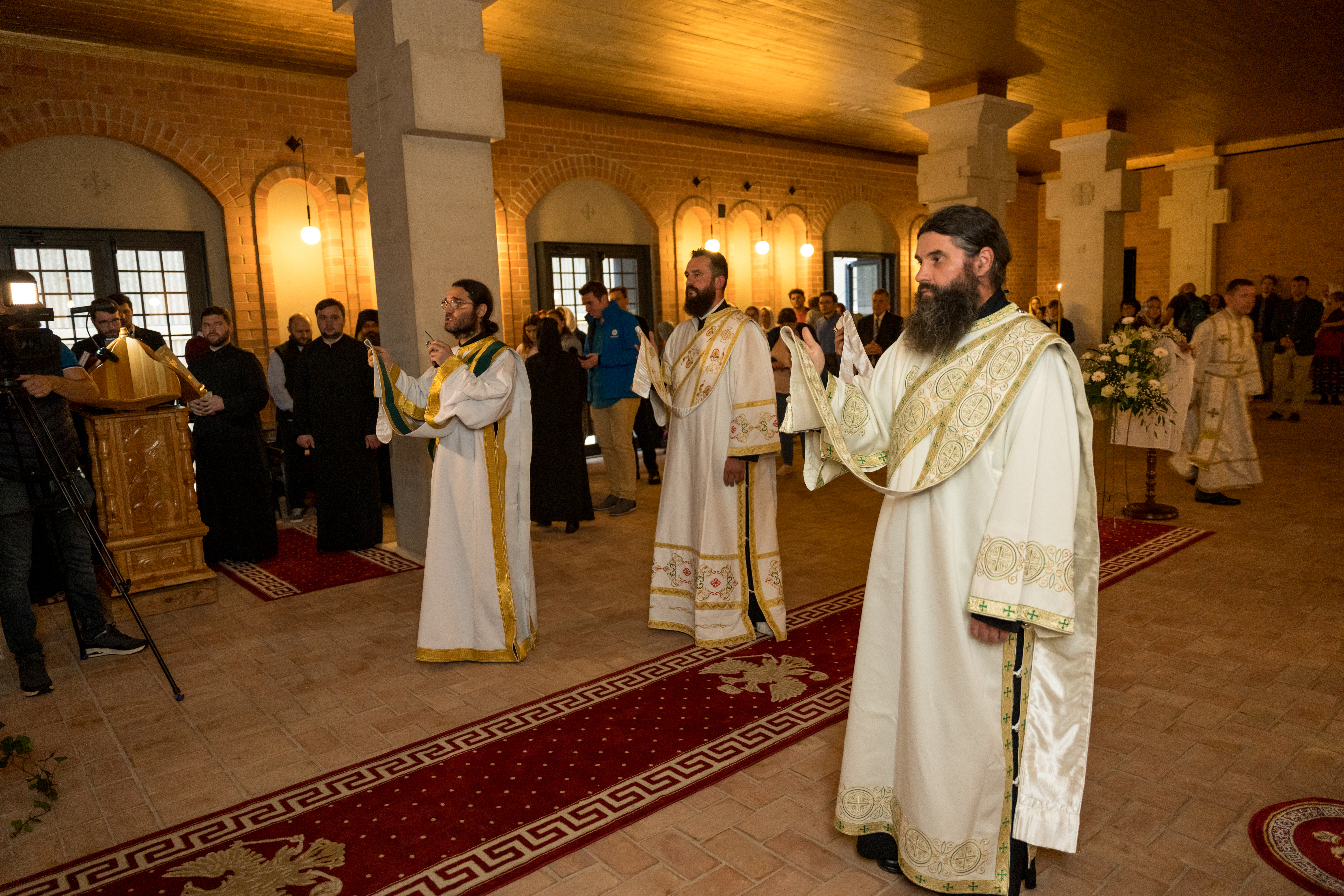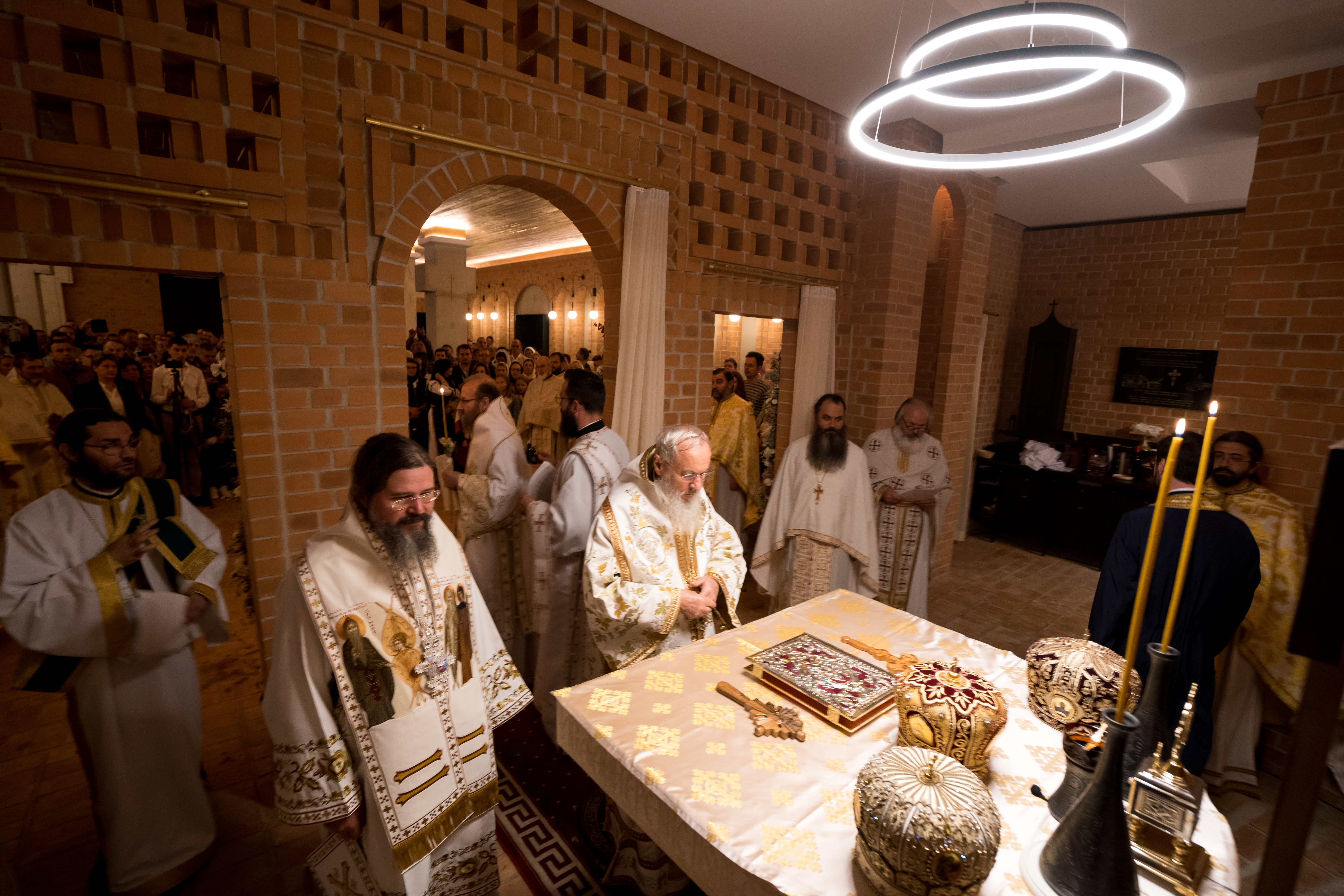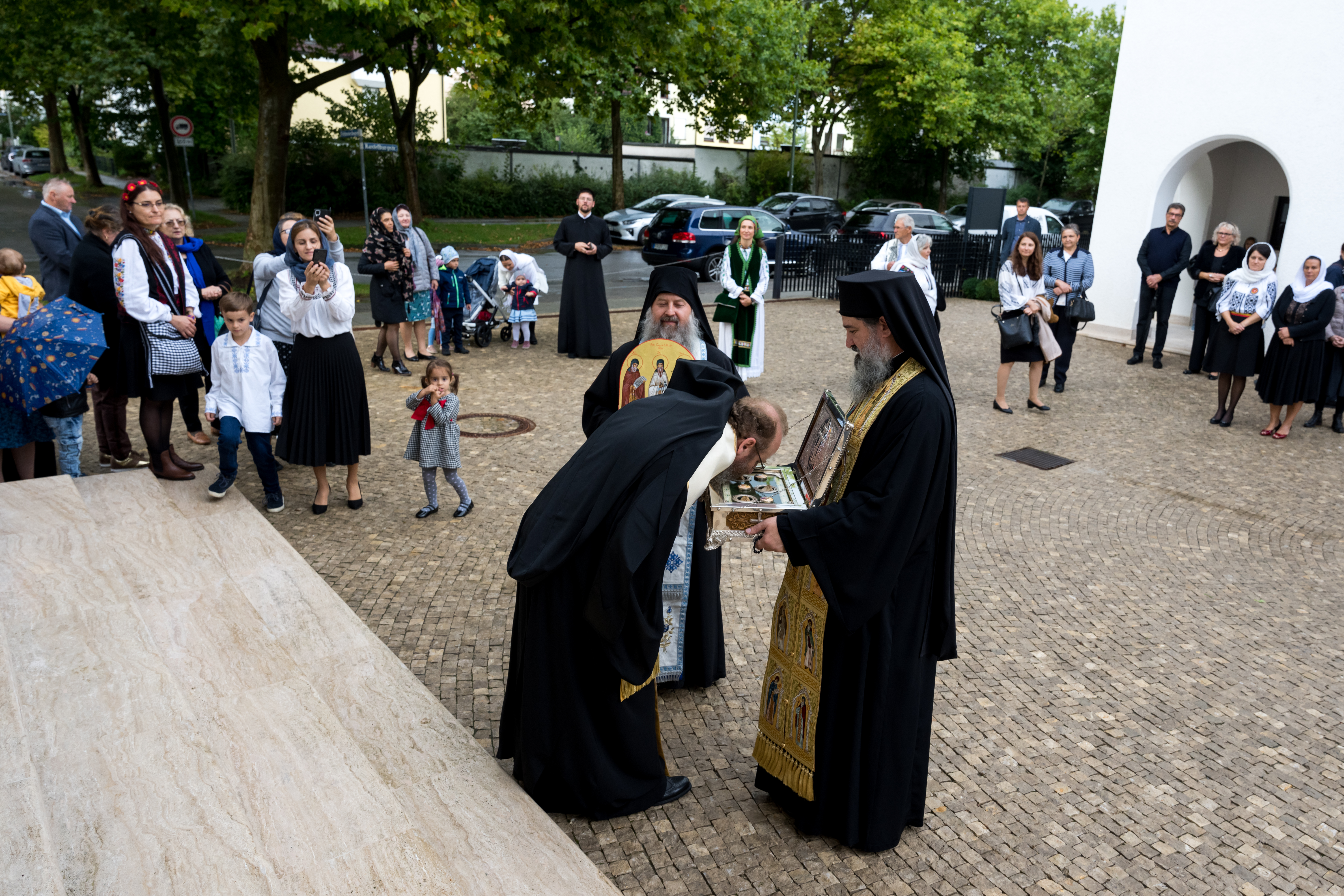 Slujba de sfințire a altarului a fost săvârșită duminică dimineața de către Înaltpreasfințitul Părinte Serafim Joantă, Mitropolitul Ortodox Român al Germaniei, Europei Centrale și de Nord, împreună cu Preasfințitul Părinte Macarie Drăgoi, Episcopul Ortodox Român al Europei de Nord și cu Preasfințitul Părinte Sofian Brașoveanul, Episcop-vicar al Arhiepiscopiei Germaniei, Austriei și Luxemburgului, înconjurați de un numeros sobor de clerici, din care au făcut parte și părintele stareț Nectarie Clinci și Părintele Matei Bilauca, starețul Mănăstirii de la Șinca Nouă, județul Brașov, și cu participarea unui mare număr de credincioși.