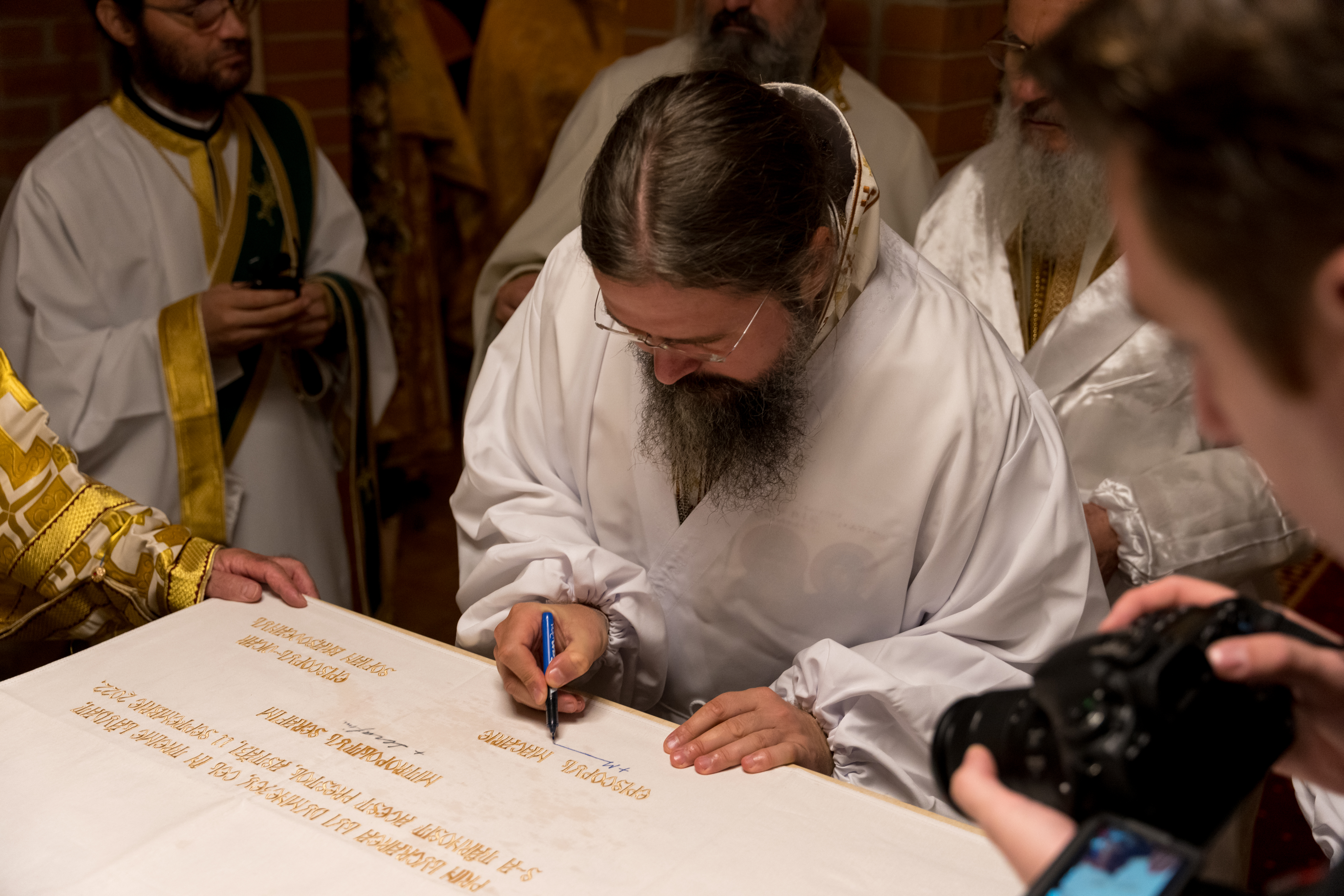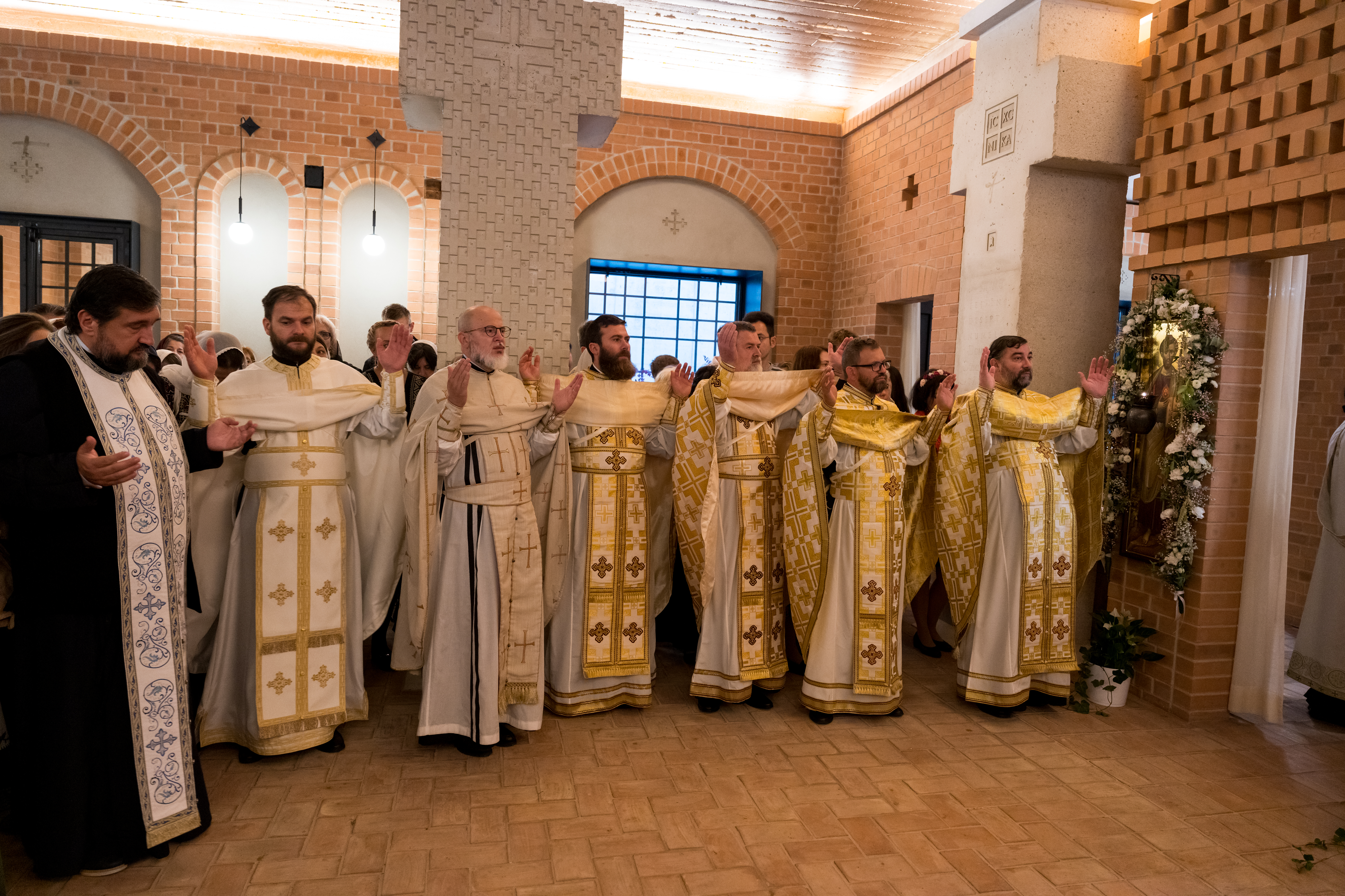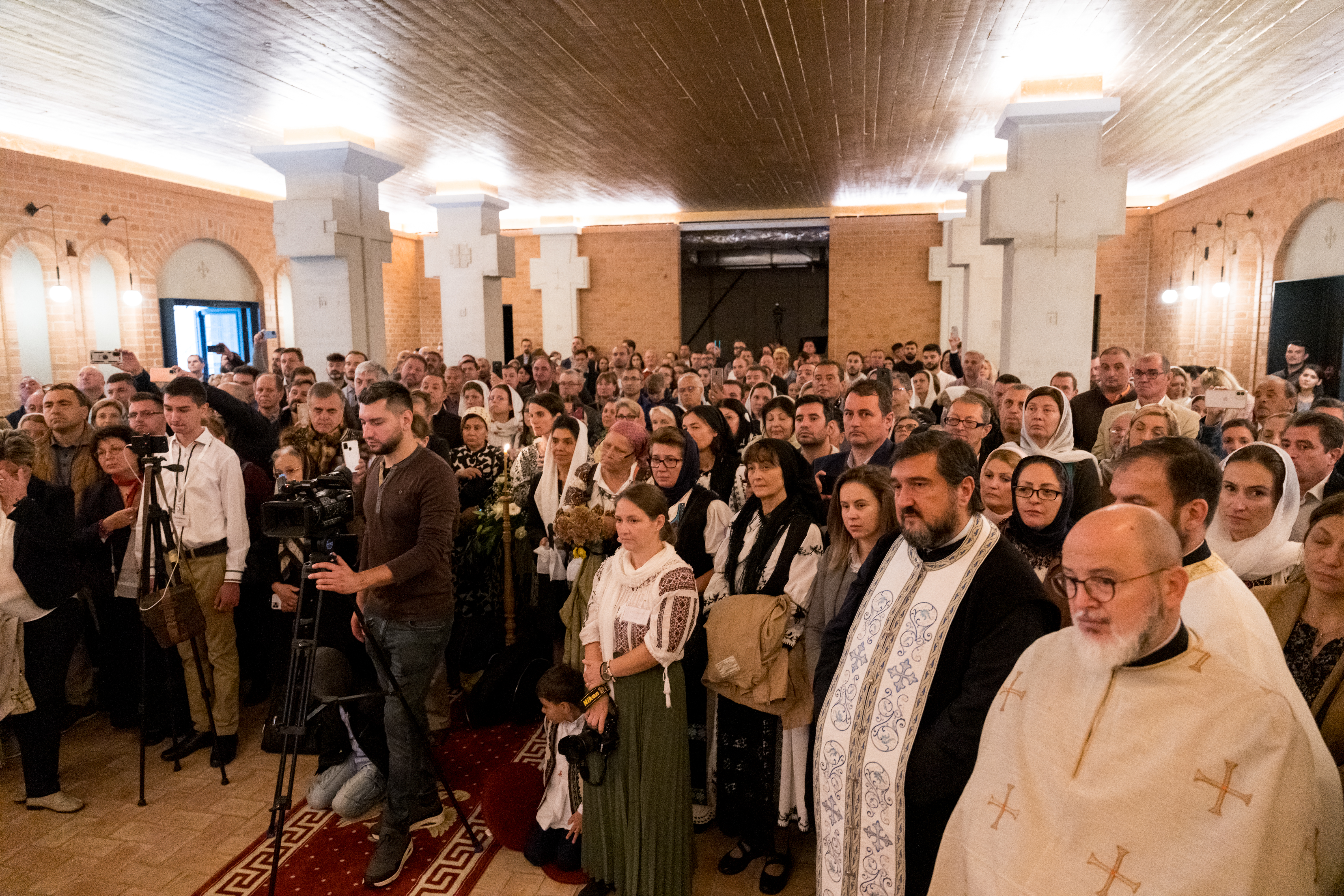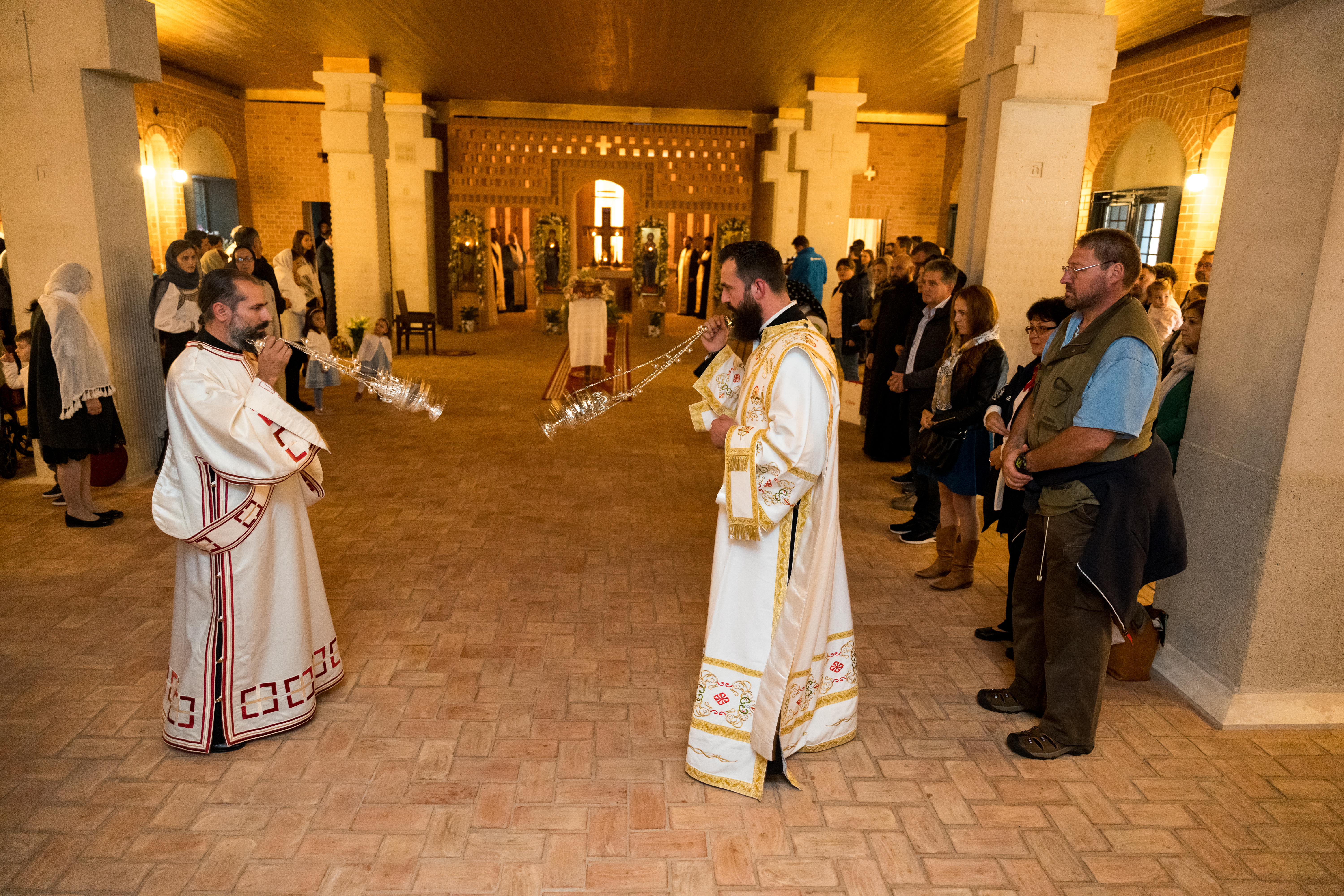 Slujba de sfințire a altarului a fost săvârșită duminică dimineața de către Înaltpreasfințitul Părinte Serafim Joantă, Mitropolitul Ortodox Român al Germaniei, Europei Centrale și de Nord, împreună cu Preasfințitul Părinte Macarie Drăgoi, Episcopul Ortodox Român al Europei de Nord și cu Preasfințitul Părinte Sofian Brașoveanul, Episcop-vicar al Arhiepiscopiei Germaniei, Austriei și Luxemburgului, înconjurați de un numeros sobor de clerici, din care au făcut parte și părintele stareț Nectarie Clinci și Părintele Matei Bilauca, starețul Mănăstirii de la Șinca Nouă, județul Brașov, și cu participarea unui mare număr de credincioși.