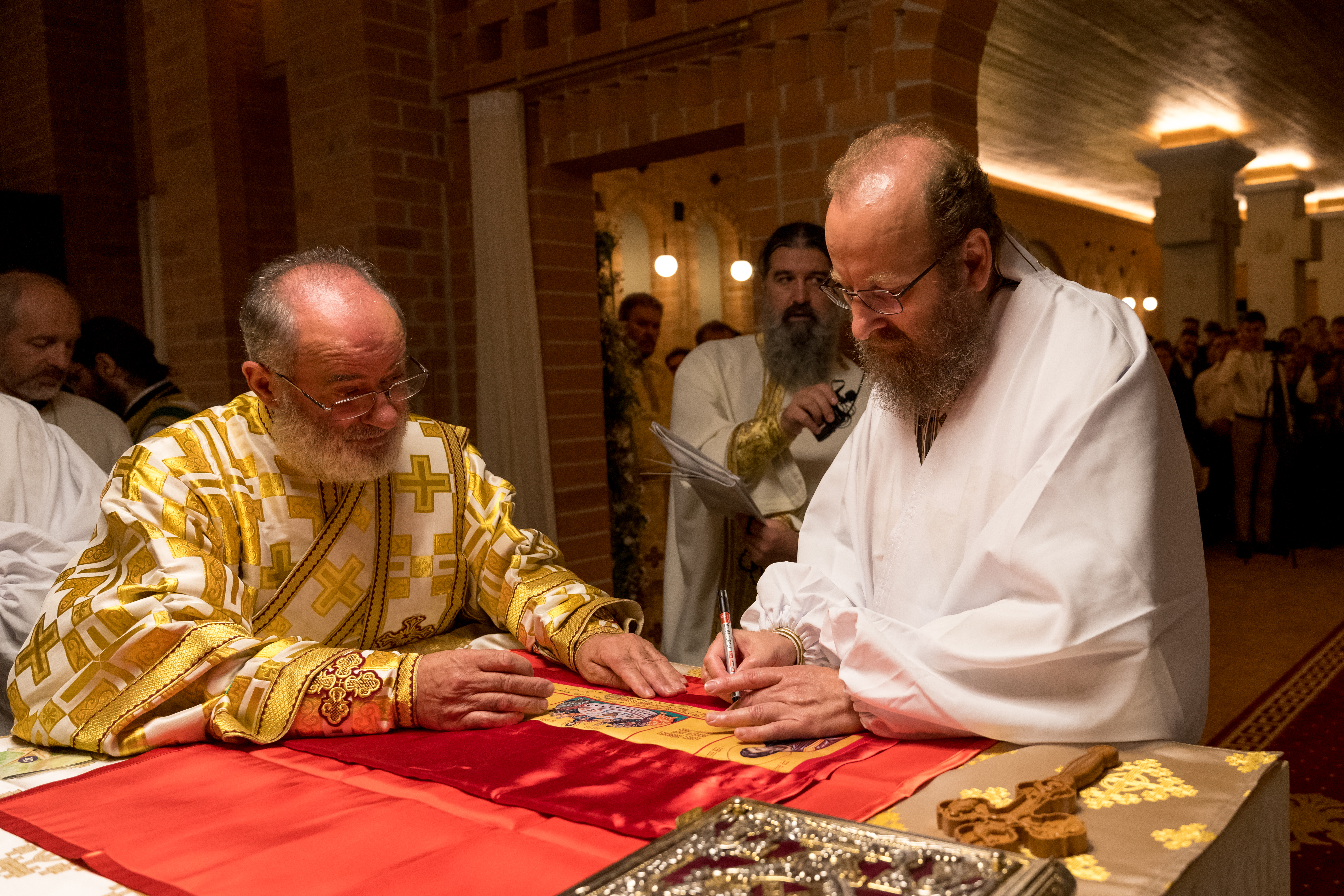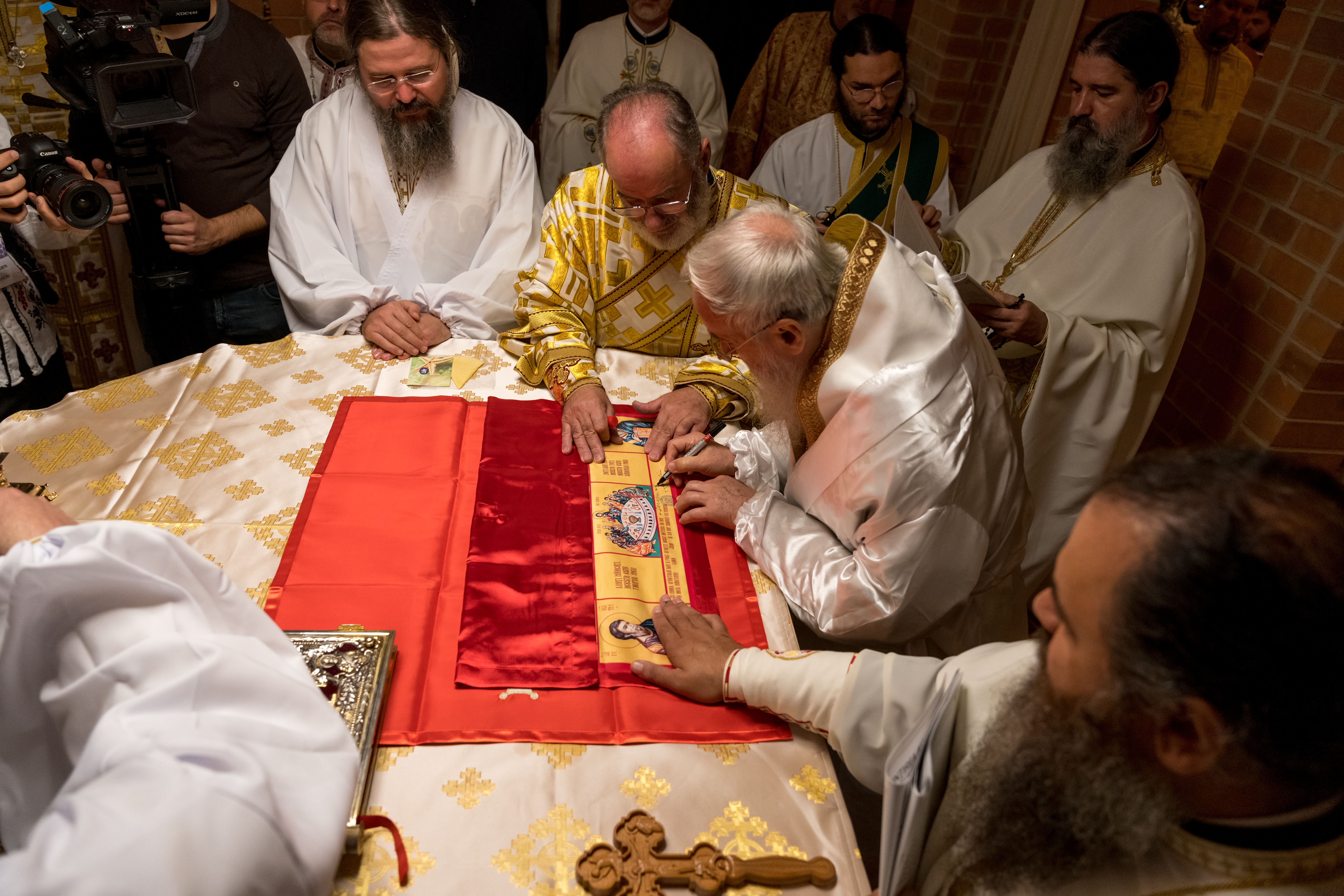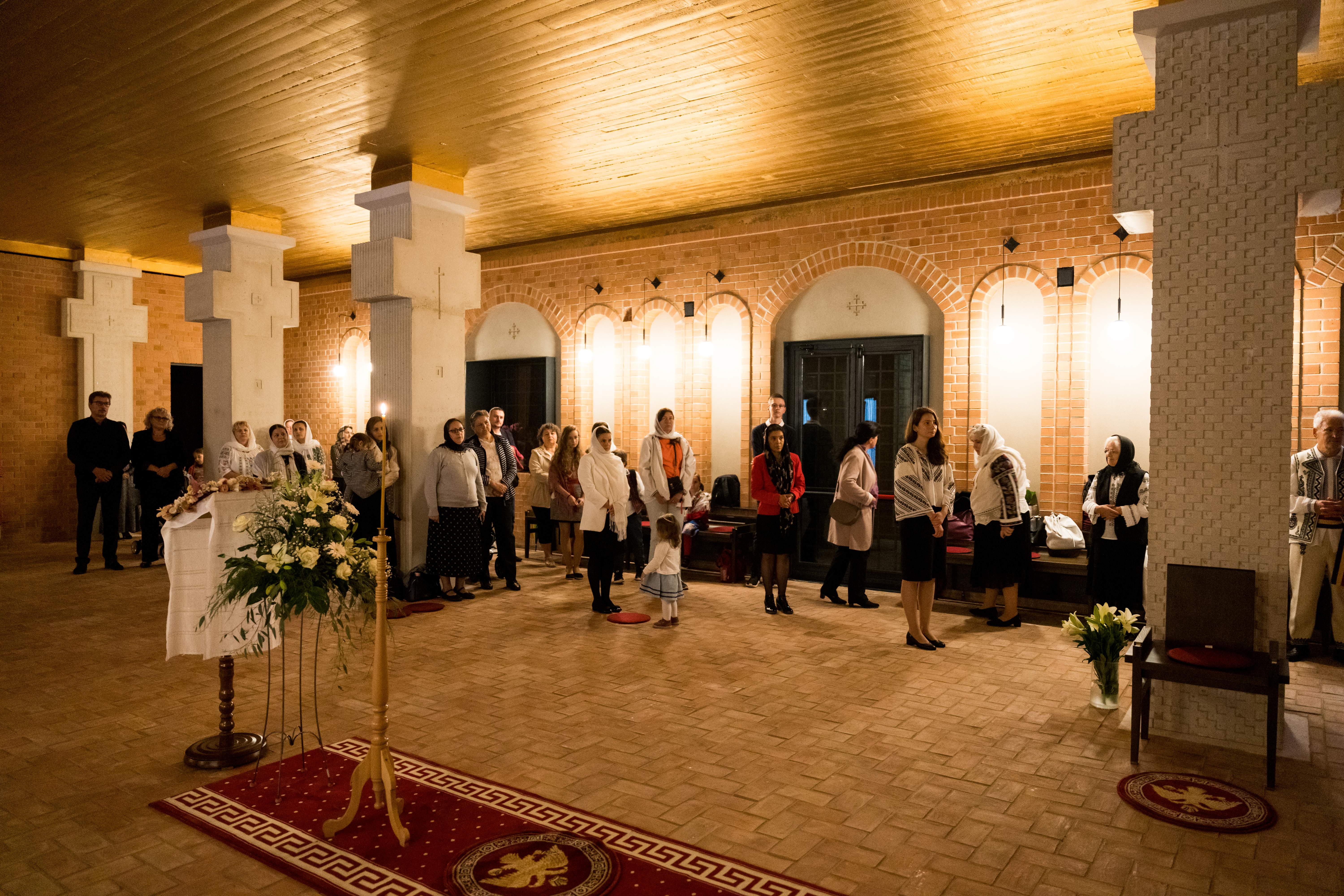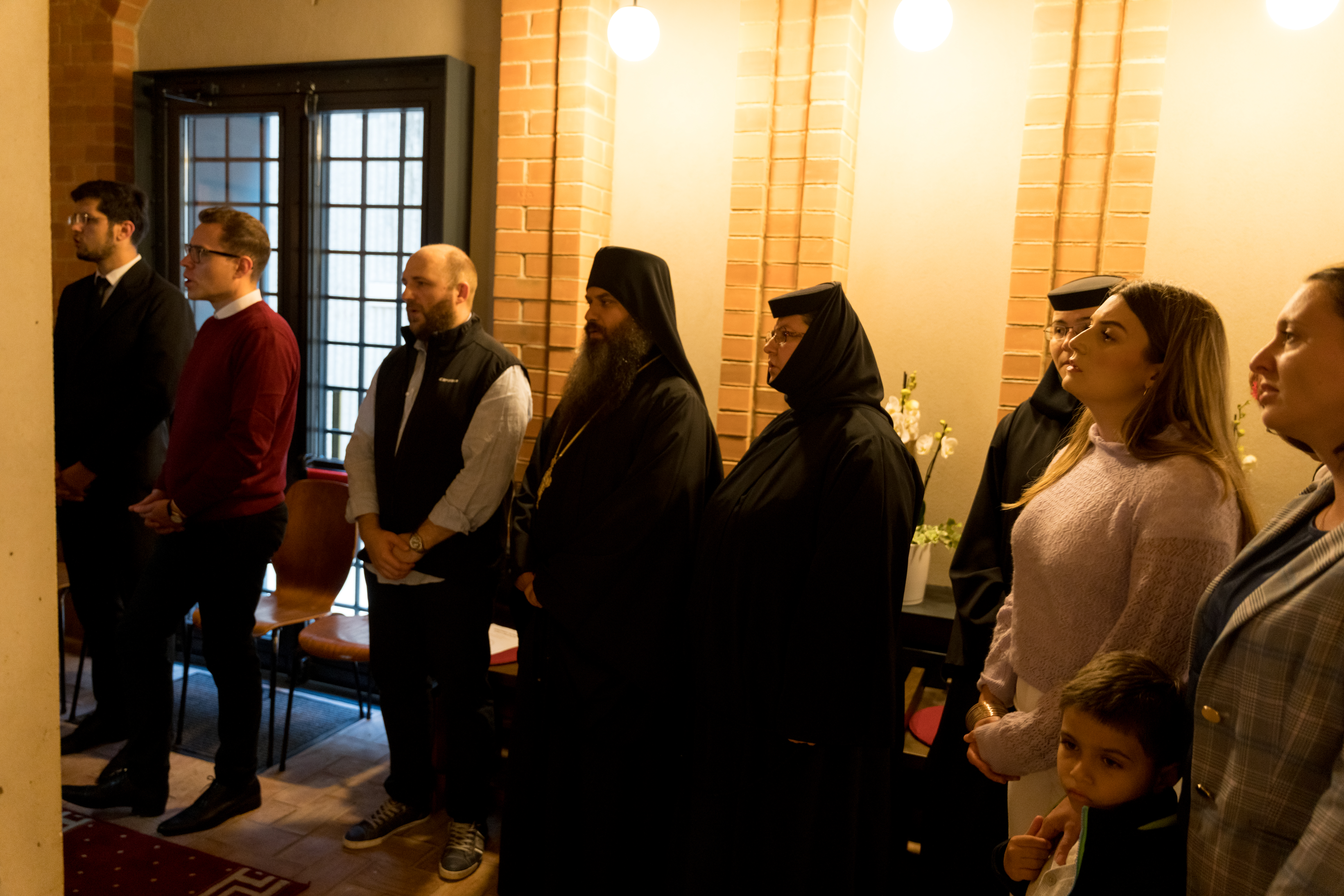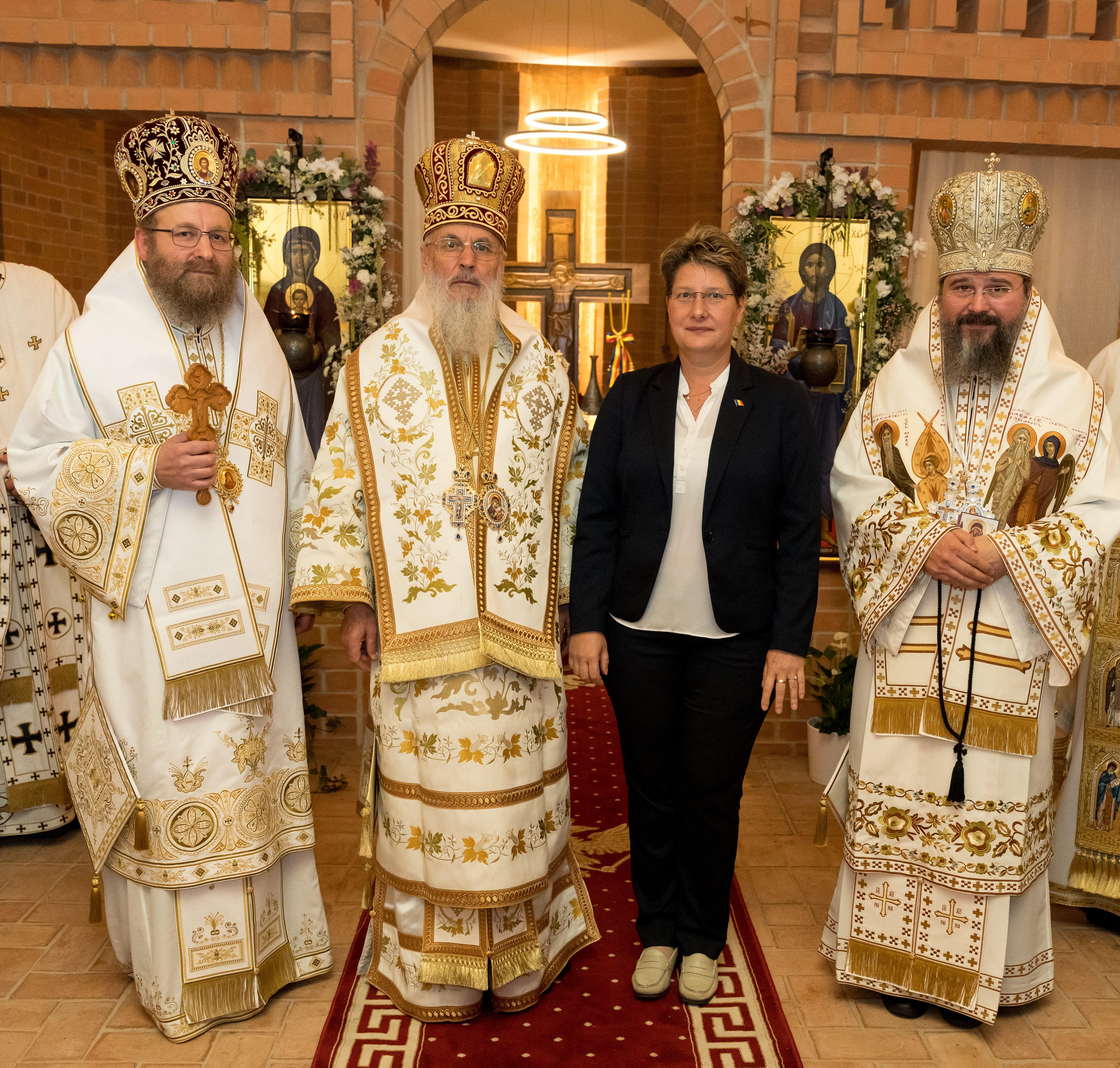 Slujba de sfințire a altarului a fost săvârșită duminică dimineața de către Înaltpreasfințitul Părinte Serafim Joantă, Mitropolitul Ortodox Român al Germaniei, Europei Centrale și de Nord, împreună cu Preasfințitul Părinte Macarie Drăgoi, Episcopul Ortodox Român al Europei de Nord și cu Preasfințitul Părinte Sofian Brașoveanul, Episcop-vicar al Arhiepiscopiei Germaniei, Austriei și Luxemburgului, înconjurați de un numeros sobor de clerici, din care au făcut parte și părintele stareț Nectarie Clinci și Părintele Matei Bilauca, starețul Mănăstirii de la Șinca Nouă, județul Brașov, și cu participarea unui mare număr de credincioși.