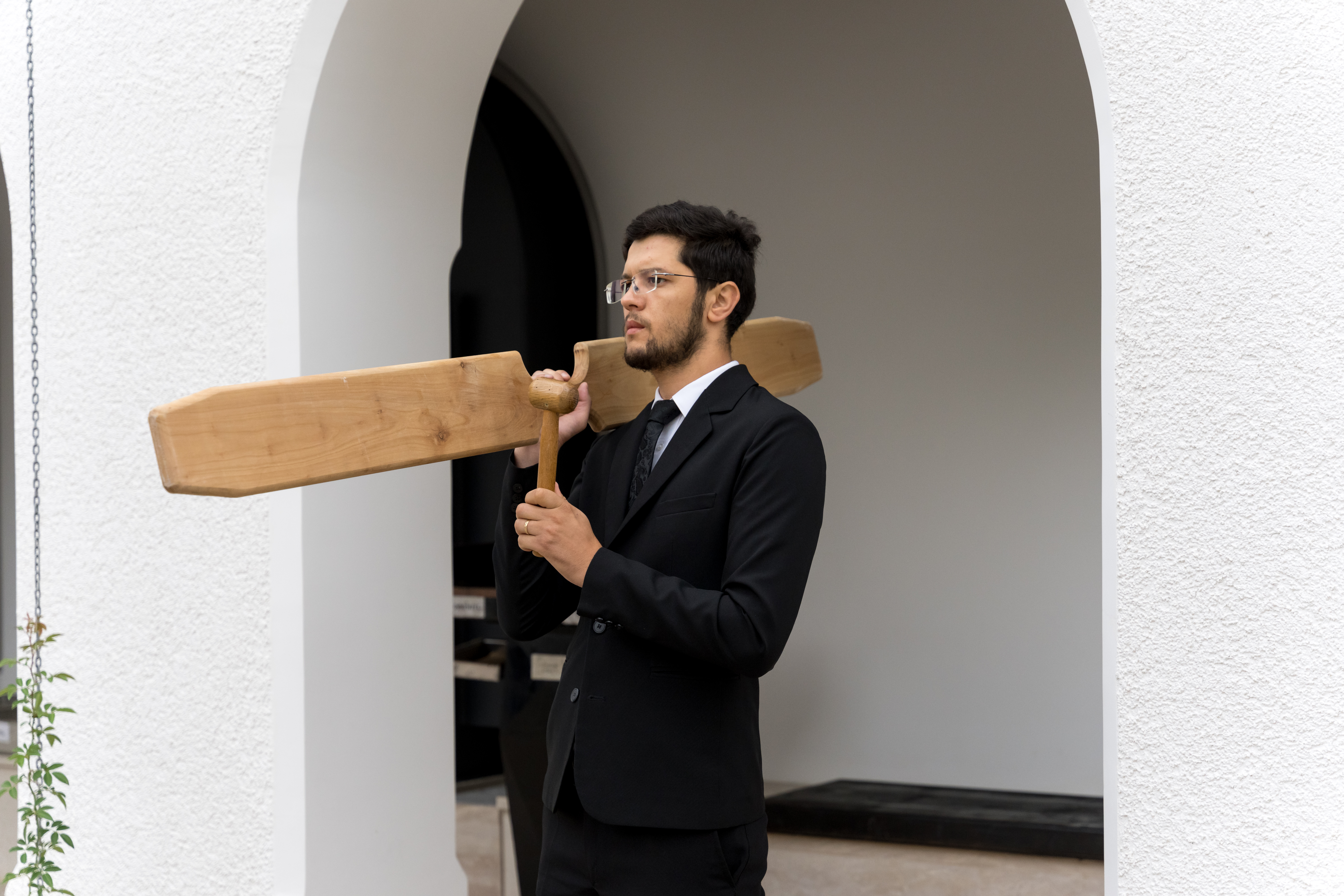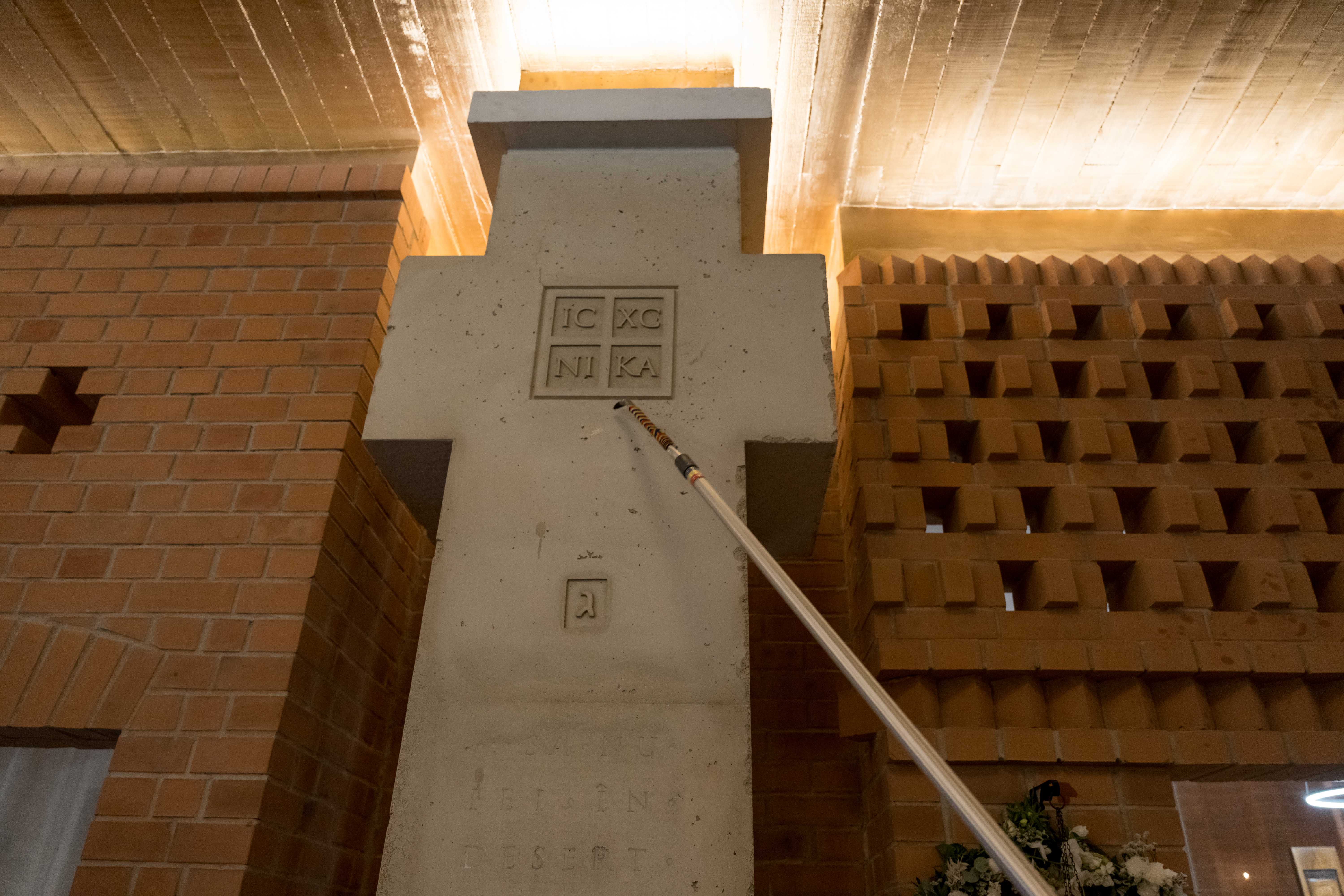 Nu știu dacă noi l-am ales pe Sf. Proroc Moise sau el ne-a ales pe noi, ca să fie hram aici, jos. Totul a început de la aceste coloane cruciforme, care sunt și stâlpii portanți ai bisericii pe care sunt înscrise, în română și germane, cele zece porunci. Dumnezeu nu se impune cu evidență cuiva, ci se lasă căutat, se lasă descoperit. De aceea se află multe elemente care se lasă descifrate în tot ansamblul acesta, vrând să ne spună că spre Dumnezeu trebuie să mergem cu căutare, cu delicatețe ca să-L găsim. Având cele 10 Porunci, am ajuns la gândul că Sfântul Proroc Moise este destul de puțin avut în cinstire, în pomenire în Biserica noastră Ortodoxă și ne-am gândit să-l punem și ca hram al acestei Săli a Crucilor, care este destinată să fie sală parohială, sală comunitară multifuncțională, pentru întâlniri, pentru agape, pentru conferințe, pentru nevoile comunității, inclusiv pentru nevoile de cult: pentru a transmite Sf. Liturghie când o să săvârșim Sf. Liturghie sus, în biserică, după pictarea bisericii, pentru mamele cu copii sau tații cu copii care vor sta aici, respectiv pentru a săvârși o a doua Sfântă Liturghie aici.