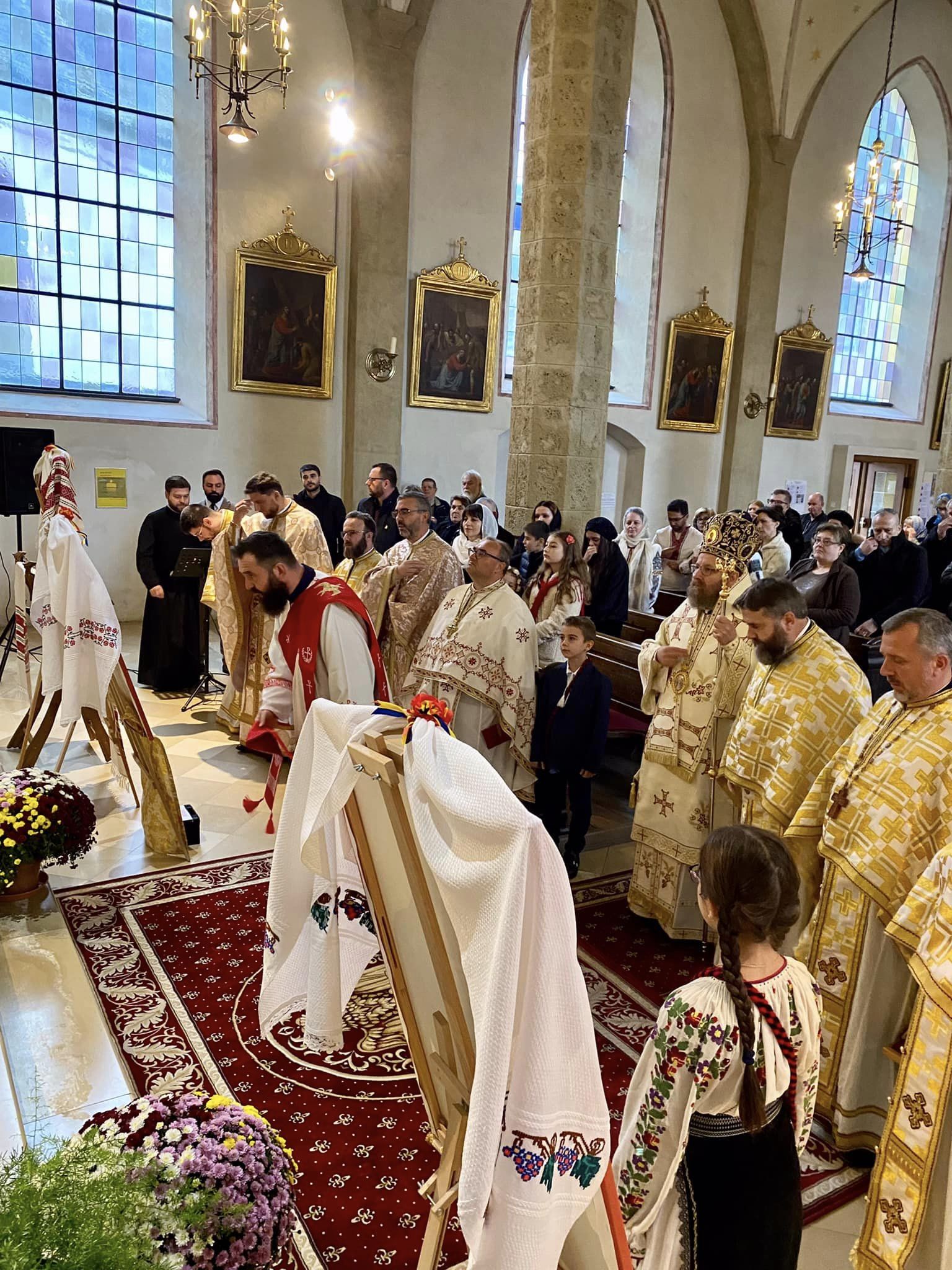 Sărbătoarea a debutat cu un program liturgic deosebit. Dumnezeiasca Liturghie arhierească a fost oficiată de PS Sofian Brașoveanul în sobor numeros de treisprezece preoți veniți împreună cu pelerini de la diferite parohii din Austria și Germania: pr. paroh Daniel Stan, pr. Dumitru Viezuianu (Salzburg), pr. Mircea Oniga (Innsbruck), pr. Constantin Bartok (Traunreut), pr. Visarion Ipati (Klagenfurt), pr. Liviu Ghioc (Zell am See), pr. Cătălin Horvath (Gleisdorf), pr. Alexandru Chinta (Vöcklabruck), pr. Gabriel Peltea (Oberwart), pr. Ovidiu Cozma (Feldkirch), pr. Petru Deaconu (München), pr. Vasile Melinte (Wels) și pr. Cătălin Soare (St. Pölten). Slujba s-a desfășurat în catedrala ”Sf. Vitus” (edificiu impresionant datând din secolul al XV-lea) și care a fost martoră evenimentelor tragice petrecute acum aproape 300 de ani în urmă.