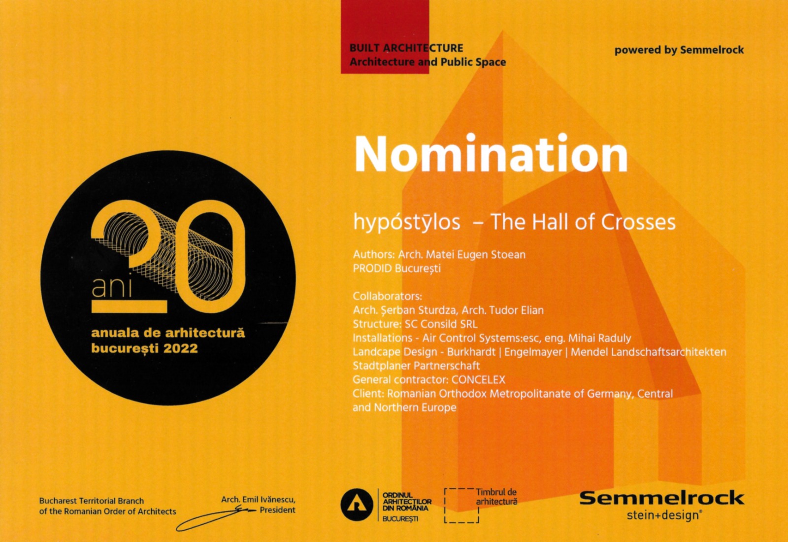 De asemenea, Sala Crucilor din cadrul Așezământului Bisericesc a primit nominalizarea pentru Secţiunea „Arhitectură construită / arhitectură şi spaţiul public” a aceleiaşi Anuale de Arhitectură București 2022. În mod deosebit, mulţumim domnilor arhitecţi proiectanţi Serban Sturdza, Matei Stoean şi Tudor Elian, care au decis ca trofeul primit odată cu aceasă nominalizare să fie oferit spre a se păstra în cadrul Centrului Bisericesc.