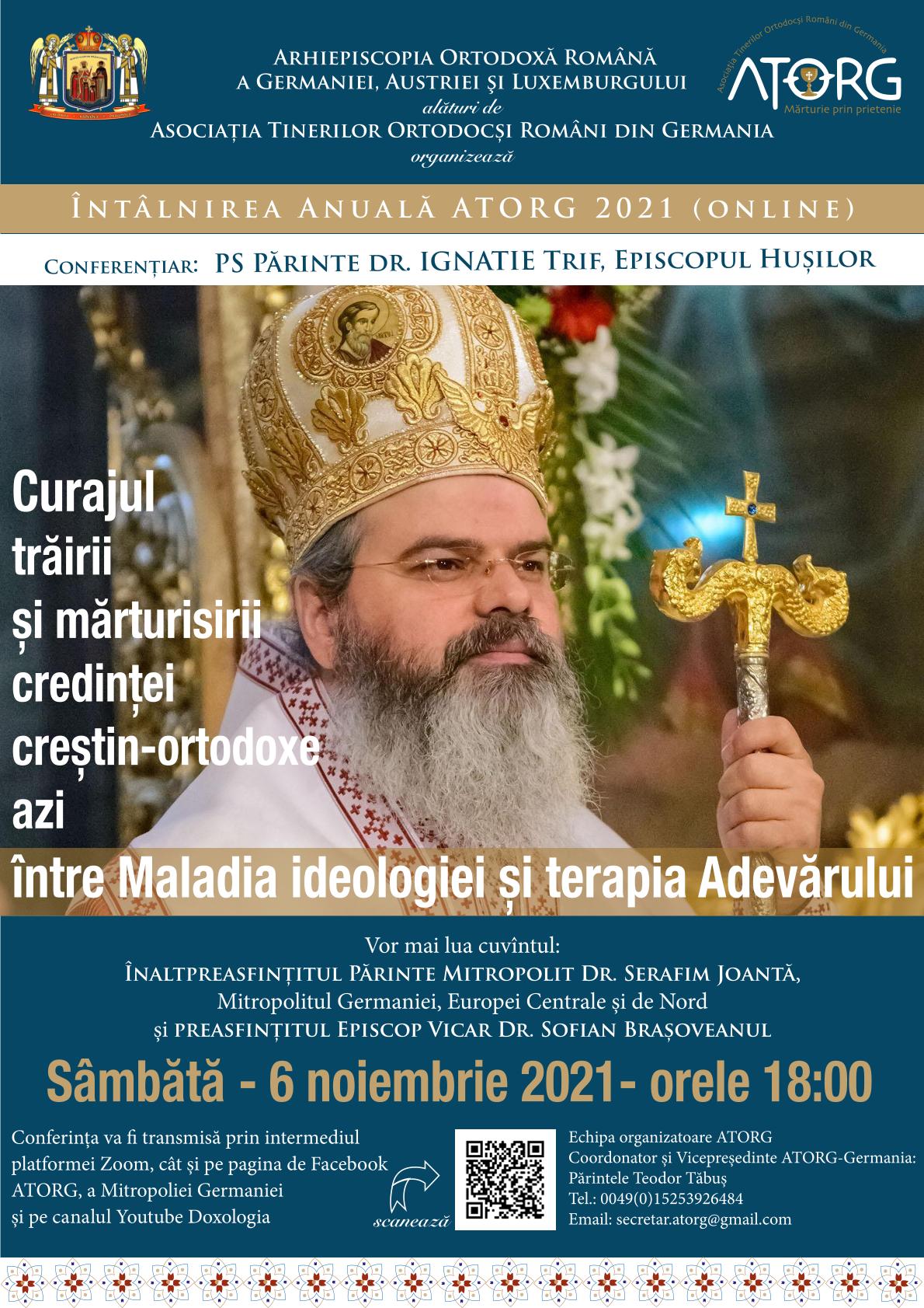 Asociația Tinerilor Ortodocși Români din Germania (ATORG), cu binecuvântarea ÎPS Părinte Mitropolit Dr. Serafim Joantă, sub preşedinţia Preasfințitului Părinte Episcop Vicar Dr. Sofian Braşoveanul, vă invită pe data de 06 noiembrie 2021, ora 18:00 (ora Germaniei), să luați parte la conferința anuală online pe platforma Zoom, avându-l ca invitat pe Preasfințitul Părinte Ignatie, Episcopul Hușilor. Conferința va avea ca temă de dezbatere: „Curajul trăirii și al mărturisirii credinței creștin-ortodoxe azi între Maladia ideologiei și terapia Adevărului”.