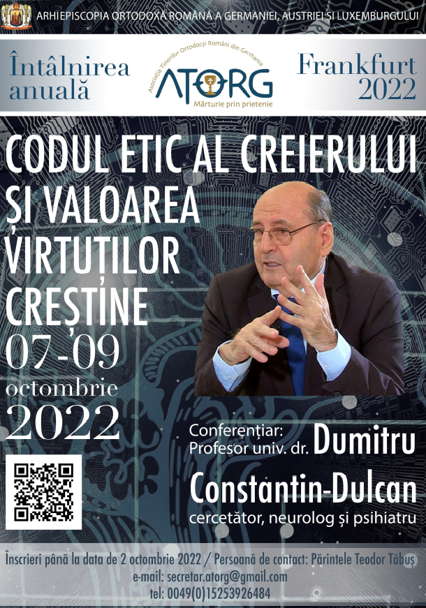 Asociația Tinerilor Ortodocși Români din Germania (ATORG), cu binecuvântarea ÎPS Părinte Mitropolit Serafim, sub preşedinţia PS Episcop Vicar Sofian Braşoveanul, vă invită în perioada 07-09 oct. 2022, la Frankfurt, la întâlnirea anuală a membrilor și susținătorilor săi. Mai multe detalii despre programul evenuimentului, dar și informații cu privire la înscrierea la eveniment găsiți aici.