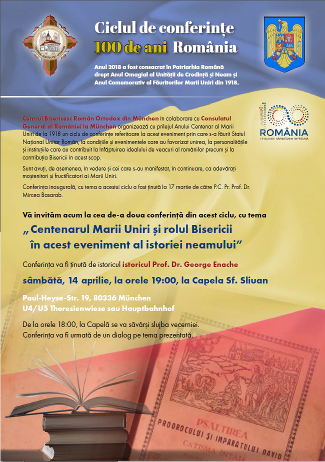 În cadrul ciclului de conferinţe 100 de ani România, organizat de Centrul Bisericesc Român Ortodox din München în colaborare cu Consulatul General al României la München cu prilejul Anului Centenar al Marii Uniri de la 1918, Vă invităm la cea de-a doua conferinţă a acestui ciclu. Conferinţa cu tema „Centenarul Marii Uniri și rolul Bisericii în acest eveniment al istoriei neamului” va fi ţinută de istoricul Prof. Dr. George Enache, sâmbătă, 14 aprilie, la Capela Sf. Sliuan, de la orele 19:00.