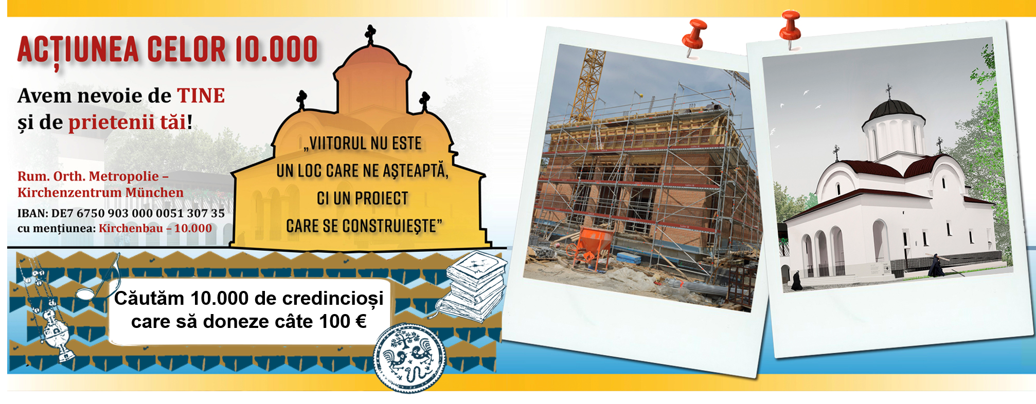 Până la 31 decembrie 2018, acţiunea celor 10.000, prin care am urmărit câştigarea a 10.000 de donatori care să doneze câte 100 € pentru construcţia Aşezământului, a strâns laolaltă 1.730 de donatori, care, împreună, au donat 416.000 €. Având în vedere această stare de lucruri, prelungim şi în anul 2019 această acţiune cu speranţa că se vor mai adăuga şi alţi donatori la cei 10.000 scontaţi. Constatăm cât de puţini sunt de fapt cei care se implică şi faţă de care mulţumirea noastră este cu atât mai mare. Se confirmă puterea cuvântului: „La lucruri bune puţini se adună, dar mult puţinii buni împreună”.