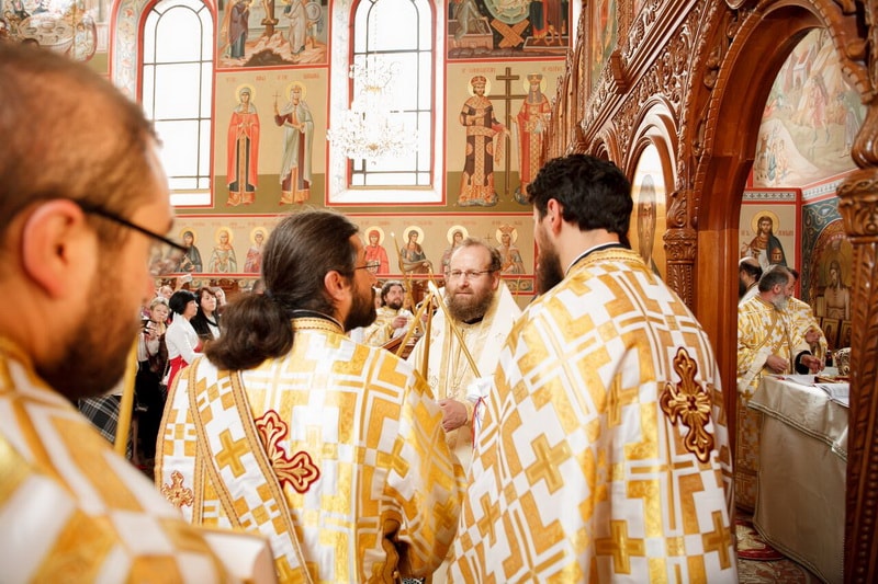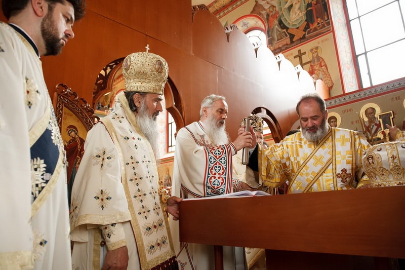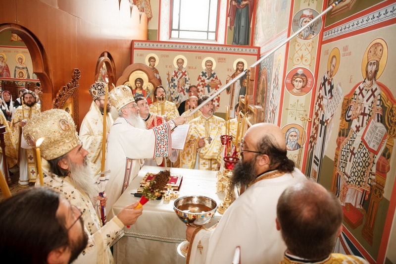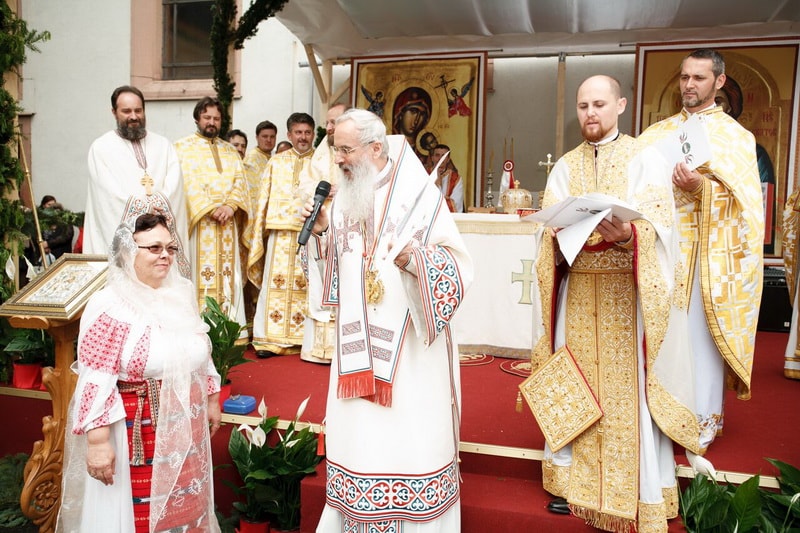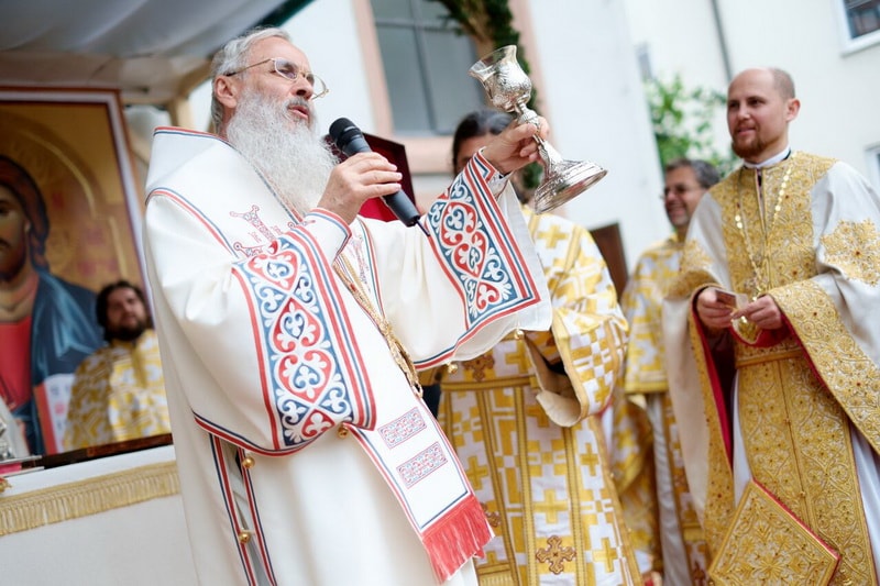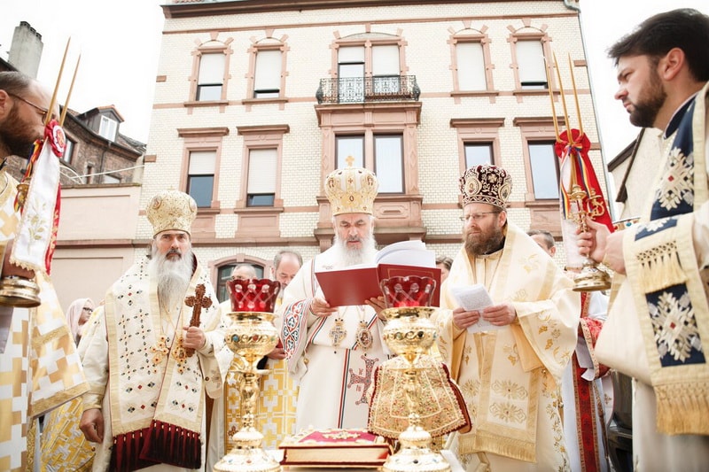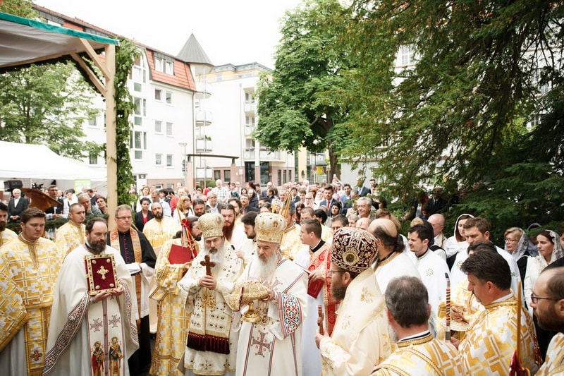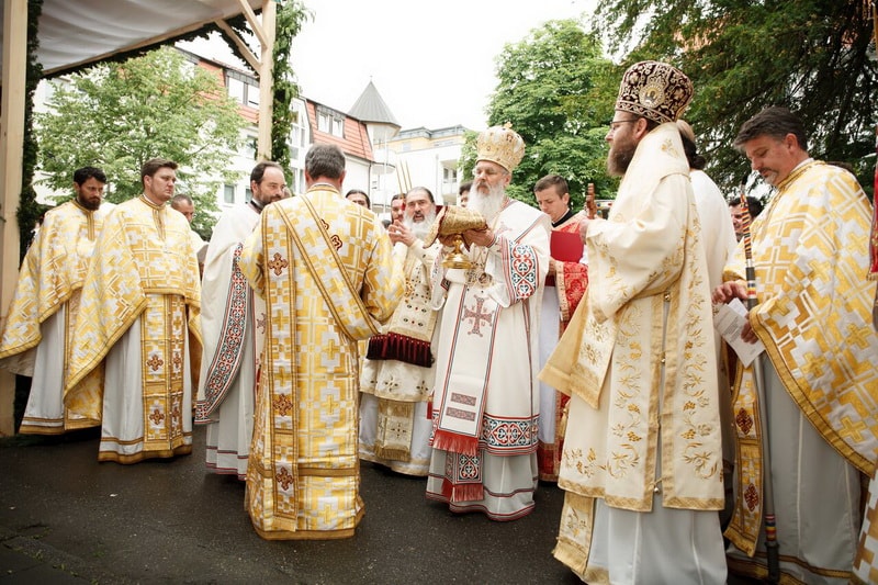 După slujba de sfinţire, Sfânta Liturghie arhierească a fost săvârşită ce către cei ierarhi prezenți pe scena organizată lângă biserică. La dumnezeiasca slujbă au participat numeroşi preoţi şi credincioşi din Germania şi România, precum și oficialități locale. Cuvântul de învăţătură a fost rostit de către ÎPS Teodosie, care pornind de la importanţa cinstirii Sfinţilor Părinţi de la Sinodul I Ecumenic şi de la importanţa cunoaşterii dreptei credinţe, a îndemnat pe credincioşi să îşi mărturisească credinţa ortodoxă oriunde se găsesc, în primul rând dând dovadă de dragoste creştină pentru toţi cei din jur. Corul bizantin „Evloghia” din București, condus de Pr. Marius Militaru, a dat răspunsurile liturgice la strană.