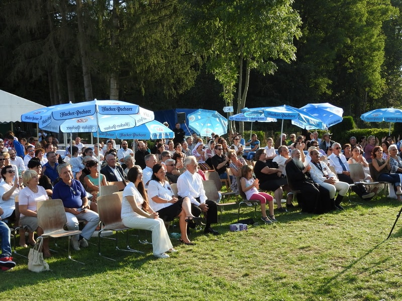 După slujba de sfinţire, Sfânta Liturghie arhierească a fost săvârşită la altarul de vară ce către cei patru ierarhi prezenți la altarul de vară, construit lângă biserică. La dumnezeiasca slujbă au participat preoţi, diaconi şi numeroși credincioşi din Germania şi România. După citirea Sfintei Evanghelii, cuvântul de învăţătură a fost rostit de către ÎPS Andrei, care a vorbit credicioșilor despre importanța Crucii, semn al marii smerenii a Fiului lui Dumnezeu, care s-a întrupat și a pătimit pentru toți oamenii. Corul „Agapia” al Parohiei, precum și un grup de tineri teologi de la Cluj, au dat răspunsurile liturgice la strană.