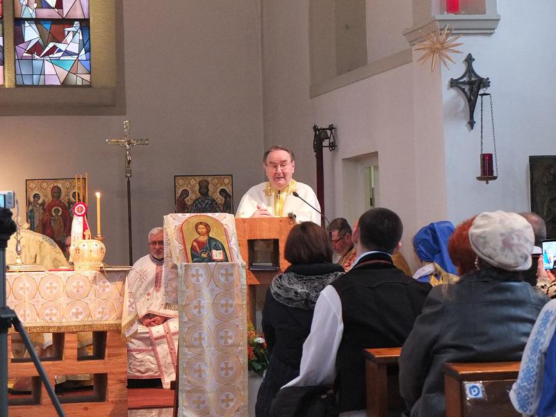 În cuvântul de învățătură, Înaltpreasfințitul Serafim a vorbit despre importanța evenimentului jubiliar, amintind că pentru mulți români plecați în Occident Biserica le-a fost casă și „mamă”, după cum odinioară scria poetul Mihai Eminescu. În sânul Bisericii, credinicioșii învață să iubească pe aproapele, neoprindu-se numai la cel de un neam sau o credință, fiindcă toți oamenii sunt copiii lui Dumnezeu. Ierarhul a lăudat activitatea misionară de-o viață a părintelui Mircea Basarab, a parohului actual, părintele Alexandru Nan și a mulțumit gazdelor care oferă lăcașul spre slujire, credincioșii din comunitatea vechi-catolică din München.