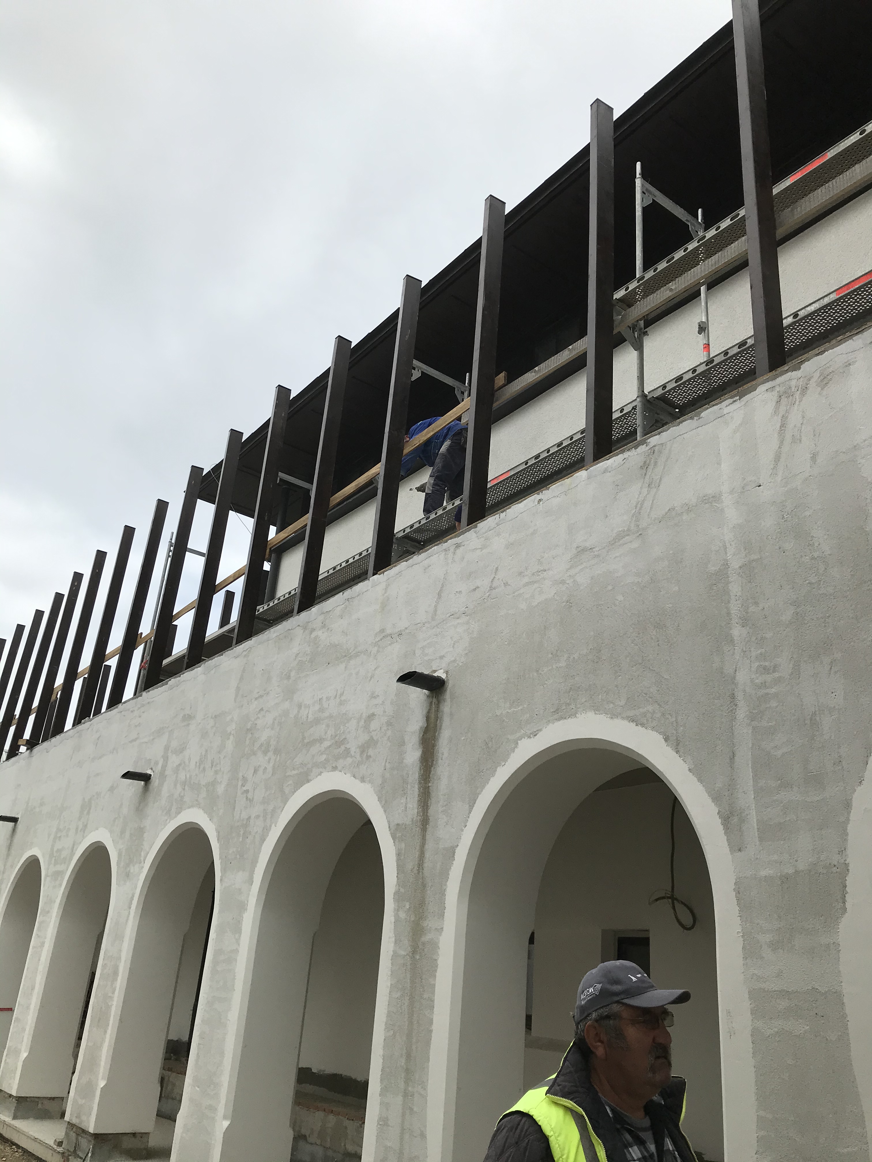 În luna aprilie s-au continuat, la interioare, lucrările de zidărie uscată şi finisaje; de asemenea, s-a continuat montarea parchetului în mai multe spaţii. La exterior, s-a lucrat la structura din lemn a porticului de legătură dintre corpurile de clădire B şi C, s-au efectuat lucrări de placare cu piatră pe coridoare, atât la interior cât şi la exterior.