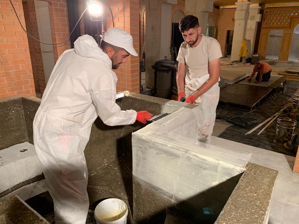 Din darul lui Dumnezeu, lucrările la Aşezământ au continuat cu bine, chiar dacă cu unele greutăţi cauzate de pandemie. Majoritatea constructorilor au ales să rămână pe şantier în ciuda crizei generale. La Sala Crucilor, s-a vopsit tavanul în auriu. În ambele clădiri s-au făcut ultimele lucrări de zidărie uscată şi s-a continuat cu finisajele. În băi s-a pus faianţa, iar afară s-au executat ultimele lucrări de canalizare.