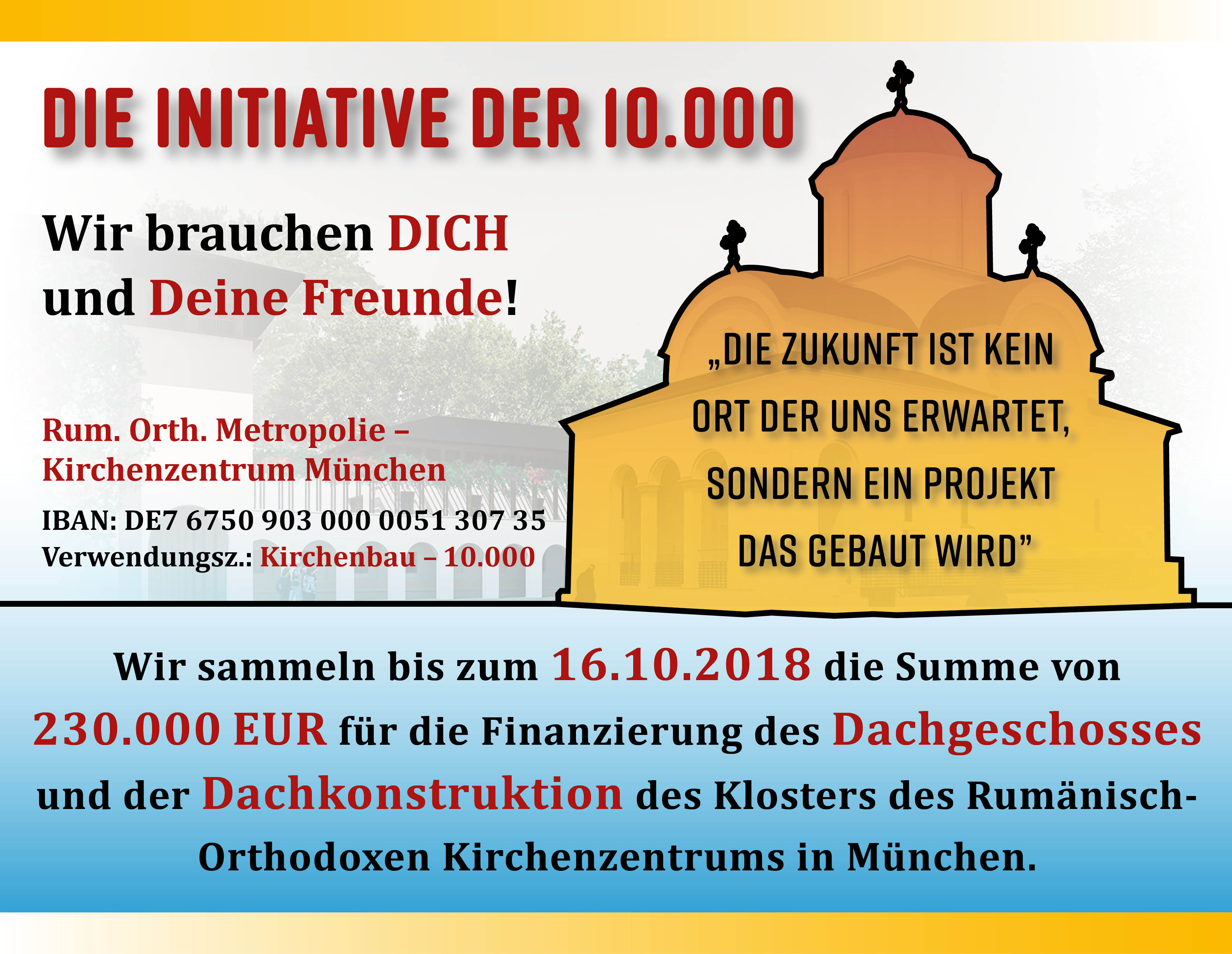 In Anbetracht der bisherigen Resultate der Initiative der 10.000 wie auch der Notwendigkeit, möglichst viele Unterstützer der Errichtung des Anwesens zu gewinnen, haben wir beschlossen, diese in mehreren Etappen auszuweiten. Die folgende Etappe wird die Zeitspanne 17. August – 16. Oktober 2018 umfassen und wird als Ziel die Einsammlung des Betrags von 230.000 €, die die Finanzierung des Dachgeschoßes und der Dachkonstruktion des Klosters darstellen. Wir wünschen uns die Beteiligung möglichst vieler Spender, damit die Last nicht auch auf die Schultern derer fällt, die bis jetzt schon gespendet haben.