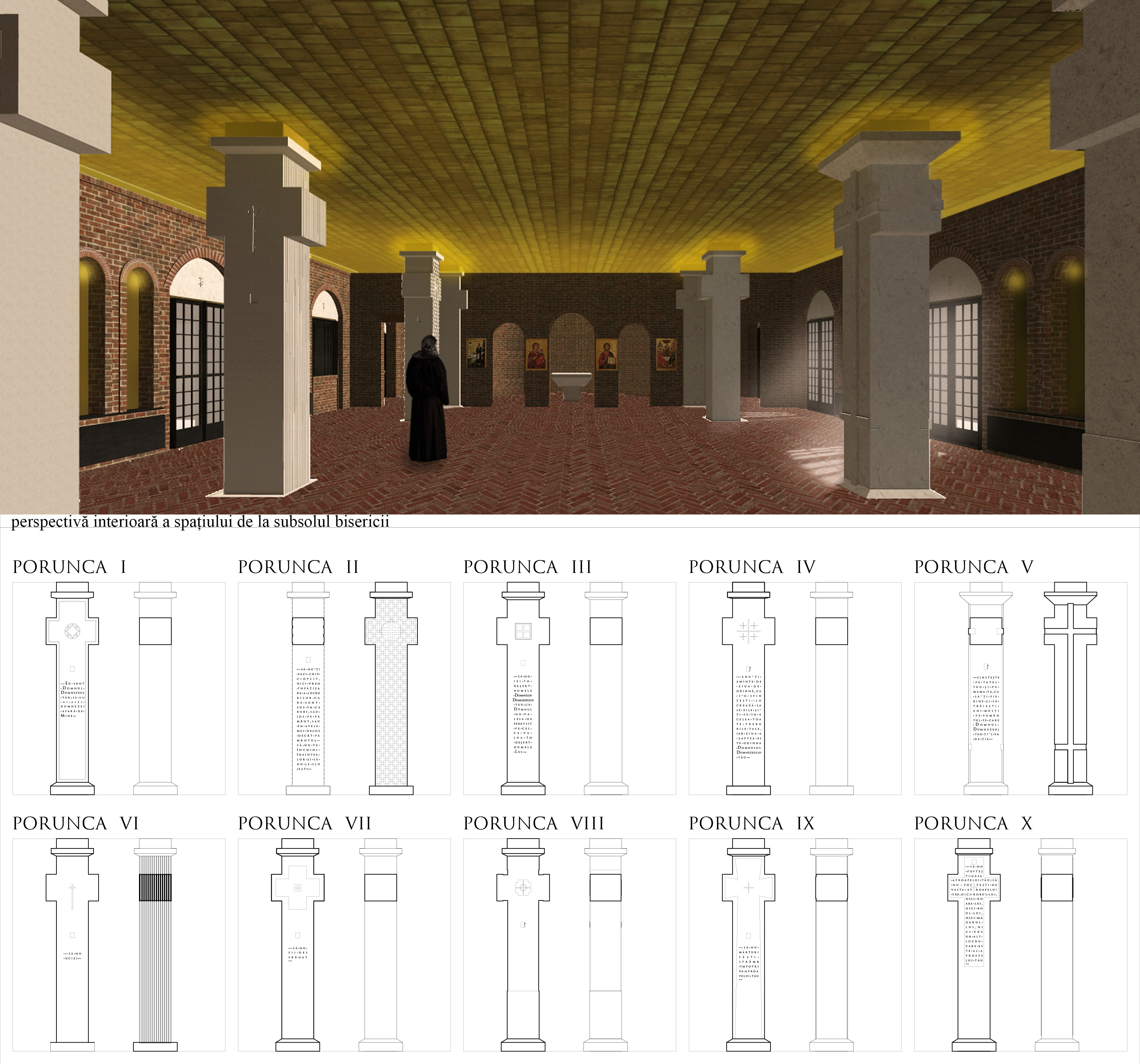 In Anbetracht dessen, dass die im Bau sich befindliche Kirche als Haupt-Patrozinium das Fest der Erhöhung des Heiligen Kreuzes am 14. September haben wird, dessen Bedeutung uns immer daran erinnern soll, dass wir berufen sind, das Kreuz unserer eigenen Identität auf uns zu nehmen, haben unsere Architekten auch die Säulen im Untergeschoß der Kirche, die das gesamte Gebäude tragen, in Kreuzform entworfen. Diese Säulen, die wir um gestiftet zu werden bieten, stellen ein besonderes Werk in sich dar, da auf jeder von ihnen der Wortlaut eines der 10 Gebote des Dekalogs eingeschrieben, sowie Kreuze und andere christliche Sinnbilder angebracht werden. Auf diese Weise wird verdeutlicht, dass das Neue Testament auf dem Alten Testament aufbaut, so wie die Kirche von den kreuzförmigen Säulen des Untergeschoßes getragen wird, die selbst ihren Unterbau und ihr Tragwerk darstellen.