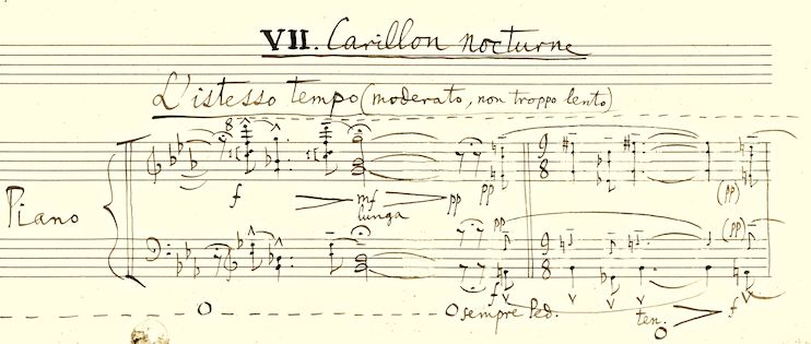 George Enescu, Carillon nocturne, primele măsuri ale manuscrisului aflat în arhiva Bibliotecii Academiei Române.