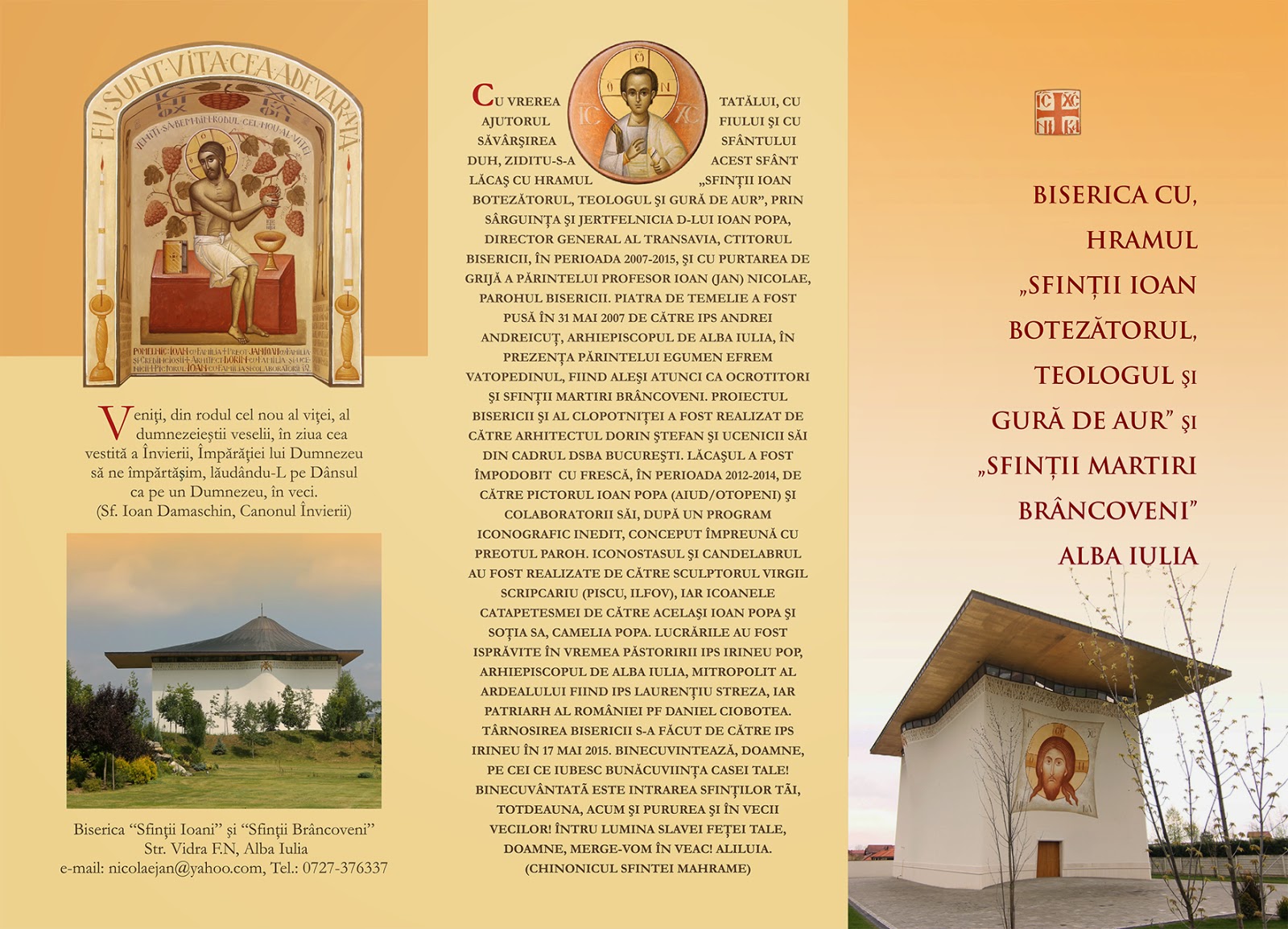 Biserica „Sfinții Mucenici Brâncoveni și Sfinții Ioani“ de la Alba Iulia (Cartier Nou II/Micești) ilustrează acele cazuri, rare, de aliniere aproape perfectă a astrelor: paroh luminat, ierarh încrezător, ctitor răbdător și artiști inspirați. Iar prin artiști înțelegem arhitectul, pictorul, sculptorul și pe toți aceia care, prin munca lor, au desăvîrșit una dintre cele mai spectaculoase reinterpretări actuale ale spațiului sacru ortodox. Pornind de la exterior spre interior, biserica se oferă privirii, deja de la distanță, cu monumentalitatea construcției sigure pe sine. Nimic nu a fost lăsat la voia întîmplării, impresia de întreg, de ceva-care-nu-putea-fi-altfel dominînd de la bun început.