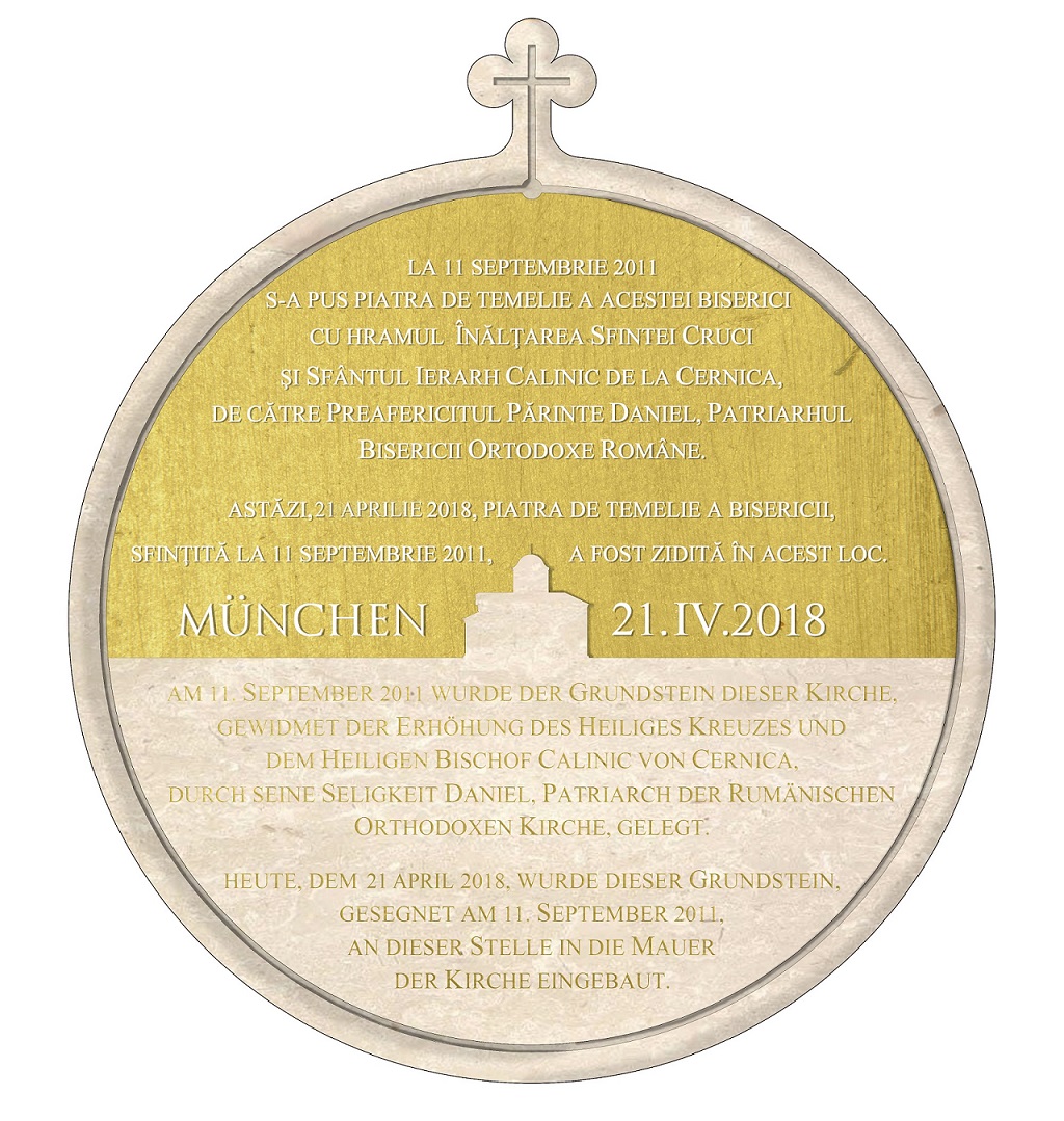 Wir erinnern daran, dass wir am 11. September 2011 die Ehre und den Segen hatten, dass der Selige Vater Daniel, Patriarch der Rumänischen Orthodoxen Kirche, umgeben von mehreren Bischöfen, Pfarren und Diakonen, unter Teilnahme zahlreicher offizieller Vertreter des Landes Bayern und Deutschlands und einer großen Zahl von Gläubigen aus unserer Metropolie, den Gottesdienst der Grundsteinlegung zelebrierte.1. April 2018 wird der von seiner Seligkeit gesegnete Grundstein, zusammen mit der Urkunde, die das seinerzeitige Ereignis festhält, in das Mauerwerk der mittleren Apsis der Kirche eingelegt.