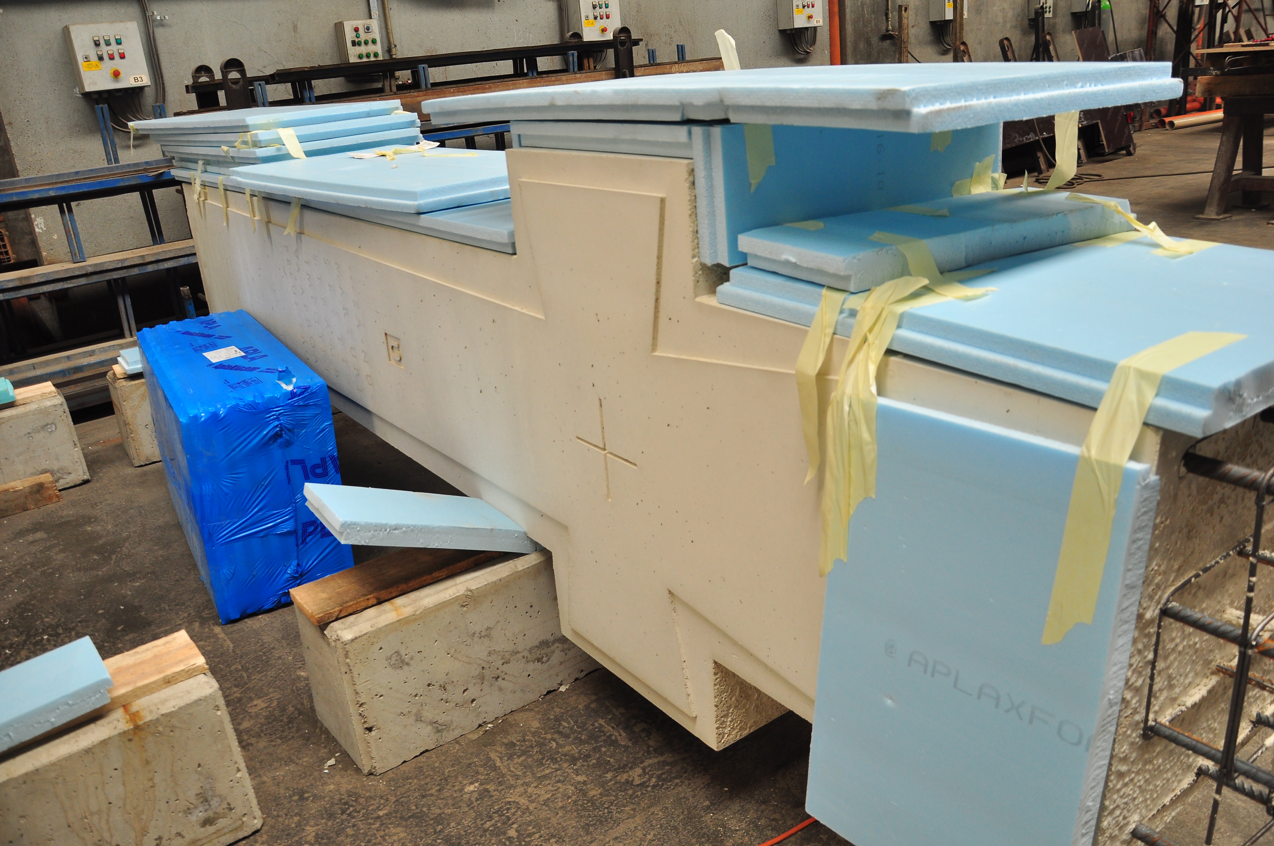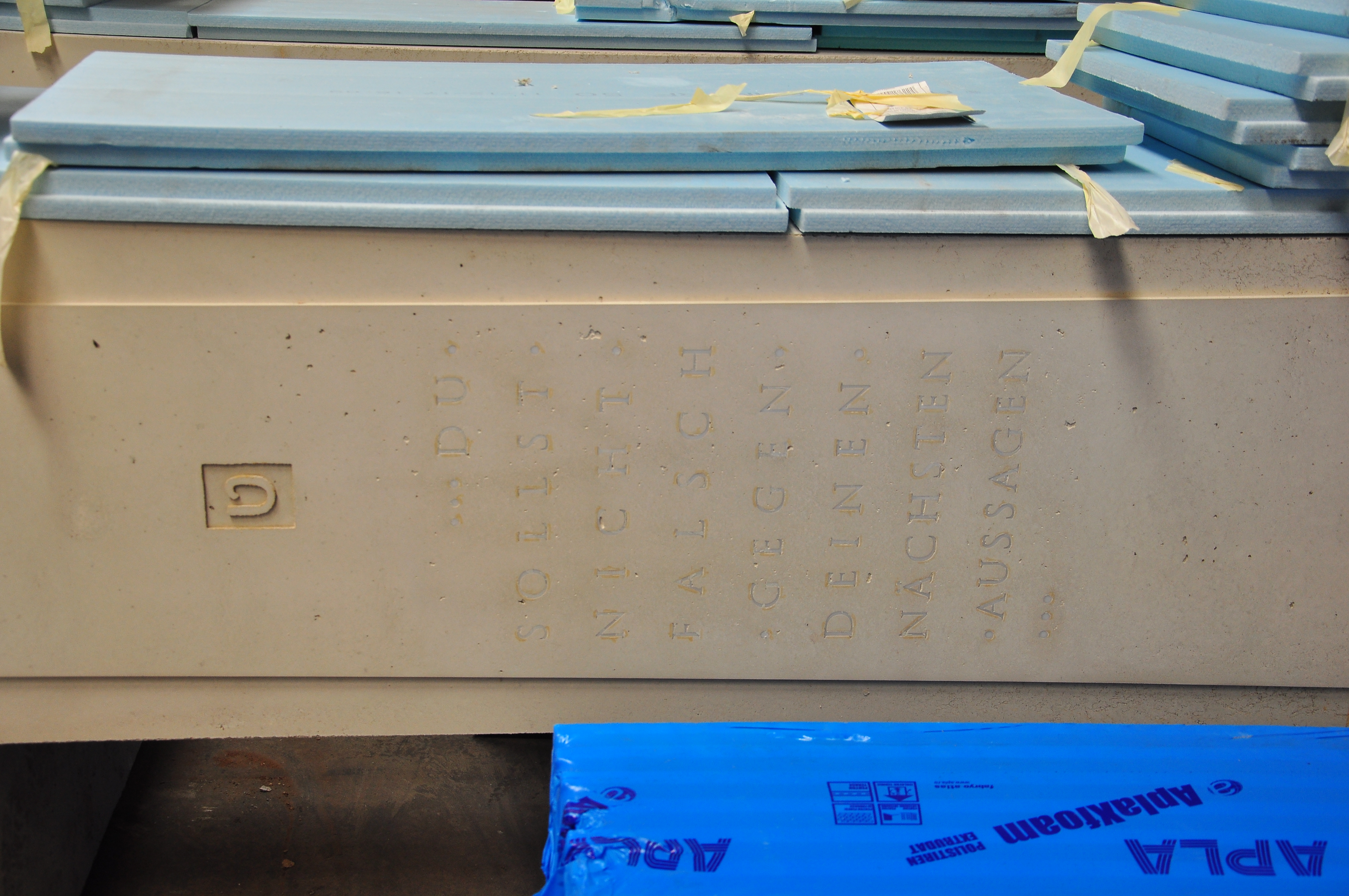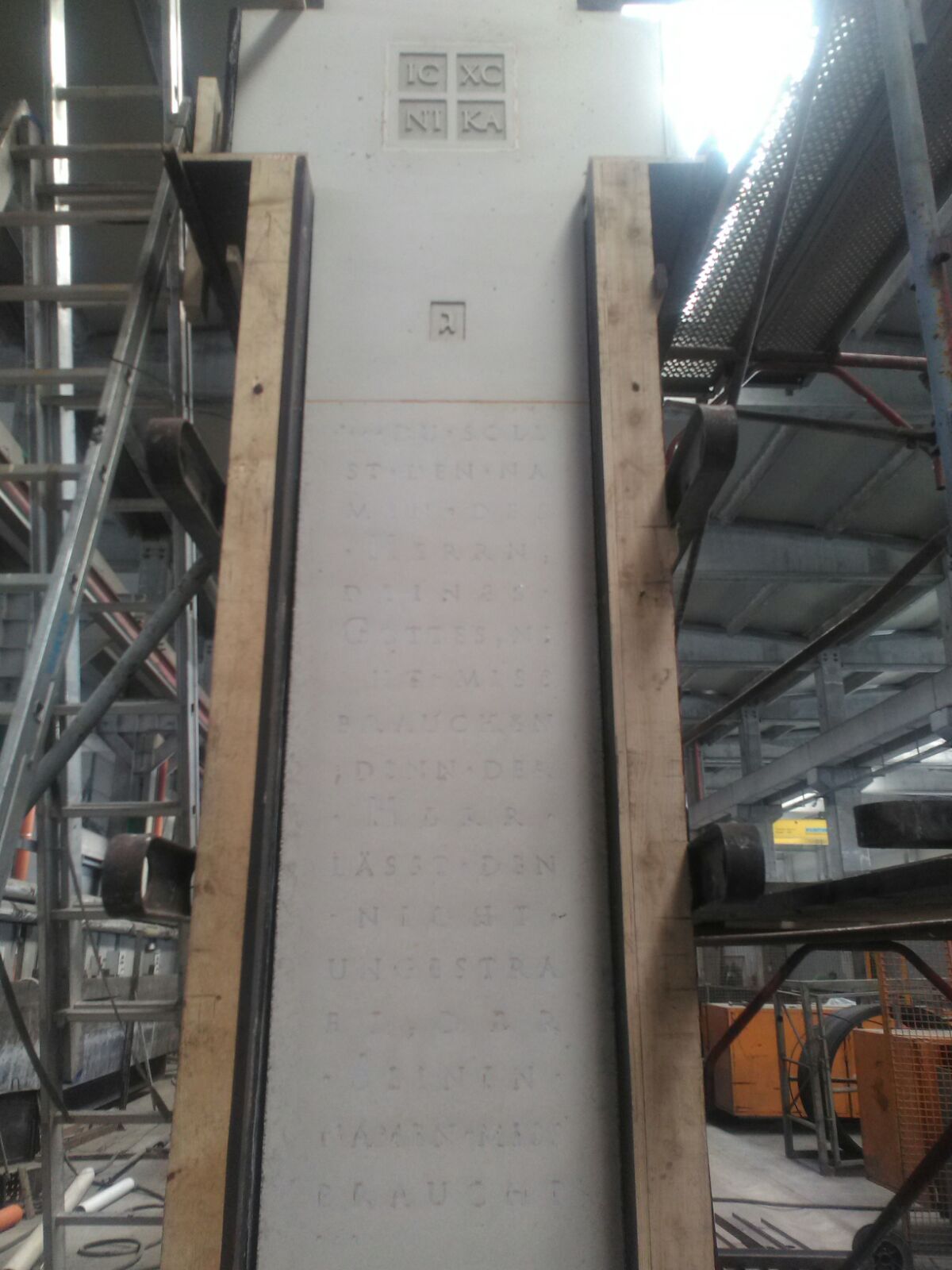 Gegenwärtig werden die kreuzförmigen Säulen in Bukarest gegossen, woher sie anschließend zur Baustelle transportiert werden, um an ihren Bestimmungsplätzen eingebaut zu werden. Es handelt sich dabei um eine sehr anspruchsvolle Arbeit, wenn wir nur die Tatsache bedenken, dass die 10 Gebote in deutscher und rumänischer Sprache insgesamt ungefähr 10.000 Einzelzeichen umfassen. Jeder Buchstabe muss individuell bearbeitet werden, mit besonderer Aufmerksamkeit in Bezug sowohl auf die Verschalung der Säulen als auch auf die Betonage und die Entfernung der Schalung, da der eingelassene Wortlaut intakt bleiben muss. Diese Aufmerksamkeit ist auch nachträglich, während des Transports und der Einsetzung der Säulen ins Werk, erforderlich. Der Herstellungs-, Transport- und Einbaupreis einer dieser Säulen wurde mit 9.300,- EUR kalkuliert.