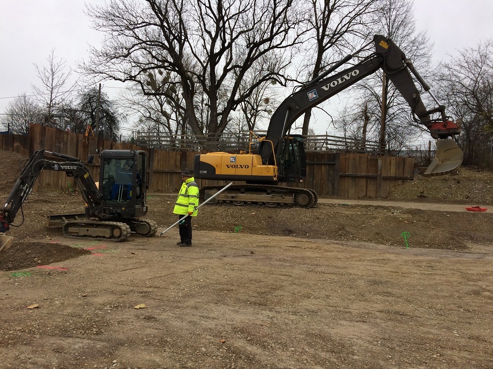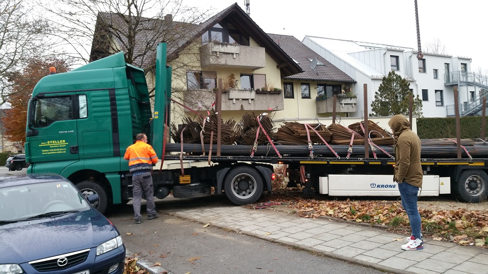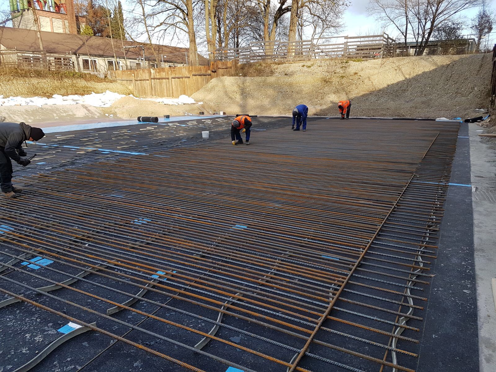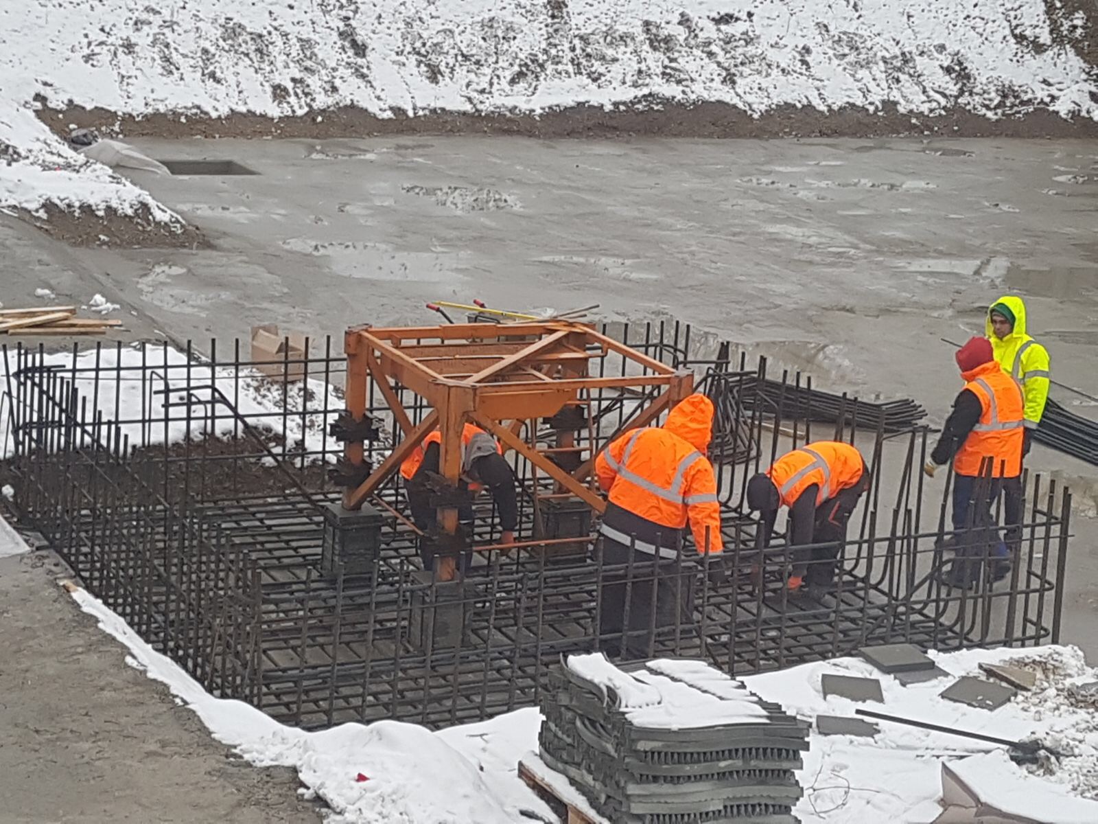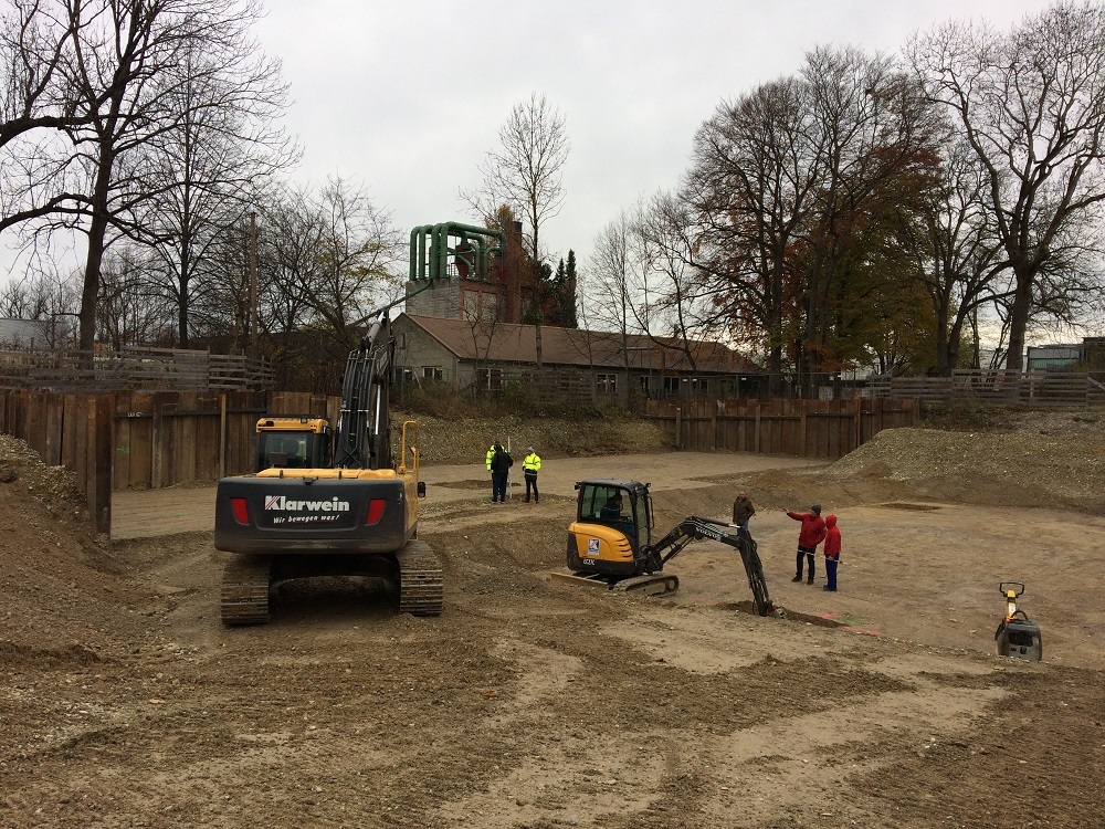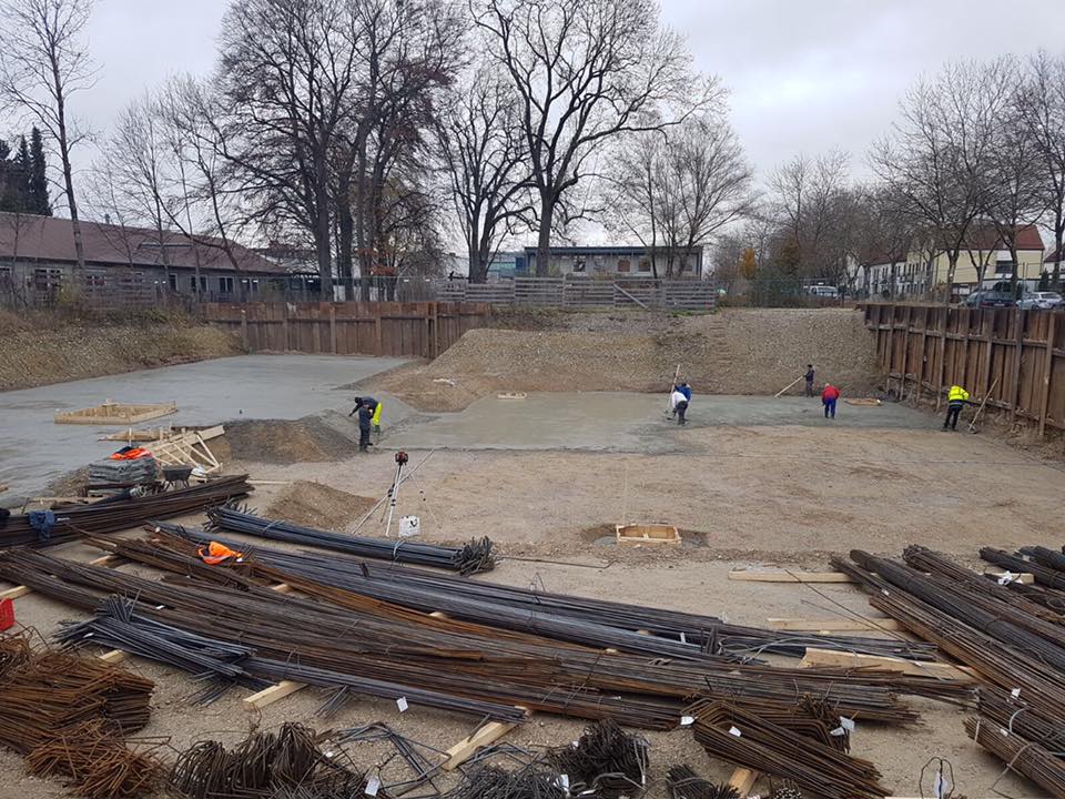 In den nächsten Tagen wird das Erdungsnetz montiert und die Sauberkeitsschicht eingebracht. Es folgen die Feuchtigkeits-Abdichtungsarbeiten. Anschließend wird die Schalung aufgestellt, die Bewehrung verlegt und die Bodenplatten – wenn die Witterungsverhältnisse es erlauben - bis zum 20.12.2017 gegossen.