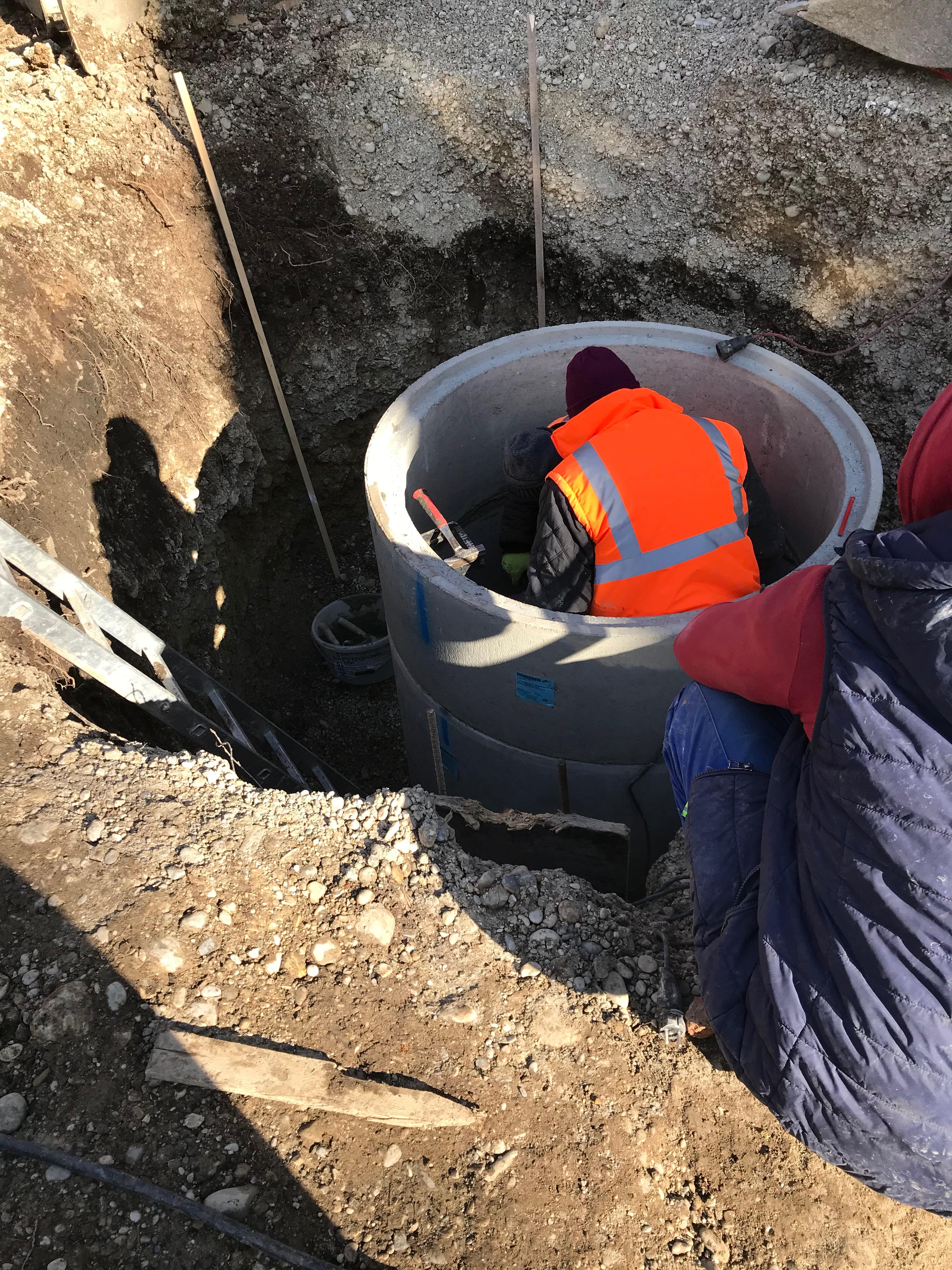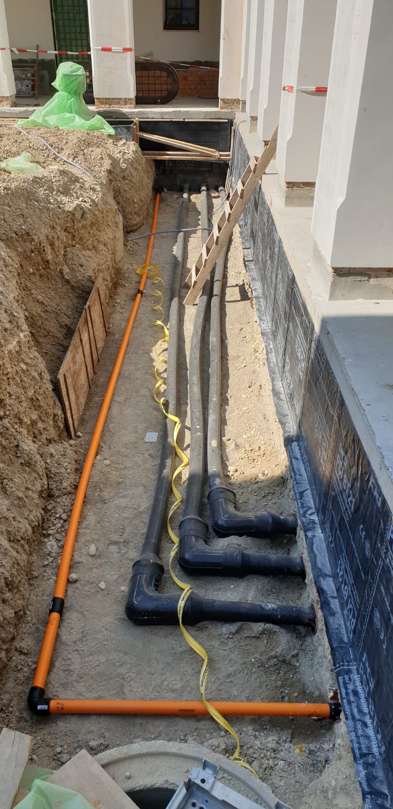 Als Fortsetzung der Außenarbeiten folgten die Wasser - und Abwasser-Leitungen, die Gas und Strom Leitungen, die Verbindungen zwischen den drei Gebäuden, als auch der Anschluss an das städtische Wasser- und Gasnetz.