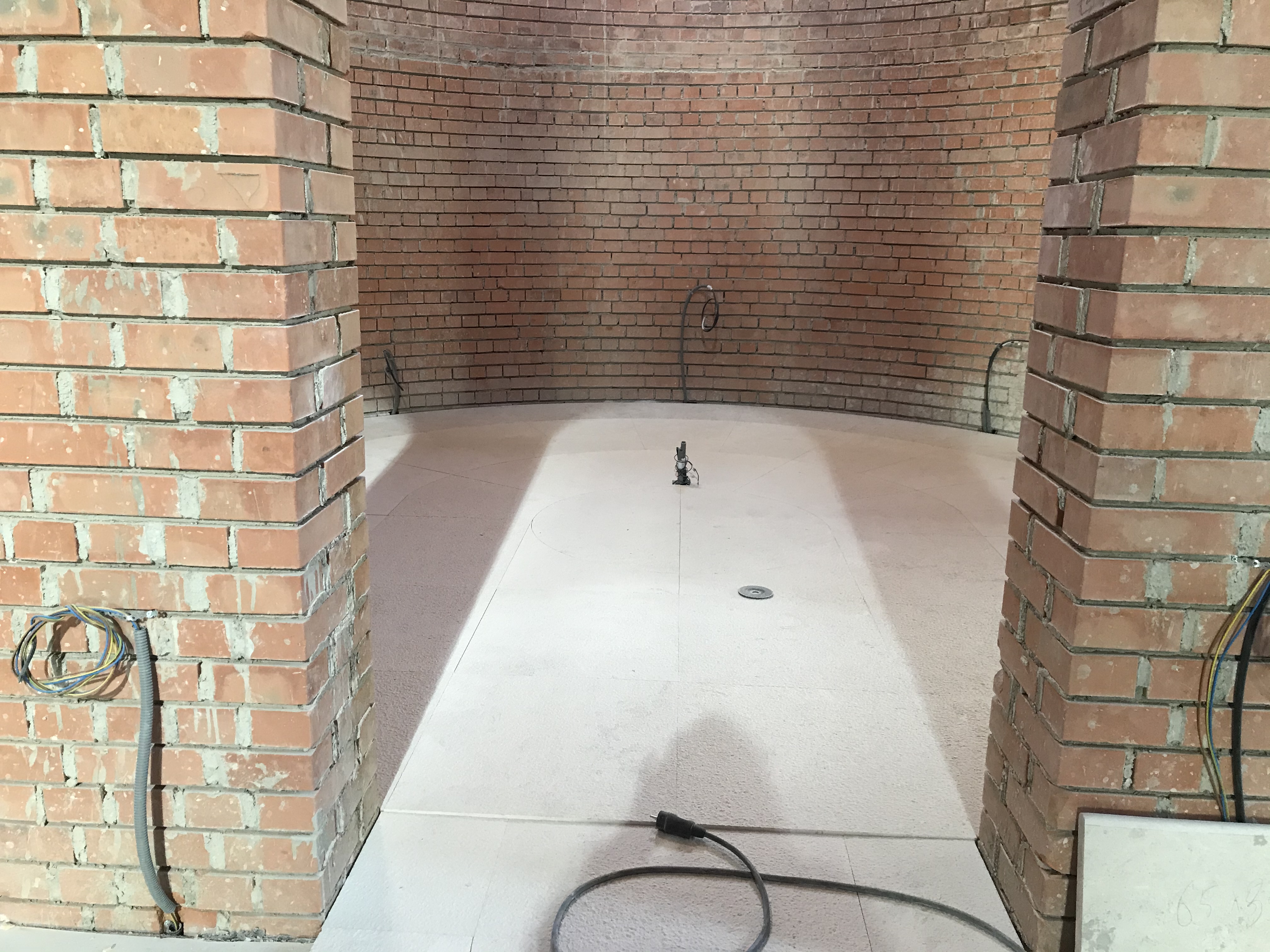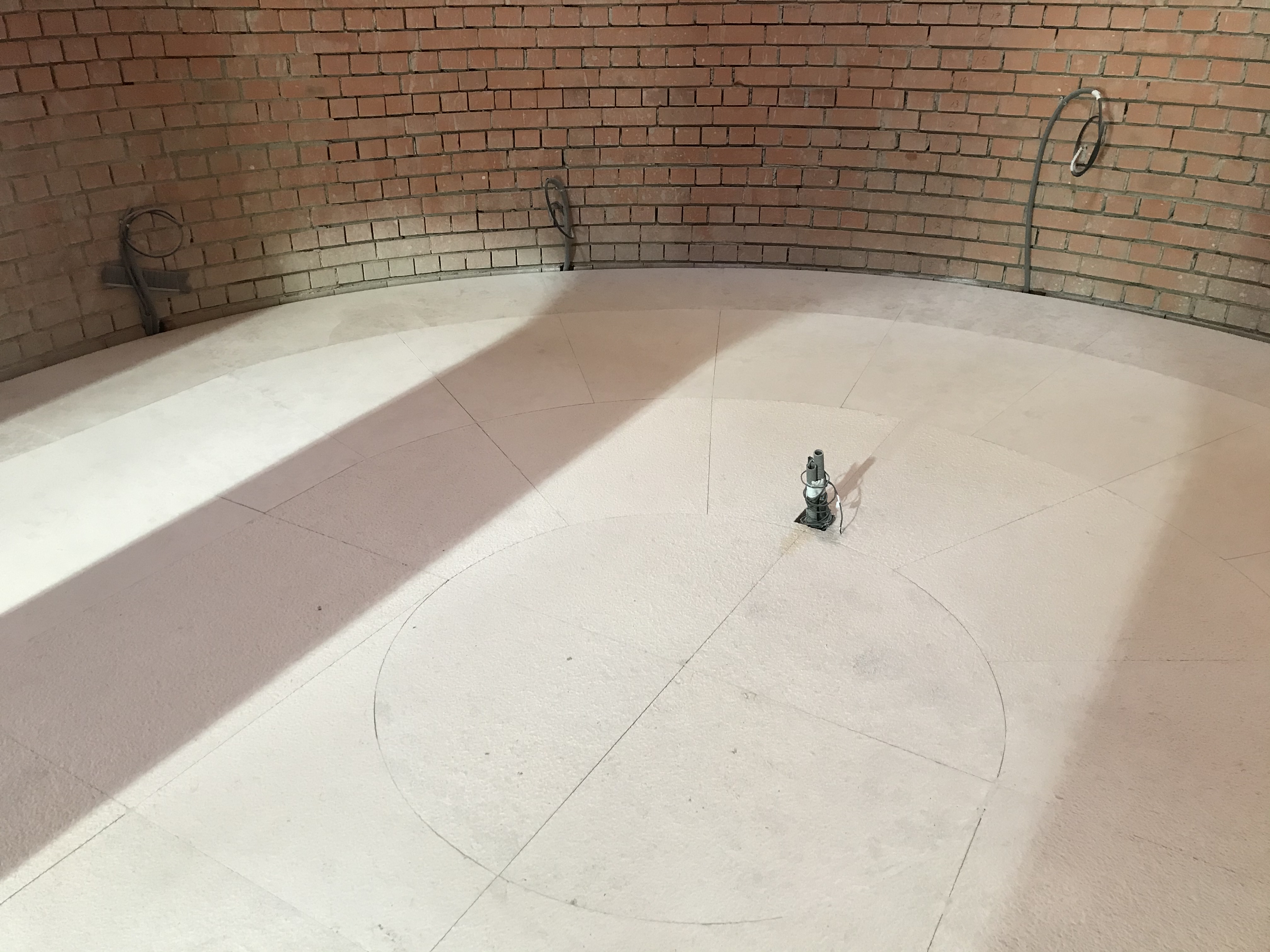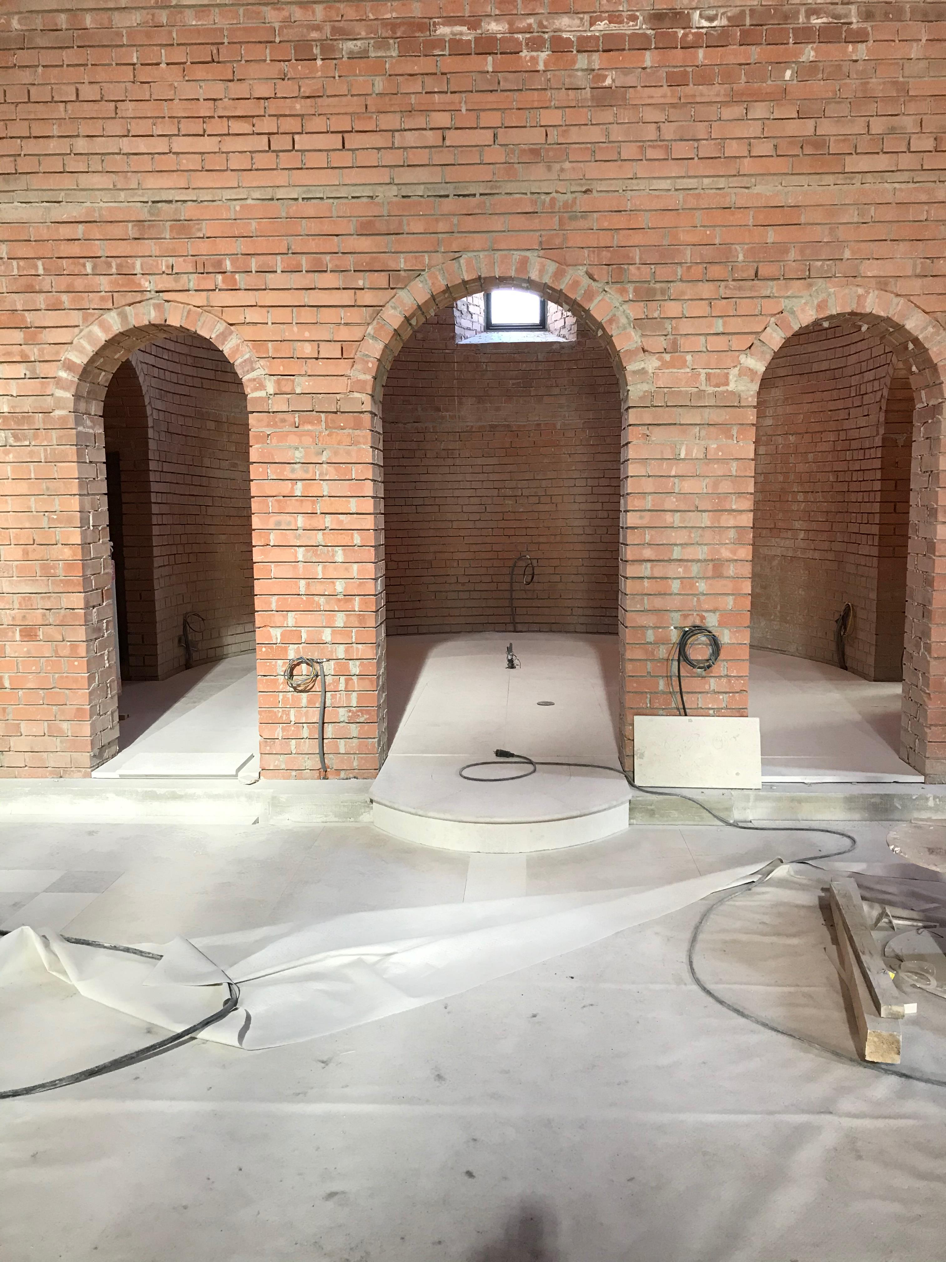 Im Kreuzsaal wurden zuerst die Feinarbeiten an den Fugen der Ziegel erledigt, dann wurden die Ziegel gesäubert; Anfang April wurde die Decke mit Goldbronze gestrichen. Weiterhin wurde die Beton – Struktur des Baptisteriums an der westlichen Seite des Kreuzsaals bewerkstelligt. Dort wurde auch vor ein paar Tagen mit der Verlegung des Ziegelbodens begonnen.